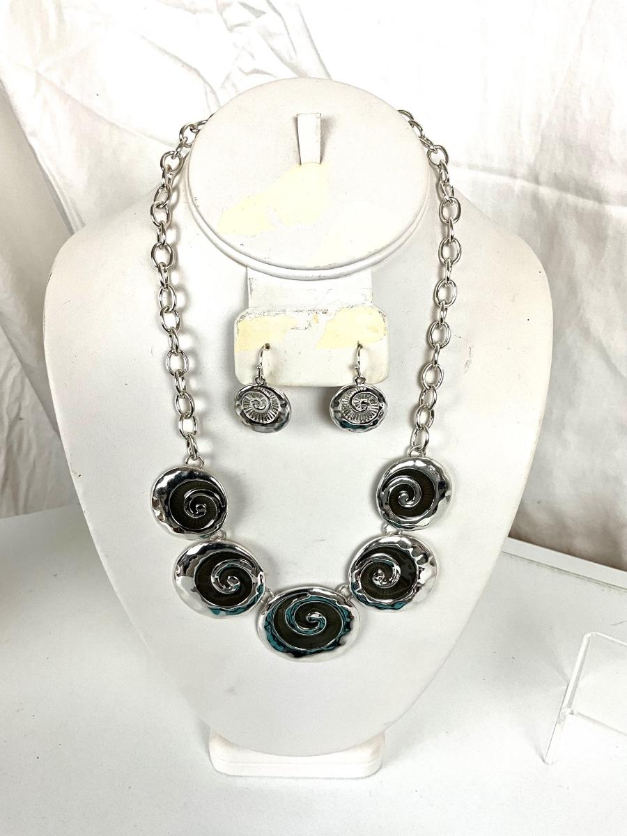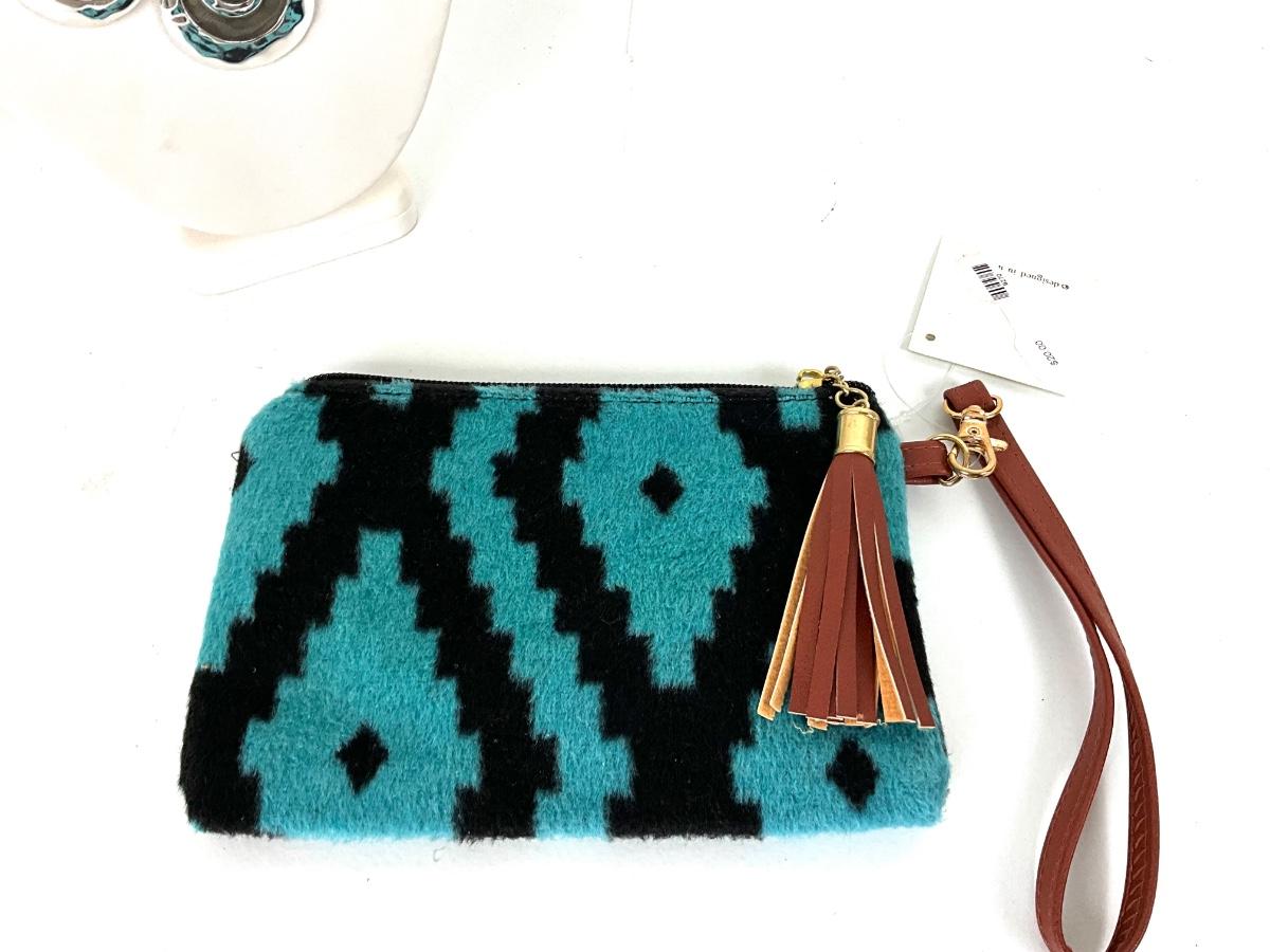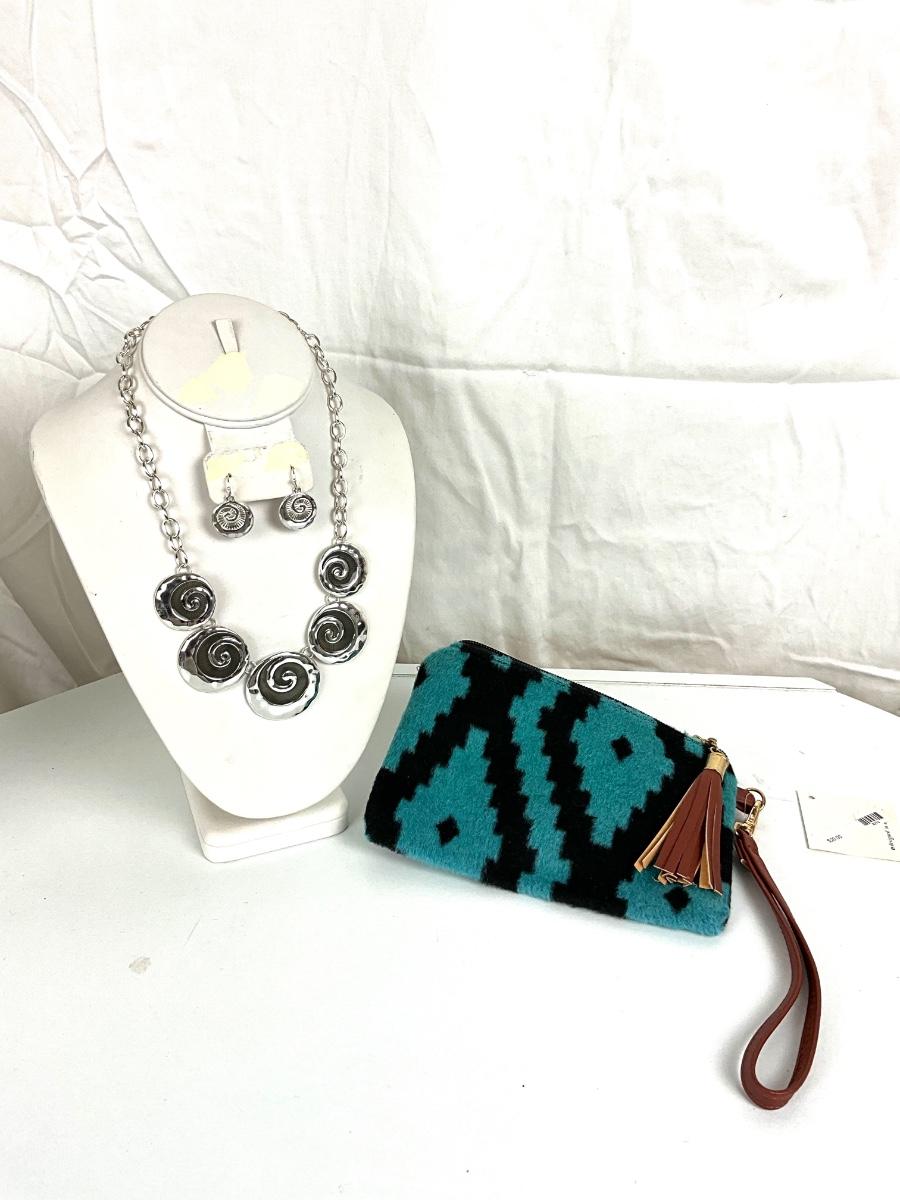 171 Turquoise and Black Aztec Clutch with Silver tone Necklace and Matching Earring Set