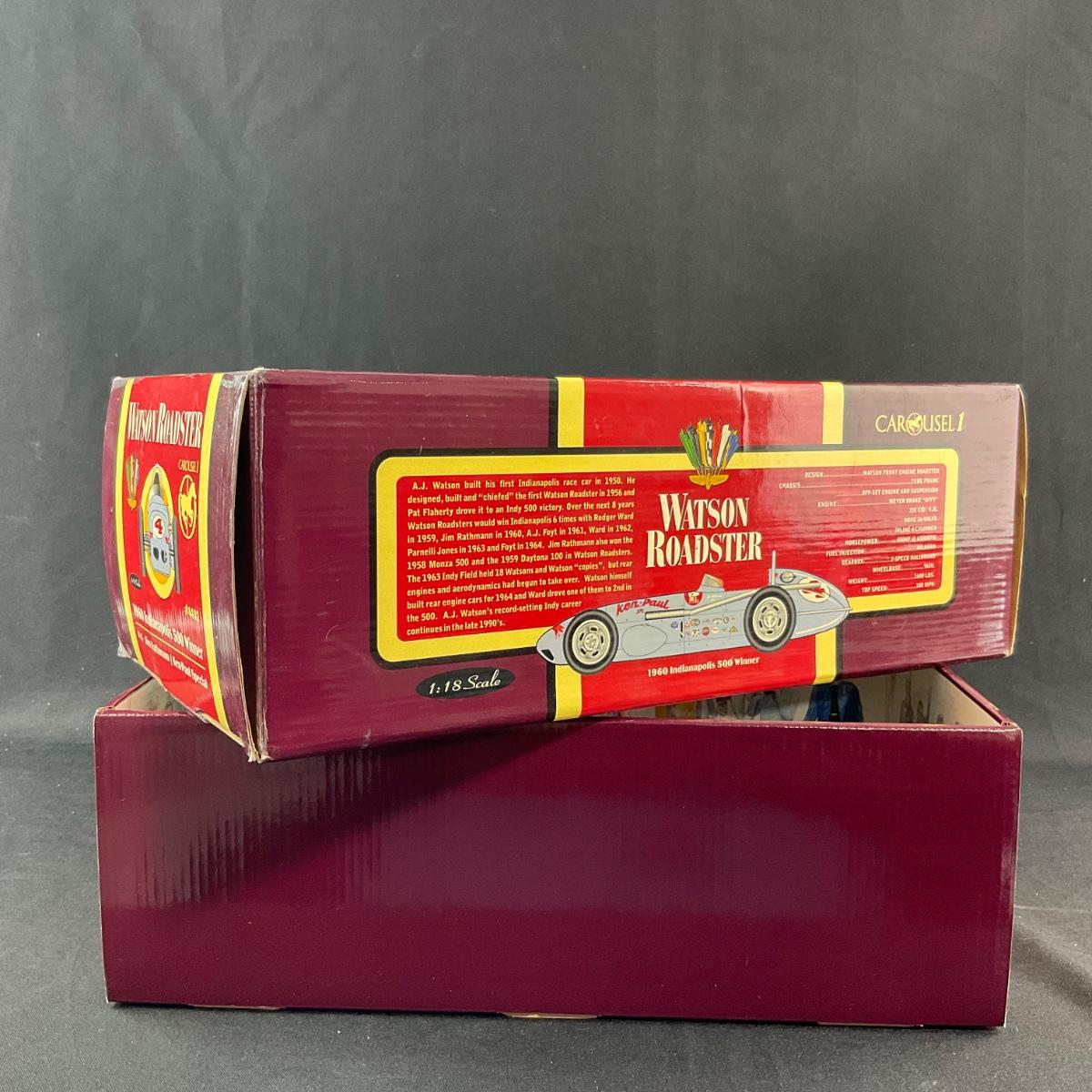 One 1:18 scale die cast 1960 Indianapolis 500 winner Watson roadster #4 Jim Rathmann. Please see photos for details and condition. Any condition statement is given as a courtesy to a client, is an opinion, and should not be treated as a statement of fact. Reference to condition written, oral or within a condition report shall not be regarded as a full account of condition and may not include all defects, alterations, or restorations. Absence of a condition report does not imply a lot is flawless or lacking imperfections or damage. Katherine’s Auction & Appraisal Service shall have no responsibility for any error or omission. Returns shall not be accepted on the basis of condition.