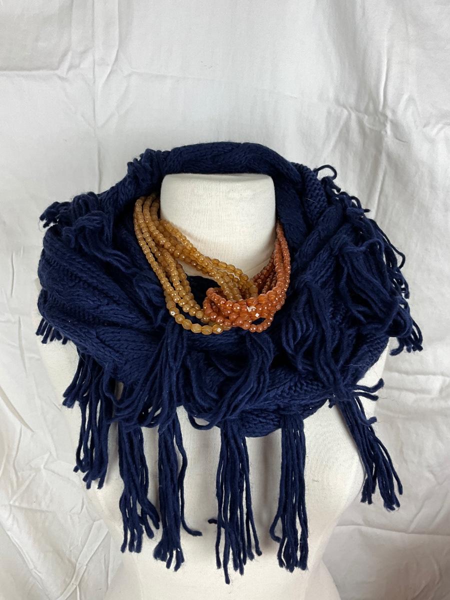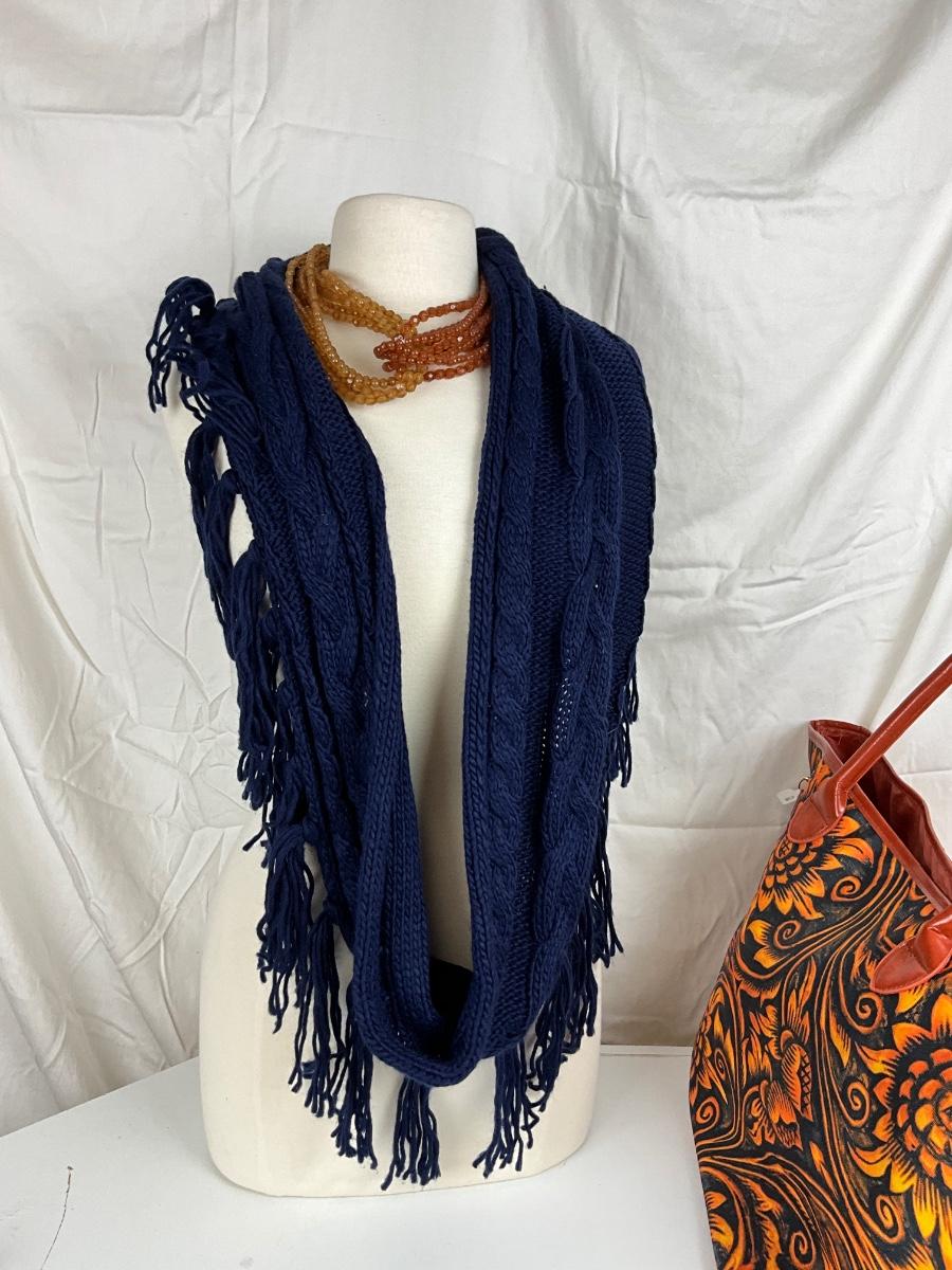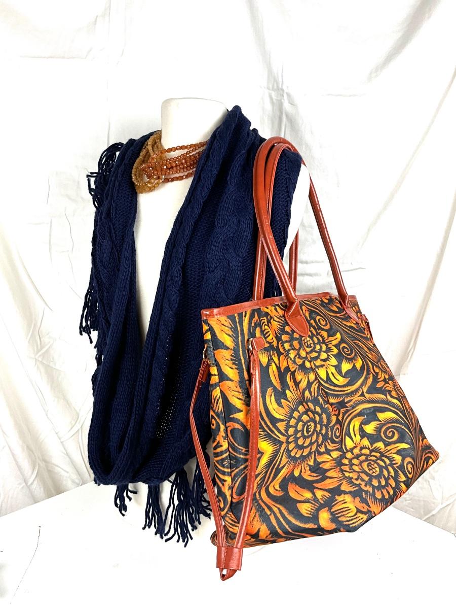 172 Dark Blue and Yellow Sunflower Tote with Knit Scarf and Orange Beaded Necklace