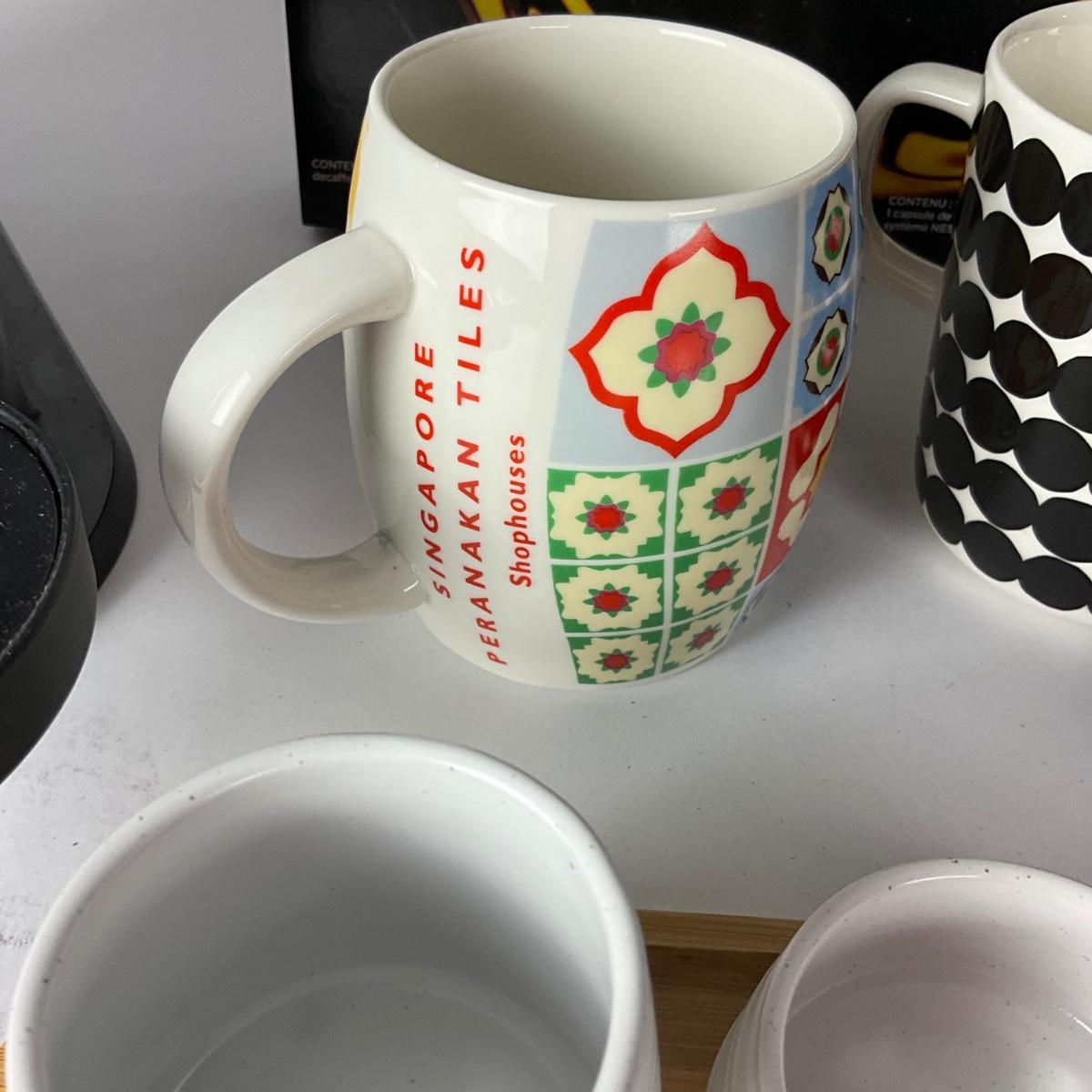 Two coffee mugs (black and white) Merrimeko with manuals and two pods