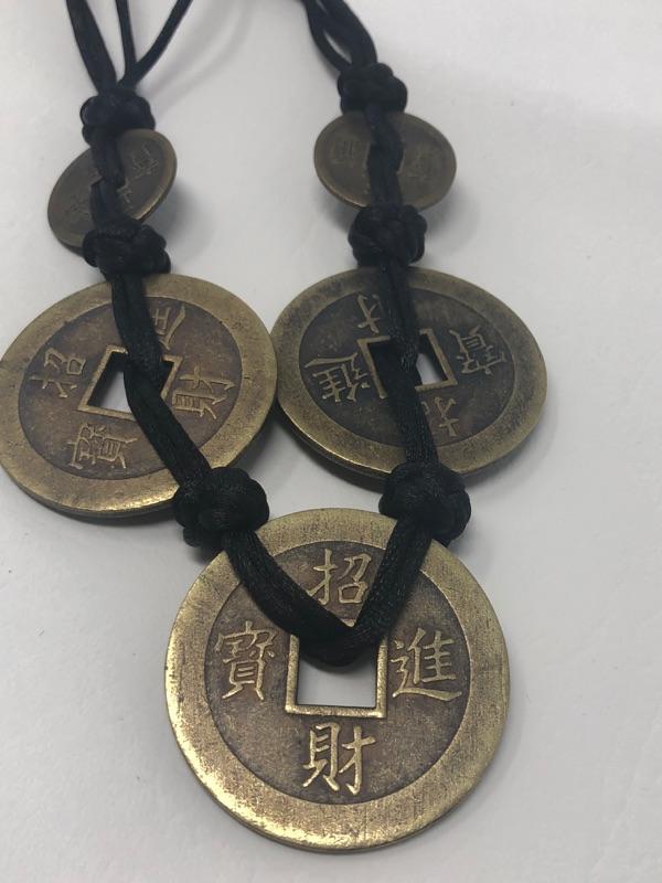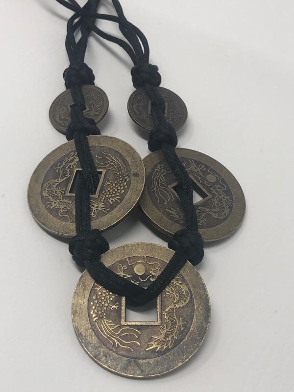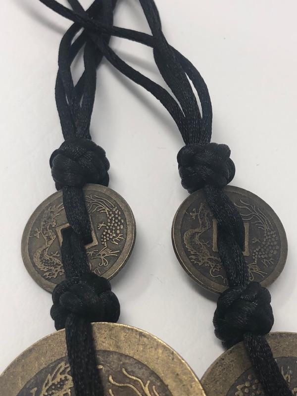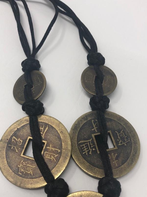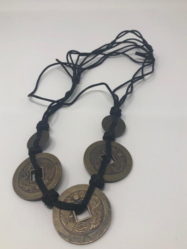 Five Brass Chinese Coin Necklace on Kotted Black Cloth Strand