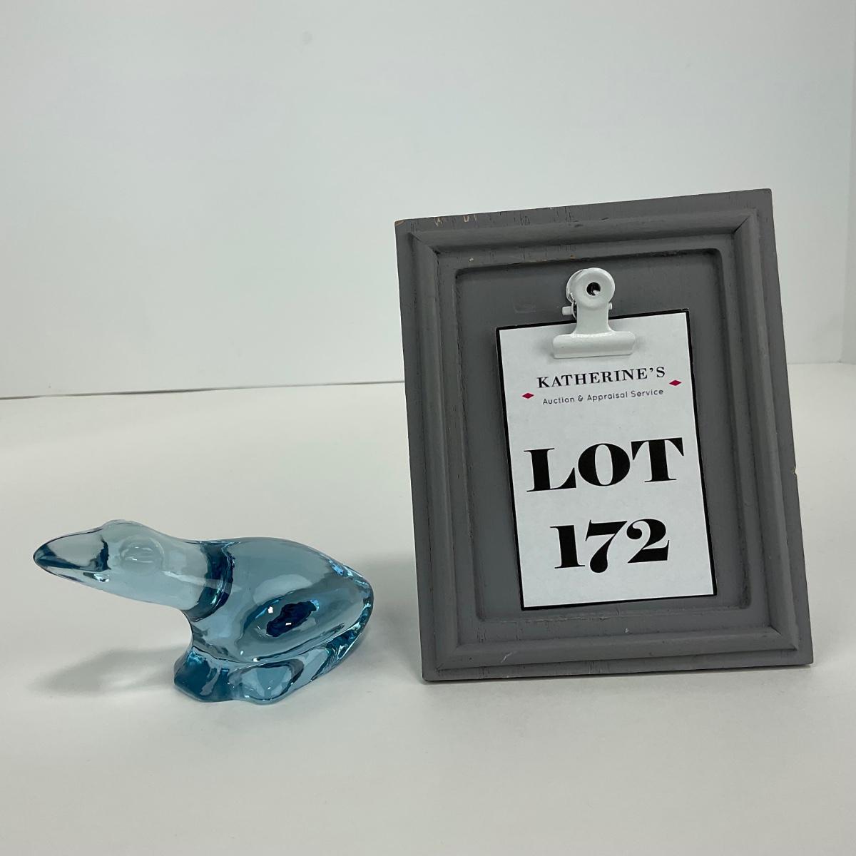 One marked Fostoria light blue frog figure. This piece has no damage, and appears to be in great shape with no visable chips, cracks, or broken pieces. Please see photos for details and condition. Any condition statement is given as a courtesy to a client, is an opinion, and should not be treated as a statement of fact. Reference to condition written, oral or within a condition report shall not be regarded as a full account of condition and may not include all defects, alterations, or restorations. Absence of a condition report does not imply a lot is flawless or lacking imperfections or damage. Katherine’s Auction & Appraisal Service shall have no responsibility for any error or omission. Returns shall not be accepted on the basis of condition. ::: Shipping is available on this lot. If you require shipping you must let us know at the close of the auction. We will coordinate with you after the item has been won. Shipping fees will include insurance up to or exceeding the value of all items being mailed. If you have any questions regarding this lot please contact the auctioneer either via this website, by direct email or by phone. PICK UP TIMES and other important information can be found in the TERMS and DESCRIPTION of the auction. Please take a look for pertinent information. Thanks!