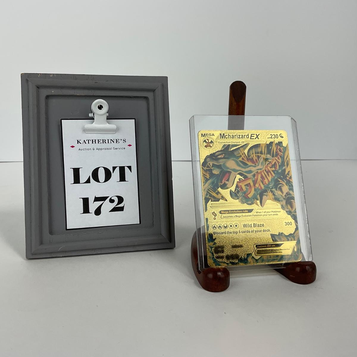 One Pokémon gold foil Charizard card in plastic sleeve. Please see photos for details and condition. ::: Shipping is available on this lot. If you require shipping you must let us know at the close of the auction. We will coordinate with you after the item has been won. Shipping fees will include insurance up to or exceeding the value of all items being mailed. If you have any questions regarding this lot please contact the auctioneer either via this website, by direct email or by phone. PICK UP TIMES and other important information can be found in the TERMS and DESCRIPTION of the auction. Please take a look for pertinent information. Thanks!