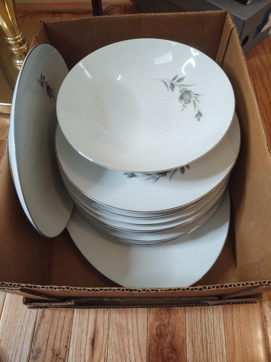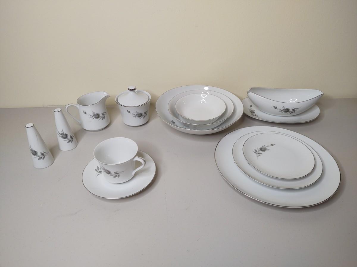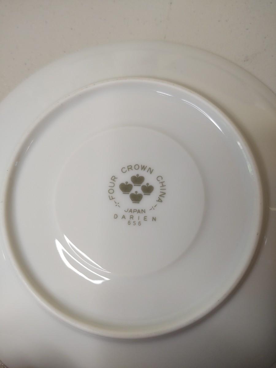 Japanese Four Crown China appears to be a service for 12 set. Includes table contents as well as 3 more boxes pictured. The salt shaker has a chip in it. We unwrapped the entire set and this was the only damaged piece that we found, but you are buying this lot As-Is with no guarantees.
