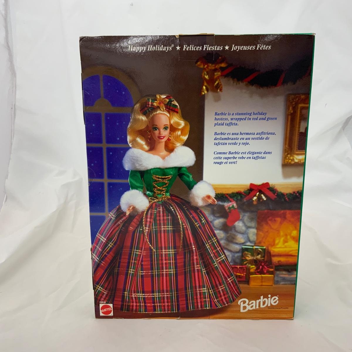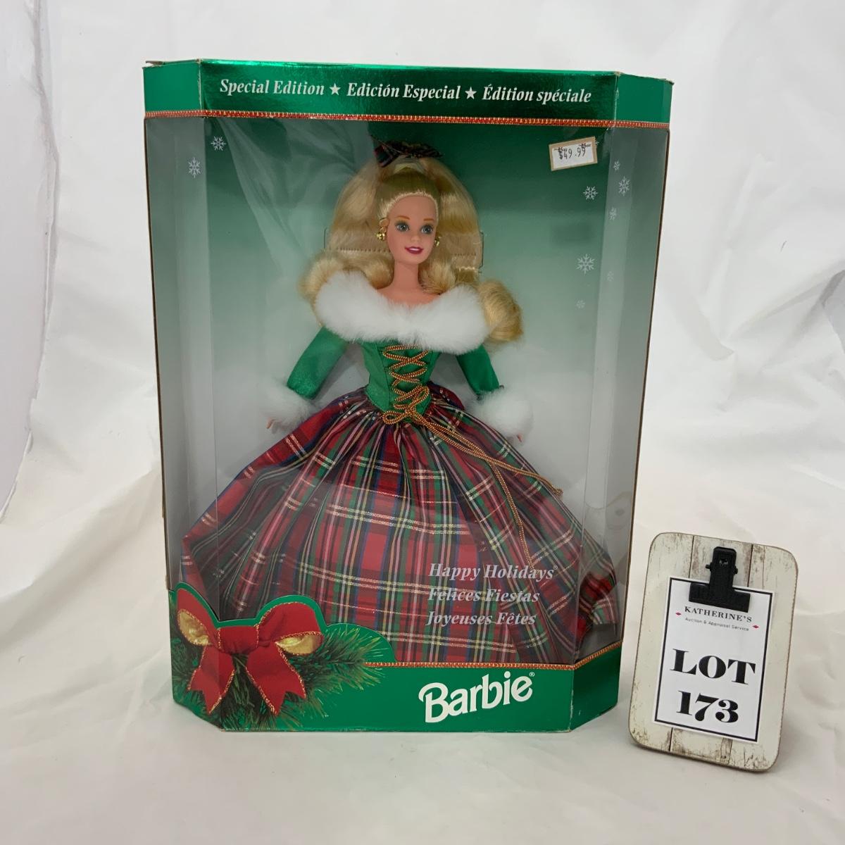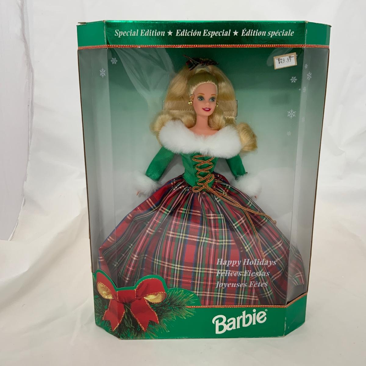 Happy Holidays Barbie, from 1995. This doll looks very similar to previous lots, but the packaging is slightly different, omitting the word Gala from the front plastic. Please see photos for details and condition. !!! Proceeds from this auction will be donated to the NEW COMMUNITY SHELTER in Green Bay, Wisconsin. Please see Sale Description to the Left for more information. !!! ::: Shipping is available on this lot. If you require shipping you must let us know at the close of the auction. We will coordinate with you after the item has been won. Shipping fees will include insurance up to or exceeding the value of all items being mailed. If you have any questions regarding this lot please contact the auctioneer either via this website, by direct email or by phone. PICK UP TIMES and other important information can be found in the TERMS and DESCRIPTION of the auction. Please take a look for pertinent information. Thanks!
