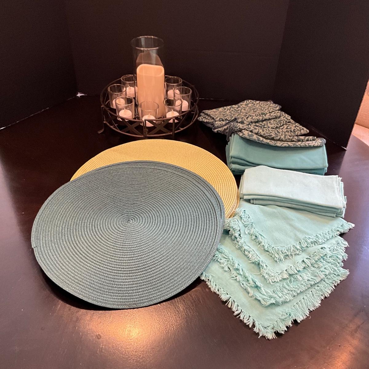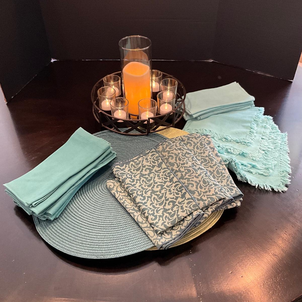 173 Lot of Aqua Blue Place Mats with Napkins and Glass Candle Decor
