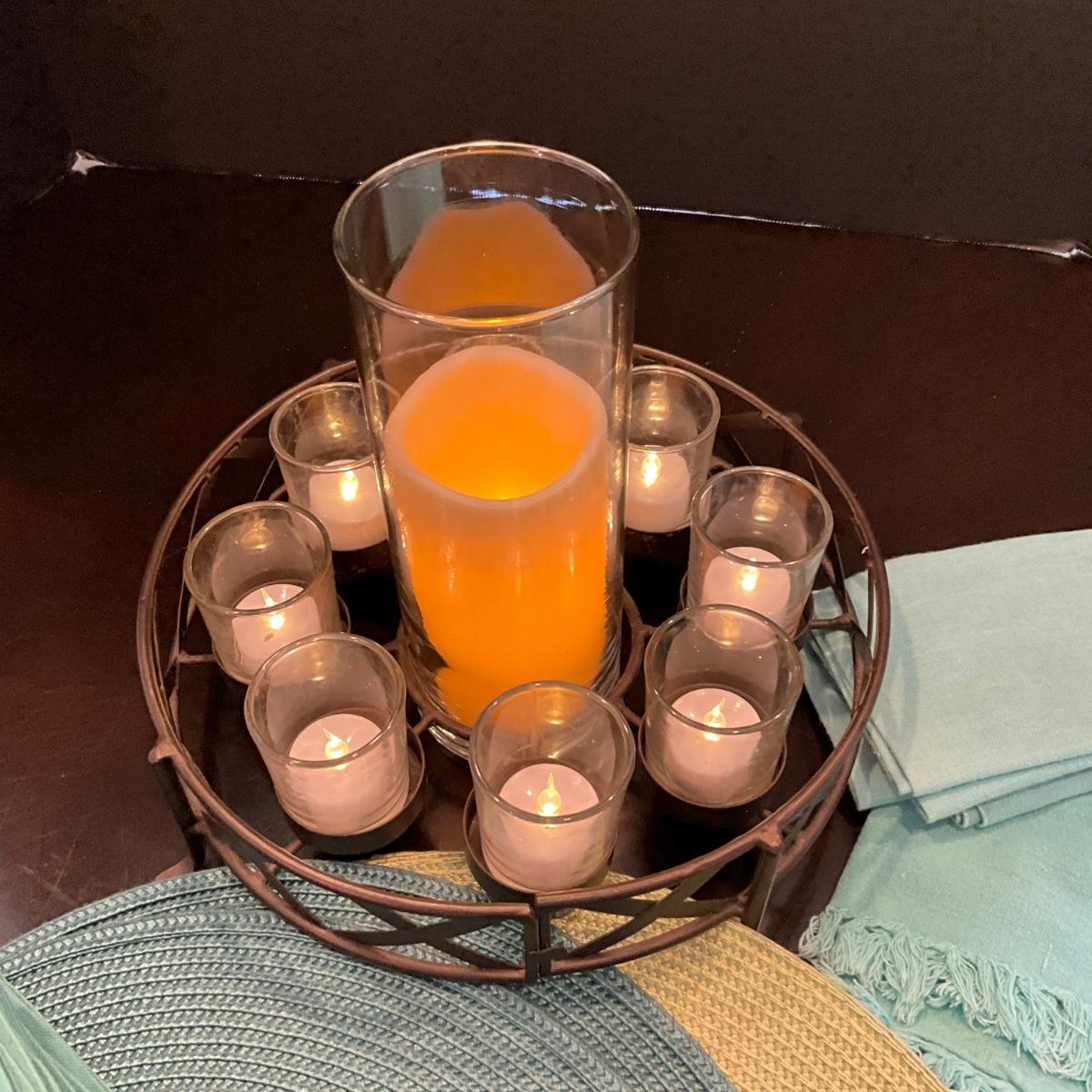 Candles are battery operated with glass holders and metal base. Comes with aqua blue and yellow placemats and cotton napkins
