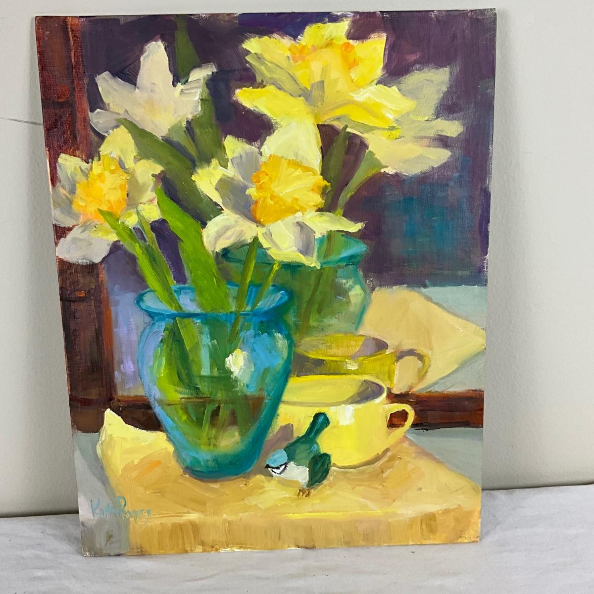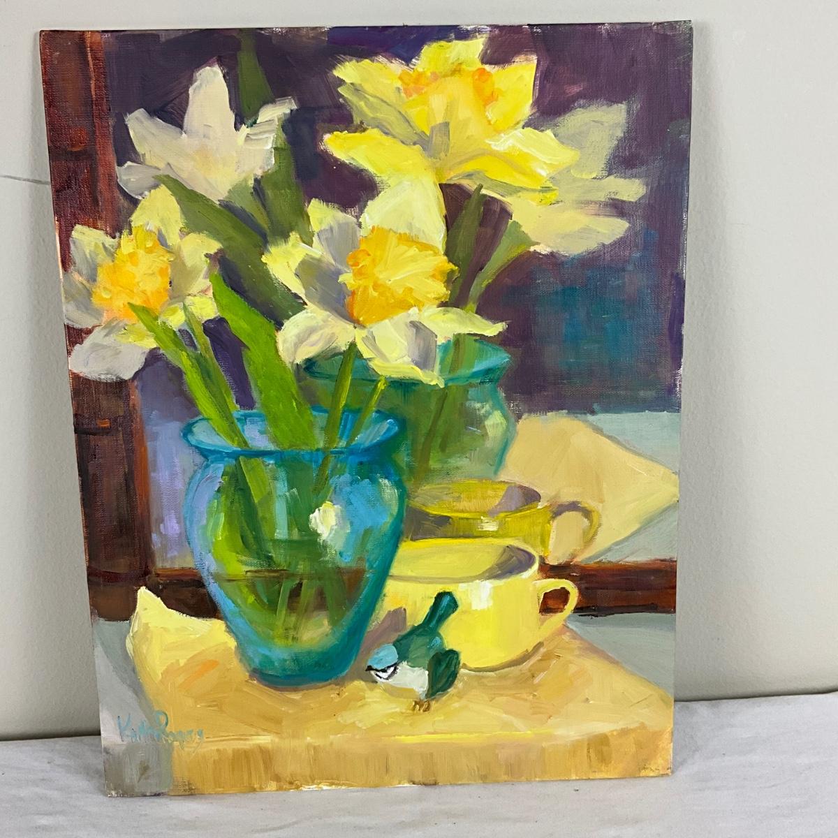 173 Original Oil Painting Yellow Daffodils with Blue Jay by Kathie Rogers