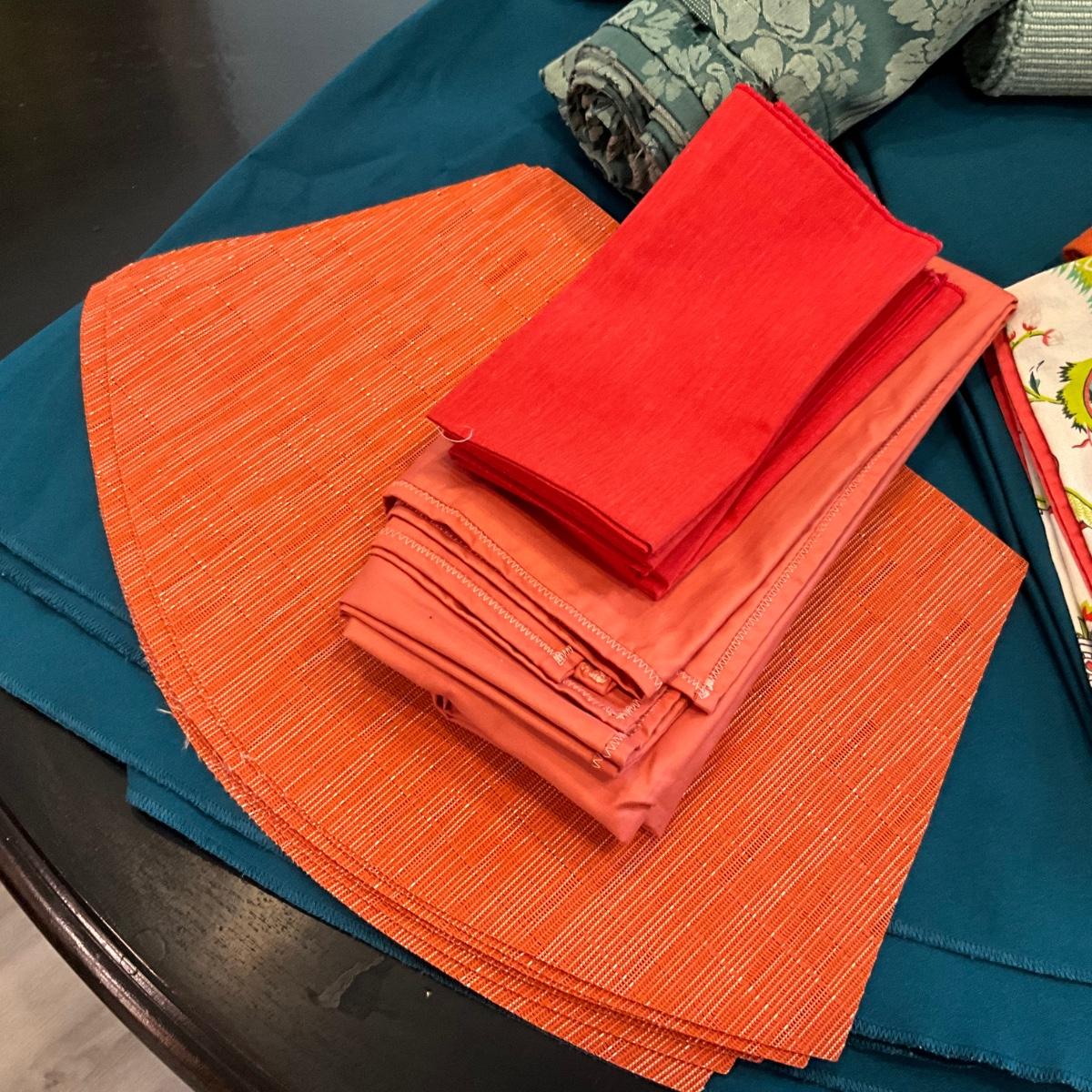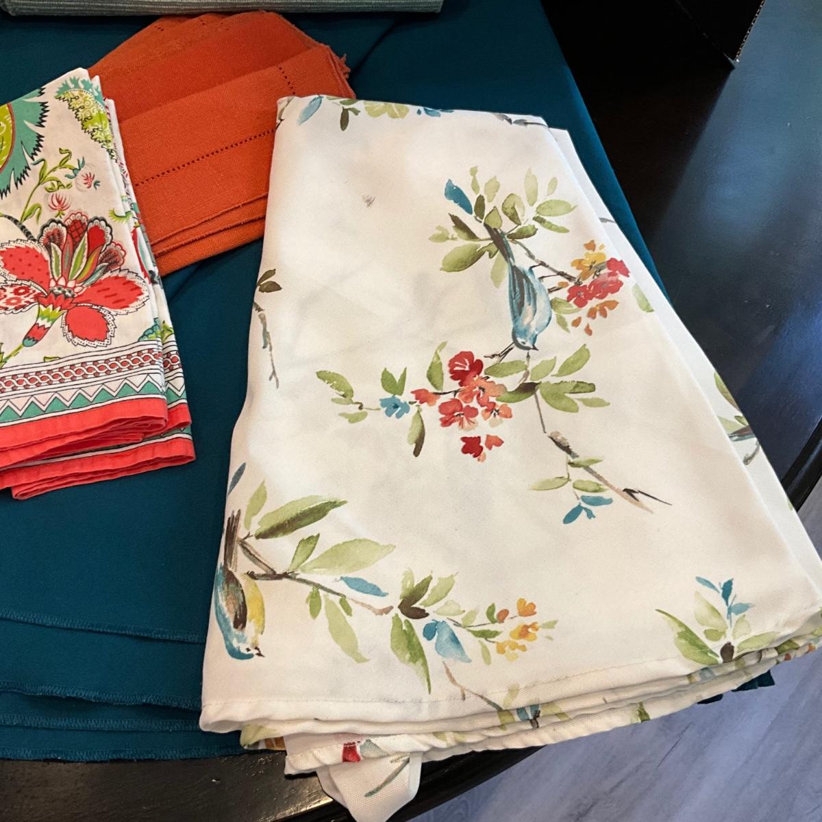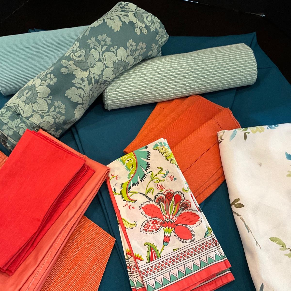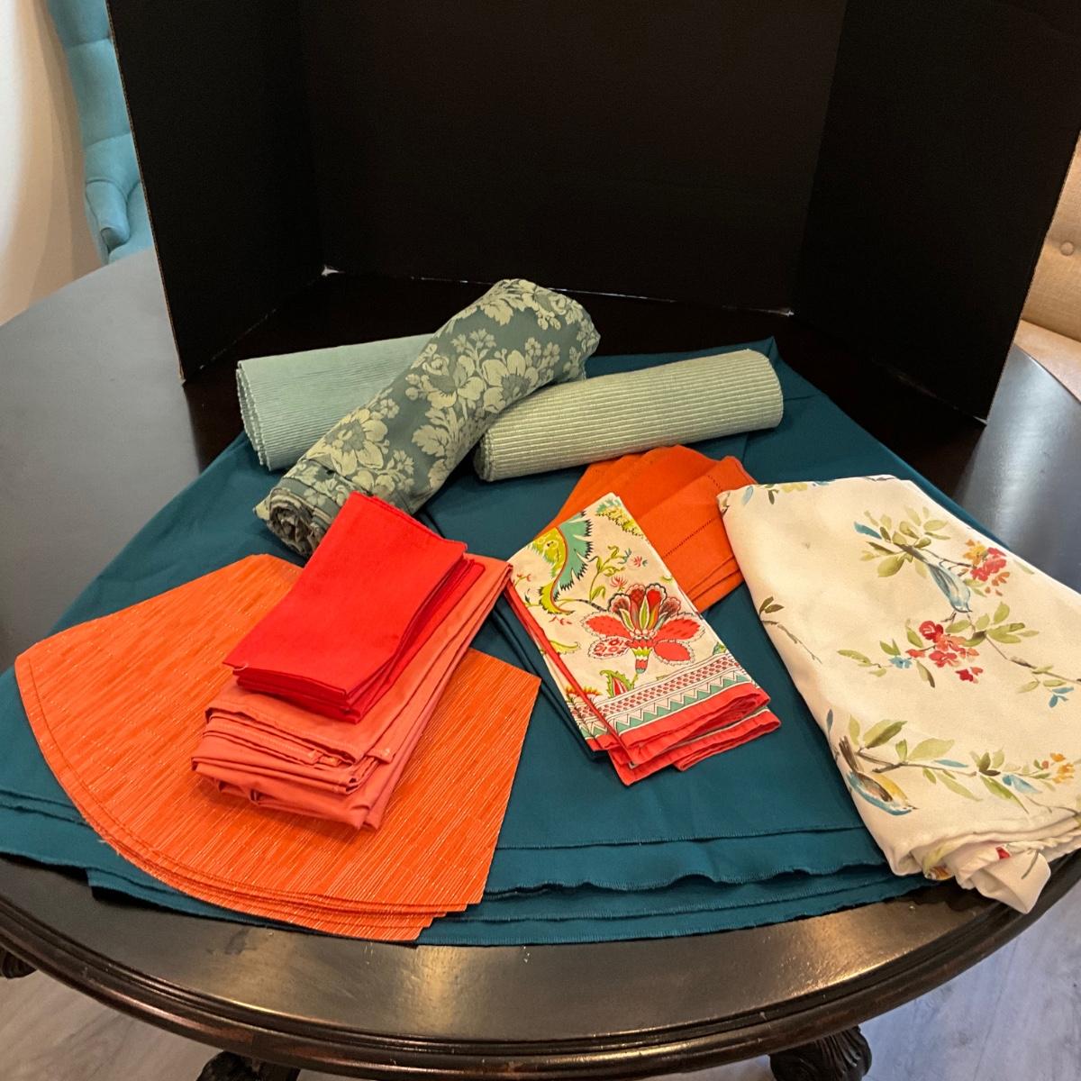 174 Lot of Orange, Aqua Blue, Floral Round Tablecloths and Napkins