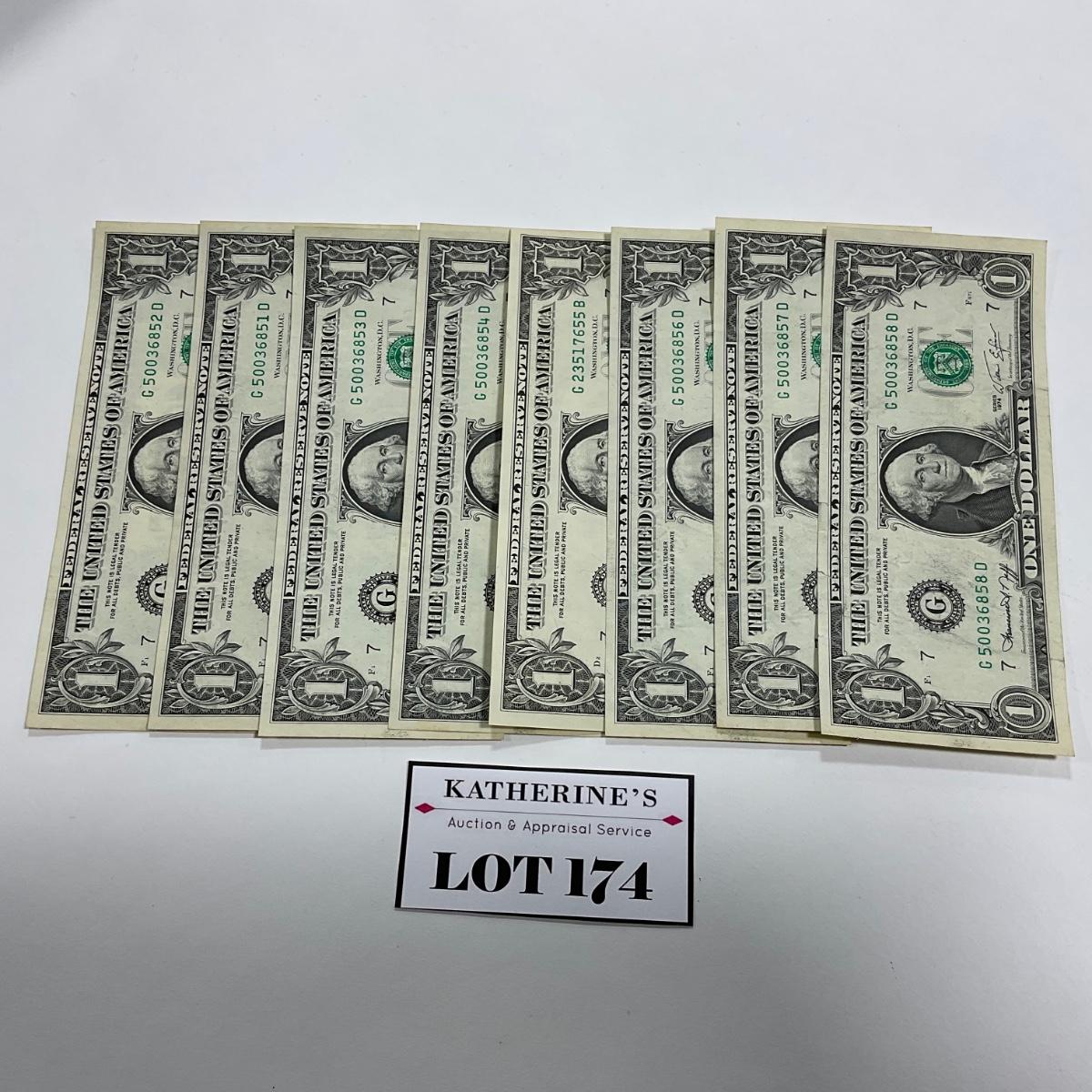 Eight 1974 Consecutive notes ch. bu 1 small top tear on the last note. Please see photos for details and condition. ::: Shipping is available on this lot. If you require shipping you must let us know at the close of the auction. We will coordinate with you after the item has been won. Shipping fees will include insurance up to or exceeding the value of all items being mailed. If you have any questions regarding this lot please contact the auctioneer either via this website, by direct email or by phone. PICK UP TIMES and other important information can be found in the TERMS and DESCRIPTION of the auction. Please take a look for pertinent information. Thanks!