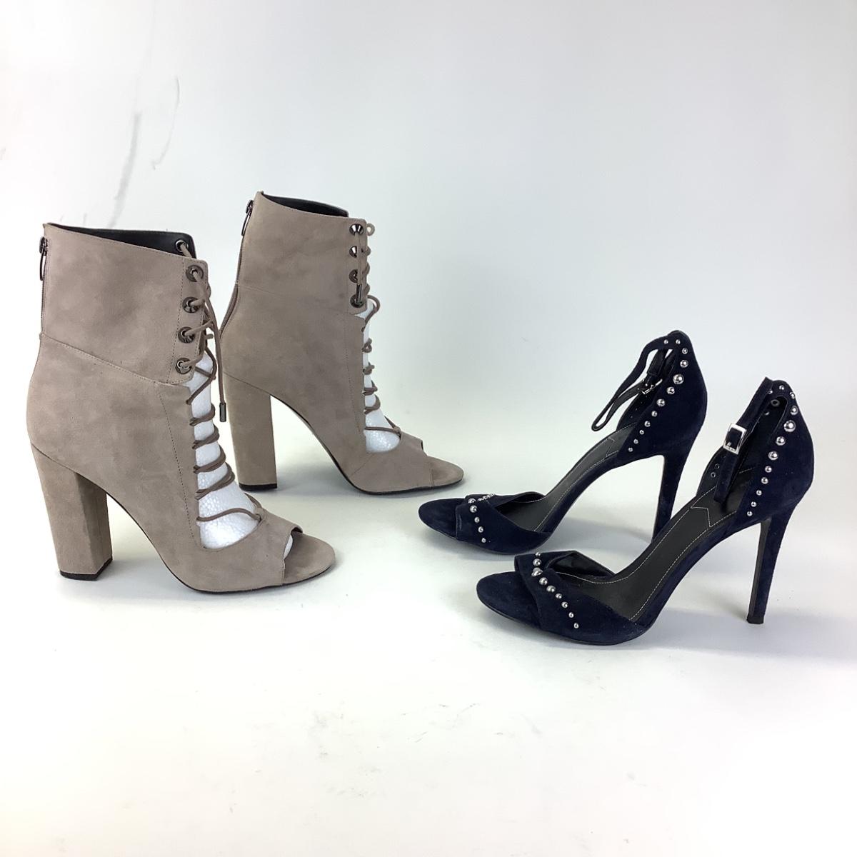 Tan suede high heel ankle boots and dark blue heel sandals, both size 10.