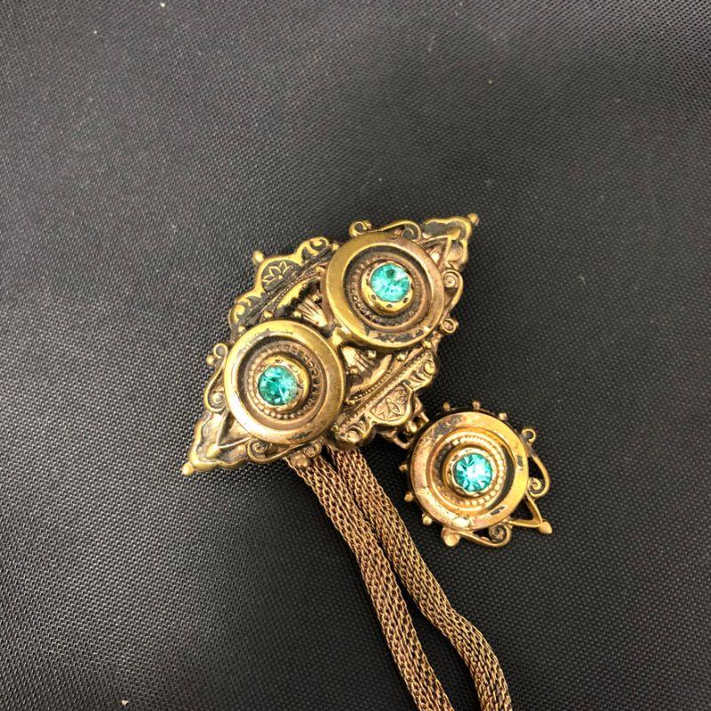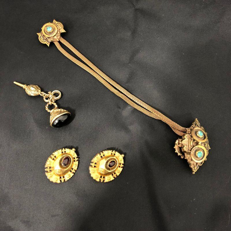Beautiful Victorian Etruscan Revival Scatter Pins, Fob & Double Brooch with Mesh Chain.
