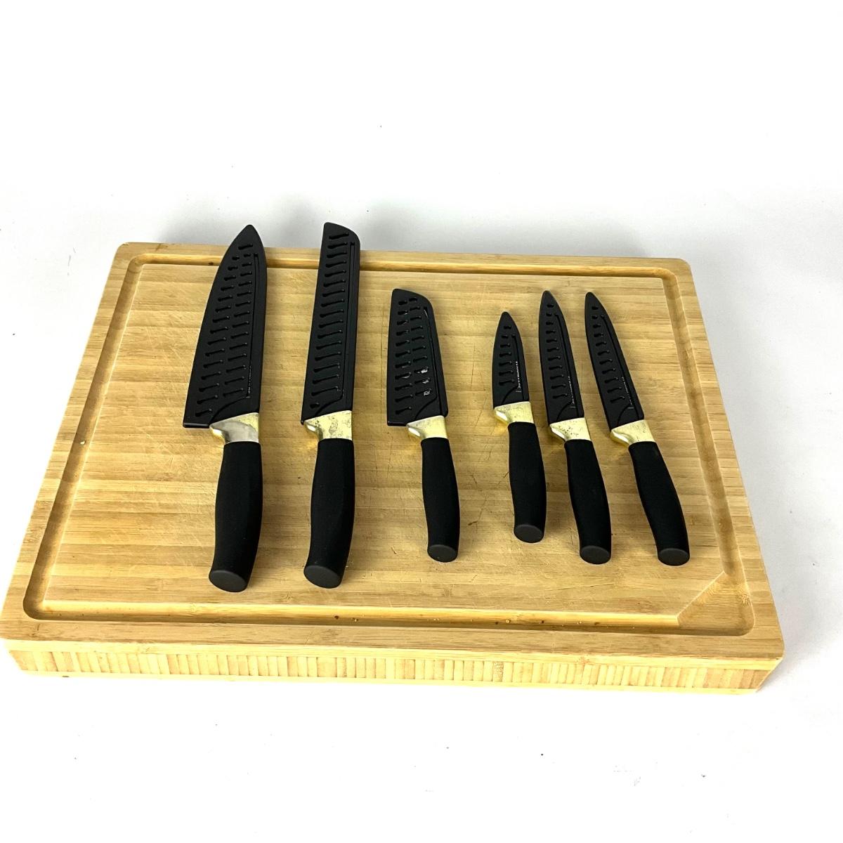 Farberware knife set complete with a versatile IKEA cutting board. Knife set includes various blades for different uses, making meal prep easy.