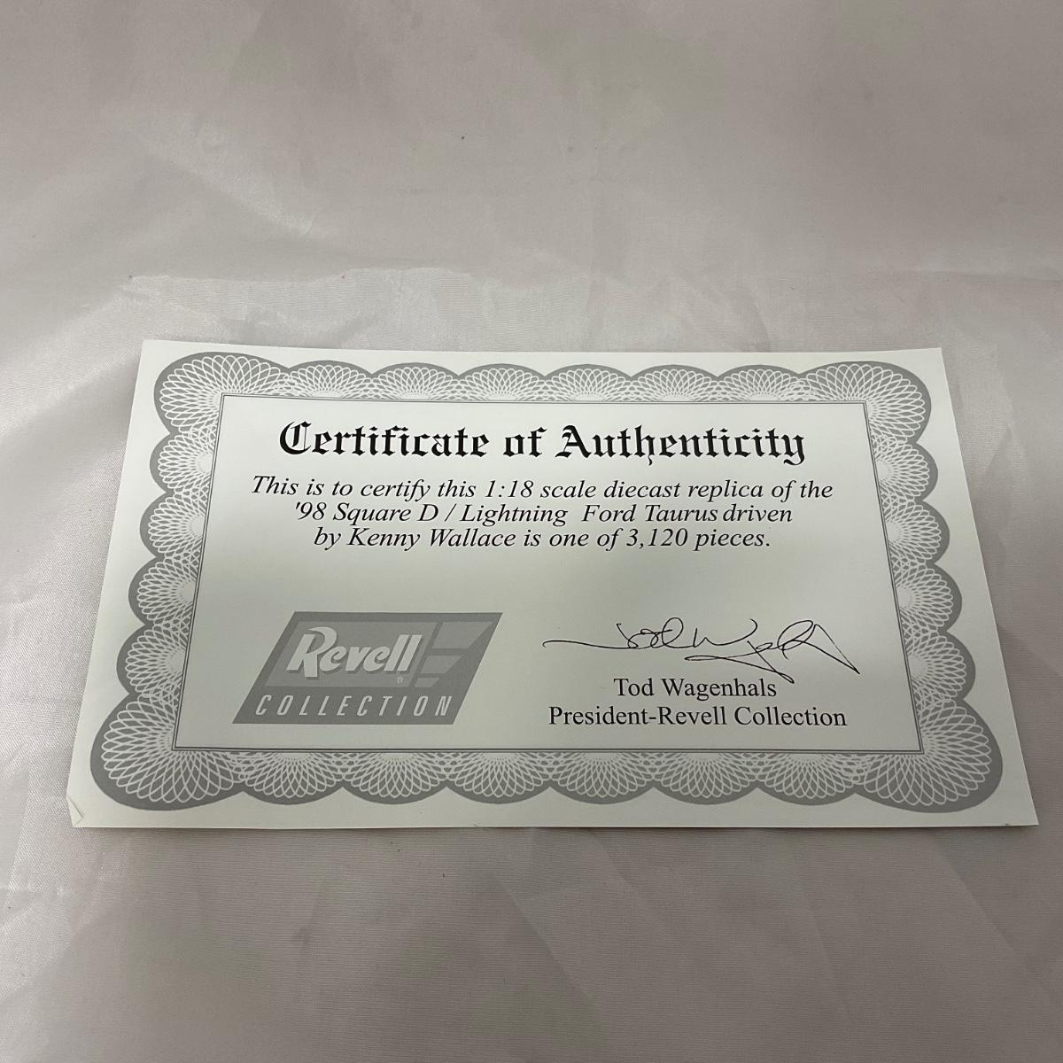 One NASCAR die cast 1:18 scale 1998 Square D Lightning Ford Taurus figure. Comes with a Certificate of Authenticity. Driver Kenny Wallace. Please see photos for details and condition. ::: Shipping is available on this lot. If you require shipping you must let us know at the close of the auction. We will coordinate with you after the item has been won. Shipping fees will include insurance up to or exceeding the value of all items being mailed. If you have any questions regarding this lot please contact the auctioneer either via this website, by direct email or by phone. PICK UP TIMES and other important information can be found in the TERMS and DESCRIPTION of the auction. Please take a look for pertinent information. Thanks!