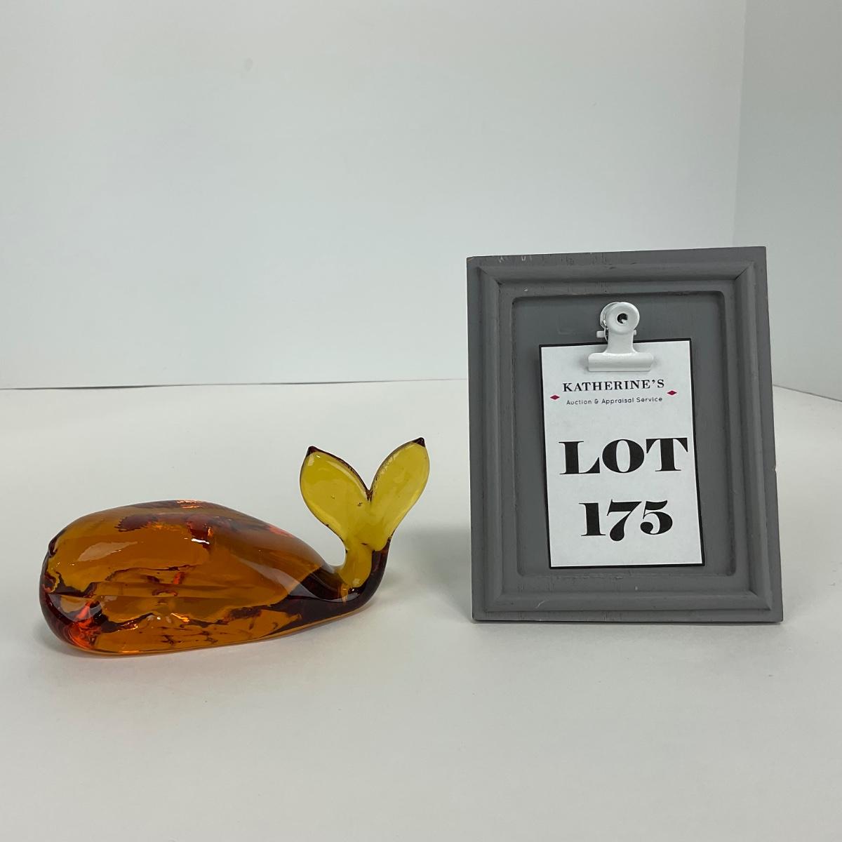 ne amber glass whale. 2 1/2 inches tall by 5 1/2 inches wide. This piece has no damage, and appears to be in great shape with no visable chips, cracks, or broken pieces. Please see photos for details and condition. Any condition statement is given as a courtesy to a client, is an opinion, and should not be treated as a statement of fact. Reference to condition written, oral or within a condition report shall not be regarded as a full account of condition and may not include all defects, alterations, or restorations. Absence of a condition report does not imply a lot is flawless or lacking imperfections or damage. Katherine’s Auction & Appraisal Service shall have no responsibility for any error or omission. Returns shall not be accepted on the basis of condition. ::: Shipping is available on this lot. If you require shipping you must let us know at the close of the auction. We will coordinate with you after the item has been won. Shipping fees will include insurance up to or exceeding the value of all items being mailed. If you have any questions regarding this lot please contact the auctioneer either via this website, by direct email or by phone. PICK UP TIMES and other important information can be found in the TERMS and DESCRIPTION of the auction. Please take a look for pertinent information. Thanks!