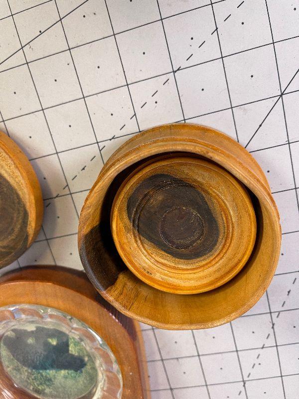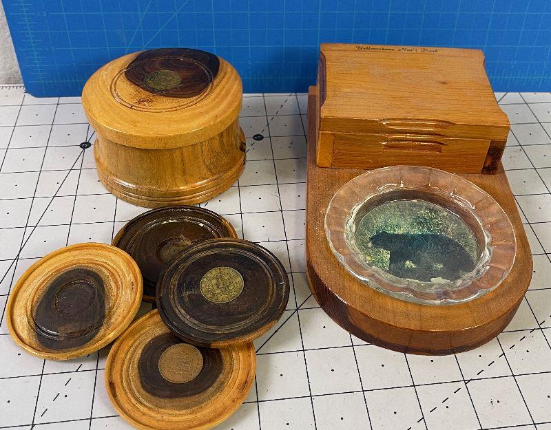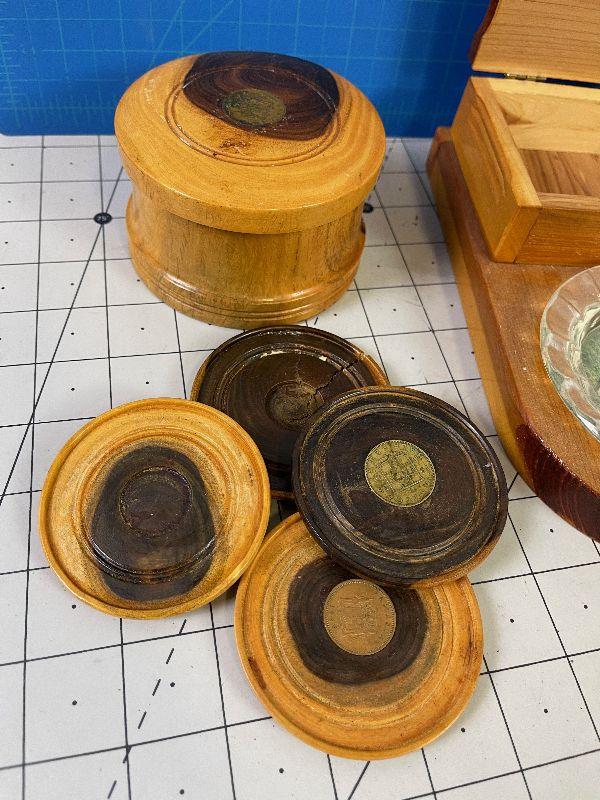 #175 WOOD THINGS: Coasters, box w/lid, Ashtray and cigarette box