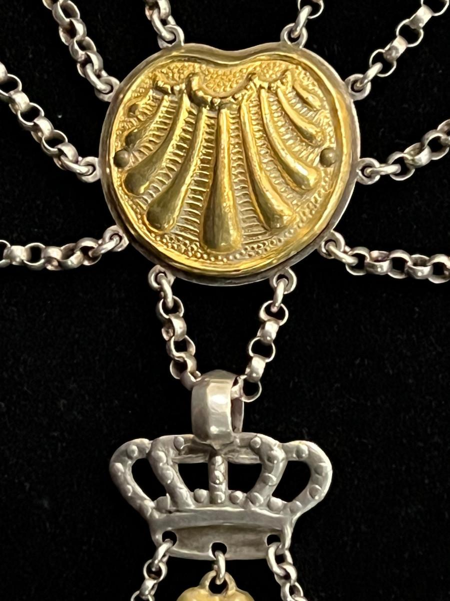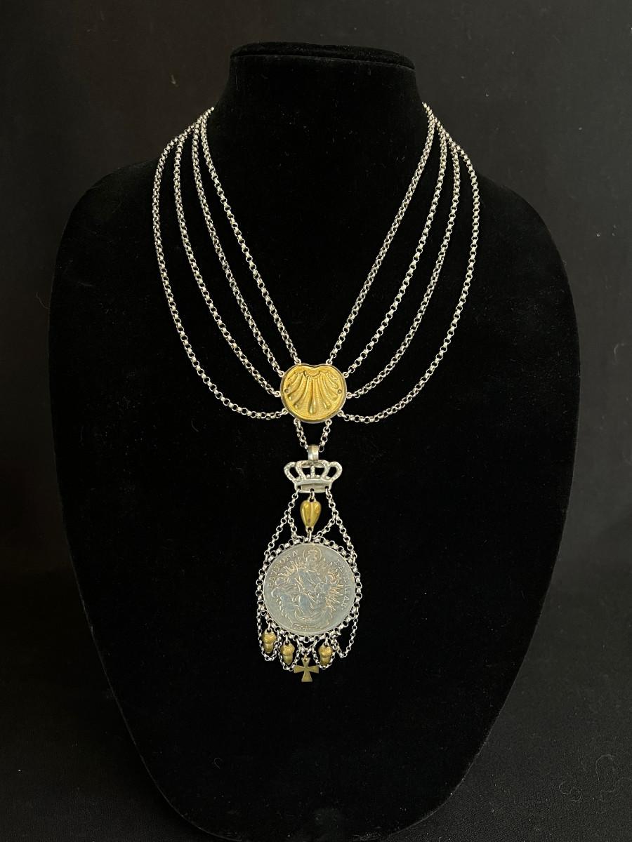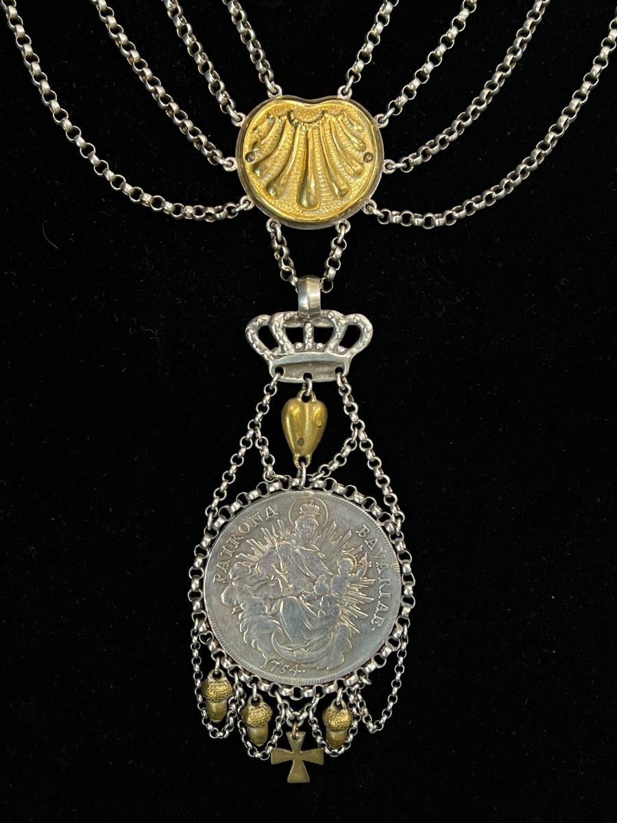 Front of Necklace: Seated Madonna with Child, upturned crescent moon and clouds below, rays around behind, date at bottom 1754