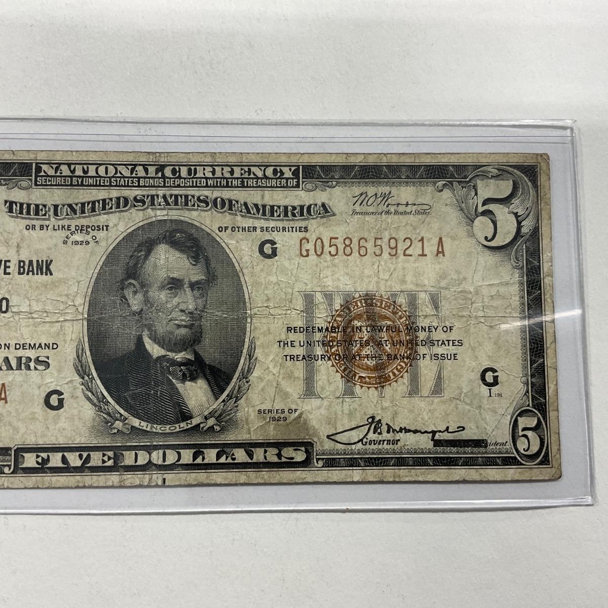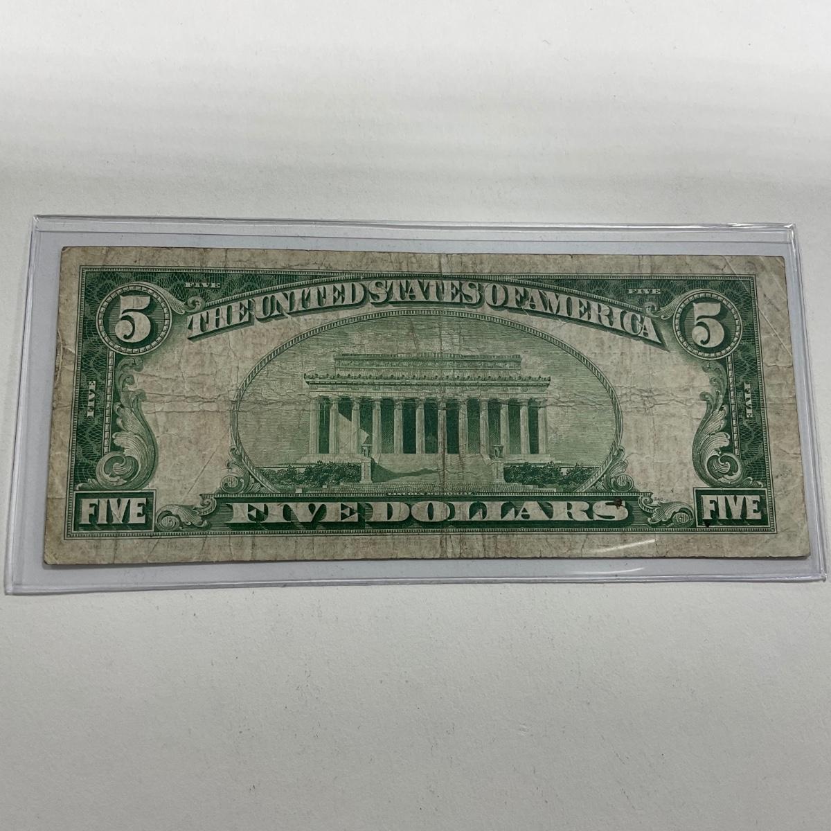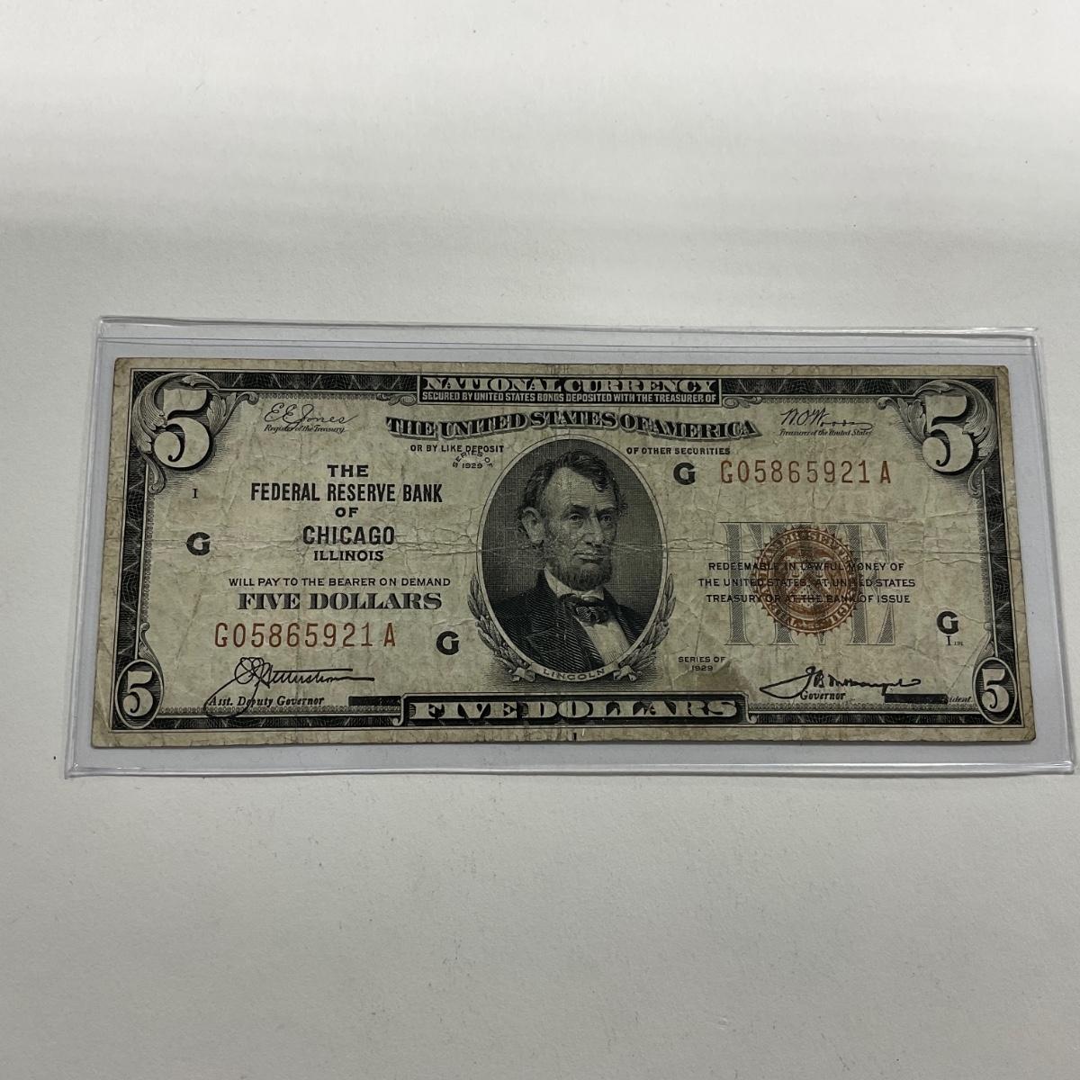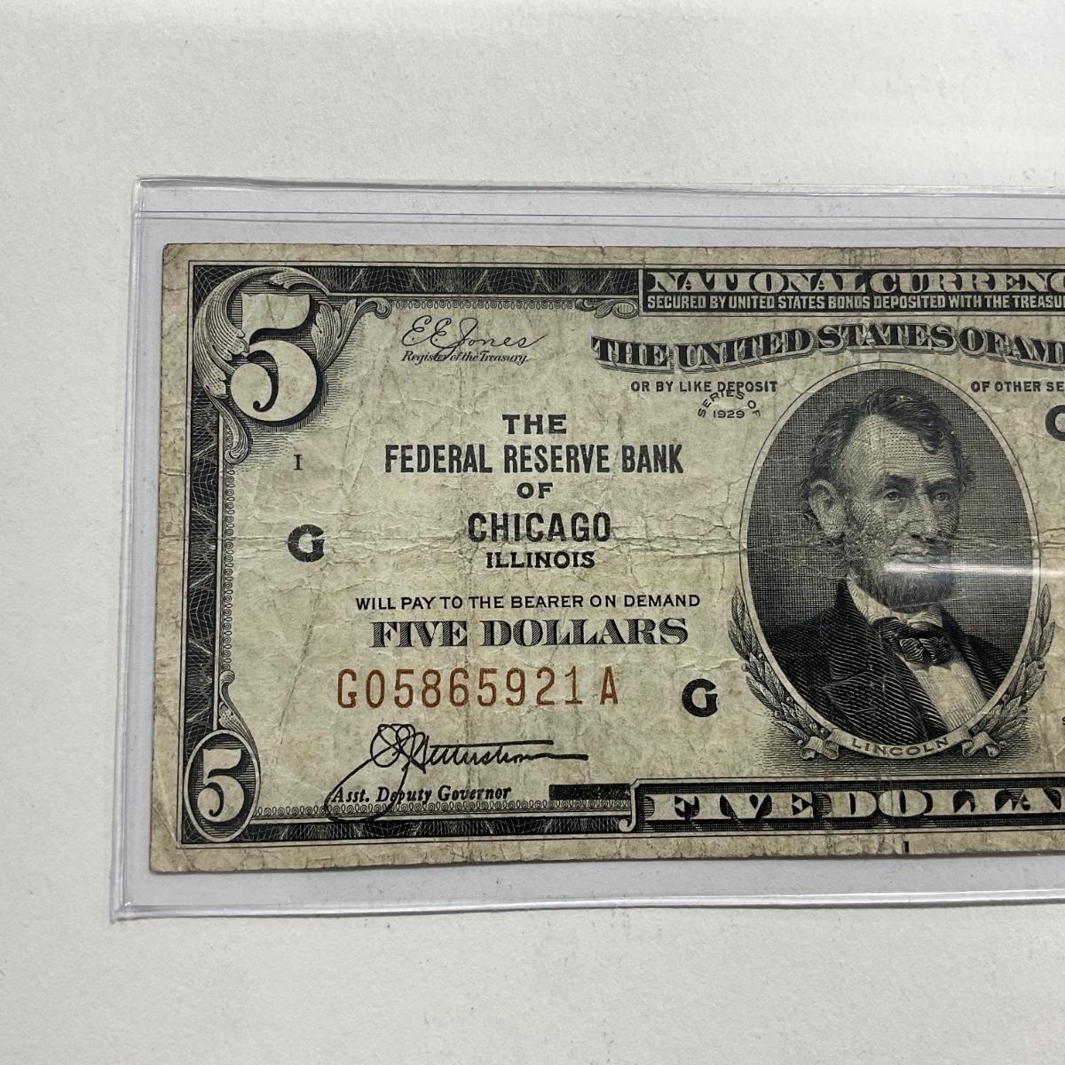 One 1929 Five Dollar Brown Seal Chicago Federal Reserve Note average circulation in good overall appearance. Please see photos for details and condition. ::: Shipping is available on this lot. If you require shipping you must let us know at the close of the auction. We will coordinate with you after the item has been won. Shipping fees will include insurance up to or exceeding the value of all items being mailed. If you have any questions regarding this lot please contact the auctioneer either via this website, by direct email or by phone. PICK UP TIMES and other important information can be found in the TERMS and DESCRIPTION of the auction. Please take a look for pertinent information. Thanks!