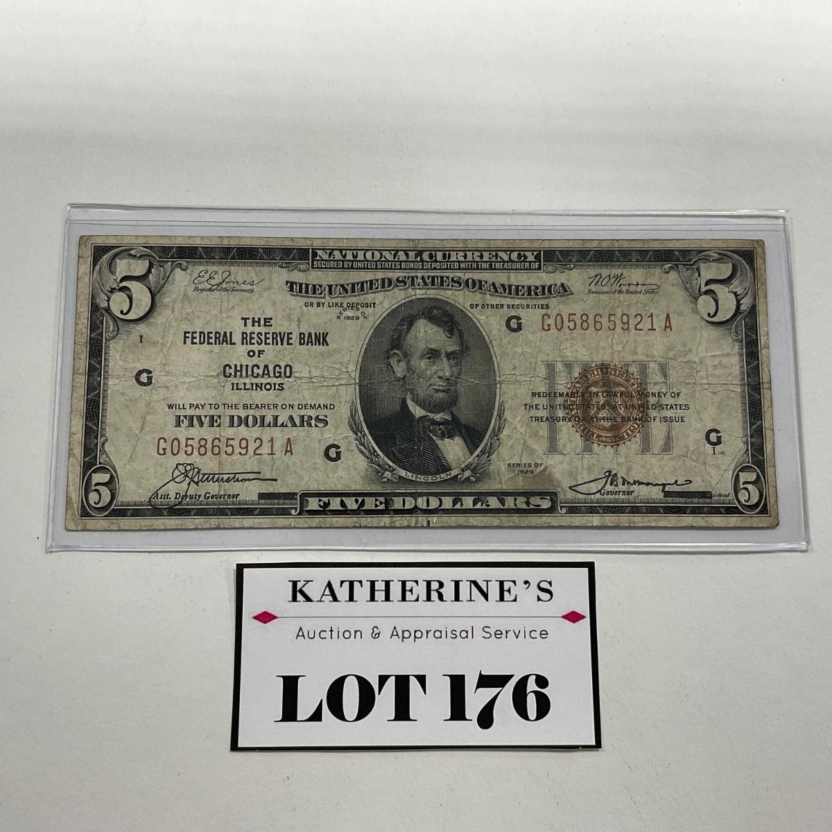 -176- CURRENCY | 1929 Five Dollar Brown Seal Chicago Federal Reserve Note