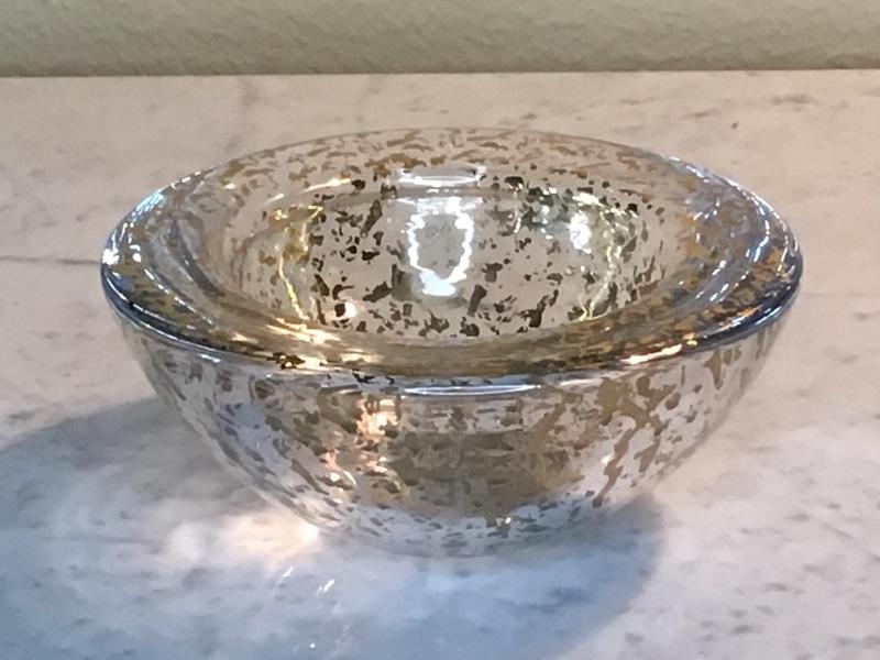 This glass bowl features glass that is 1-1/4" thick. It is 7" across the top and stands 3" tall.