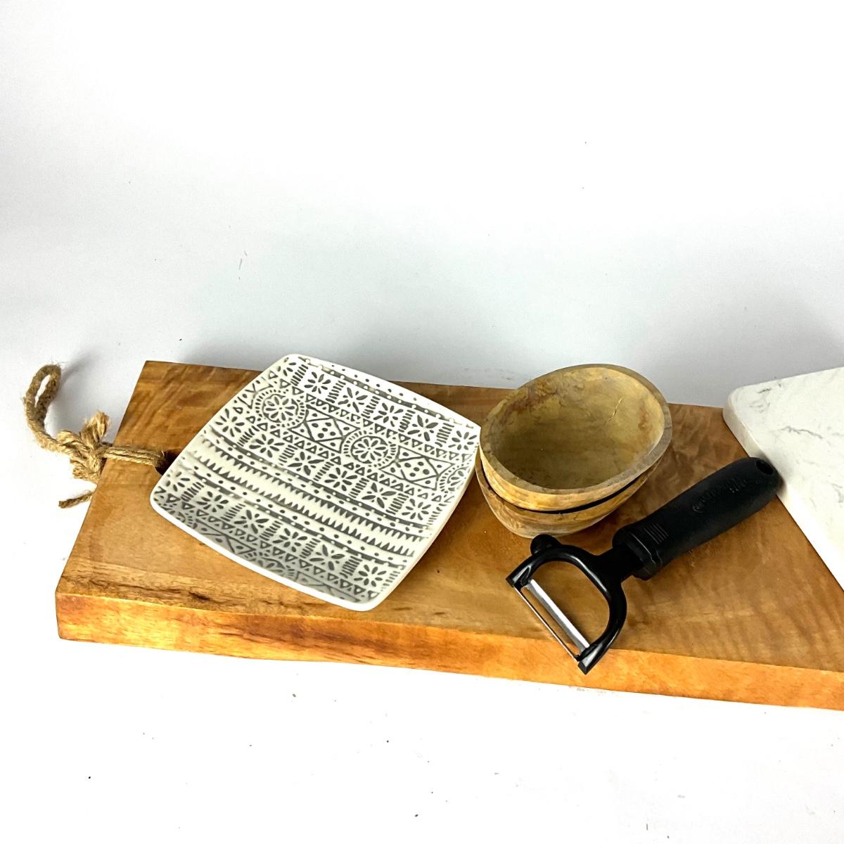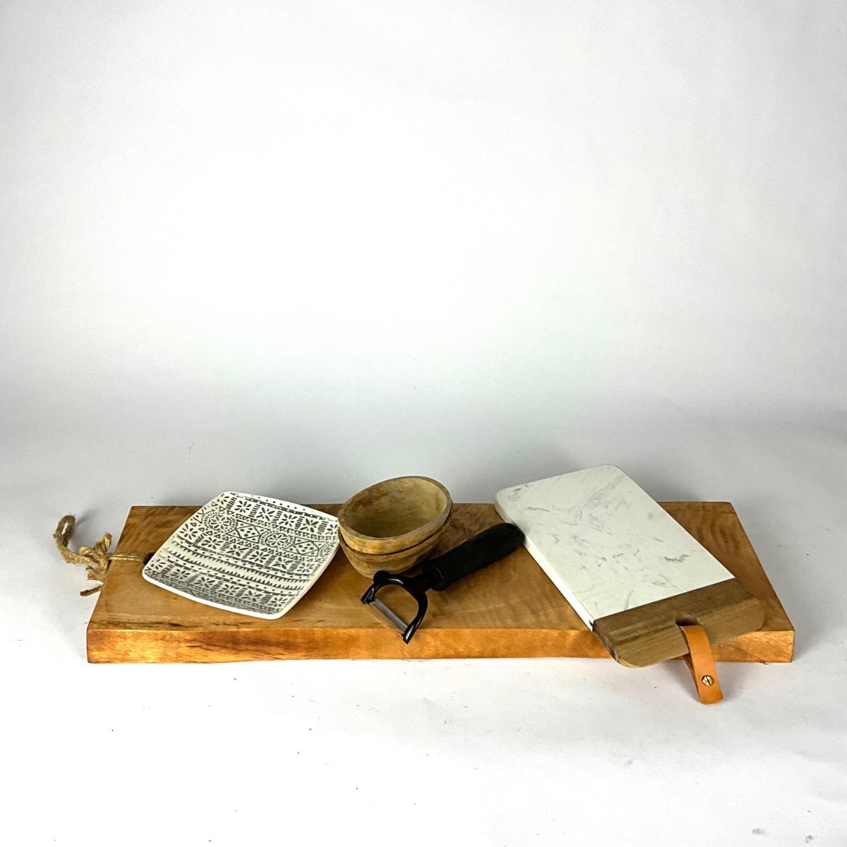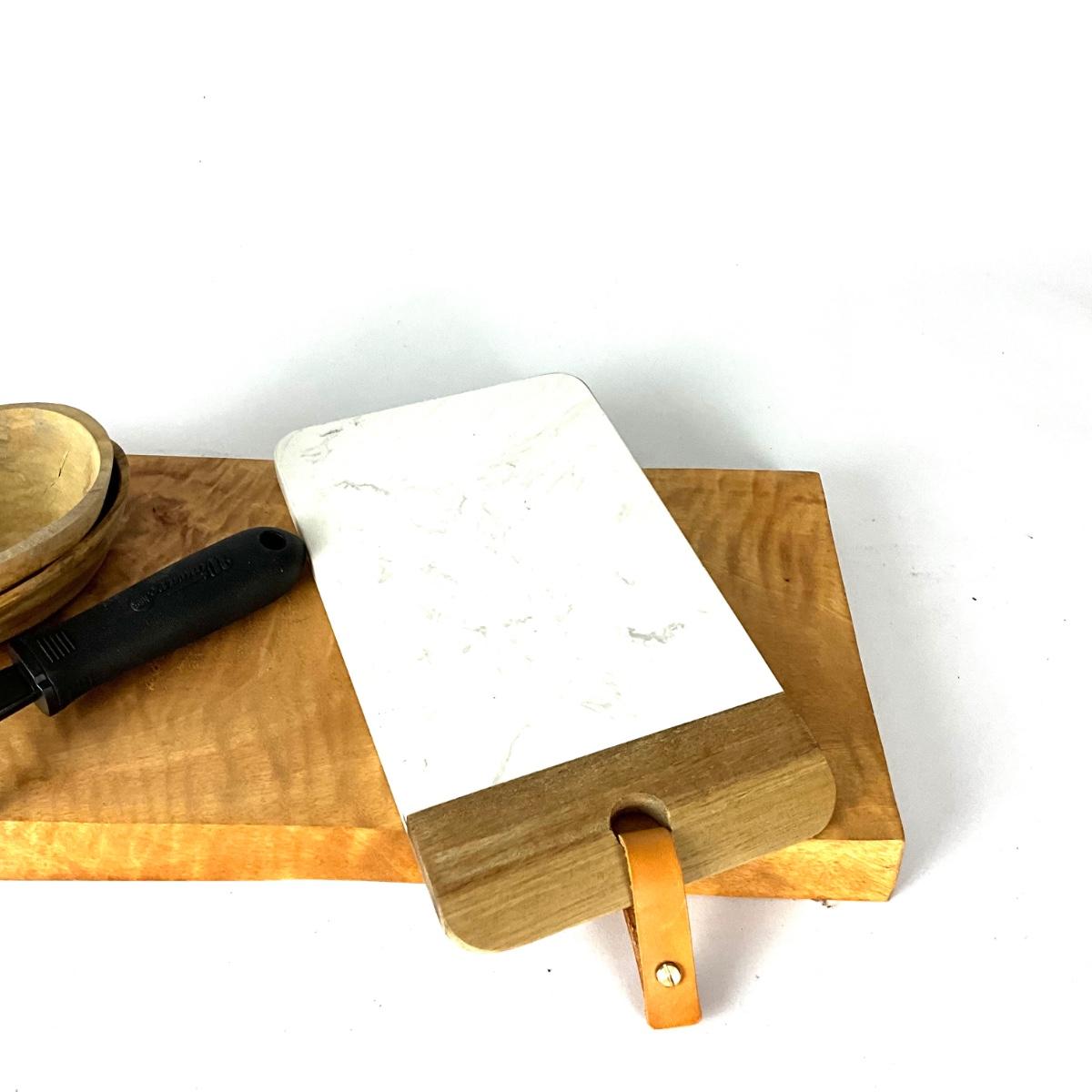 A beautiful combination of kitchen essentials, including a long cutting board (23.5" W x 7" H), a marble cheese slicer, and a stylish BOMSHBEE cutting board. Perfect for serving and preparing food.