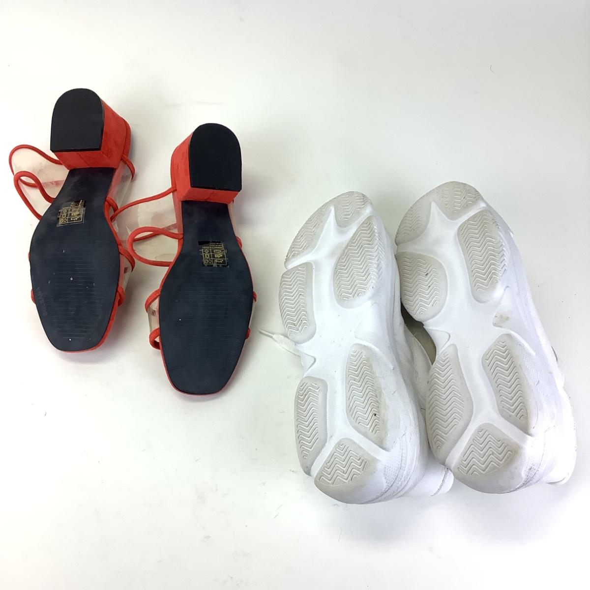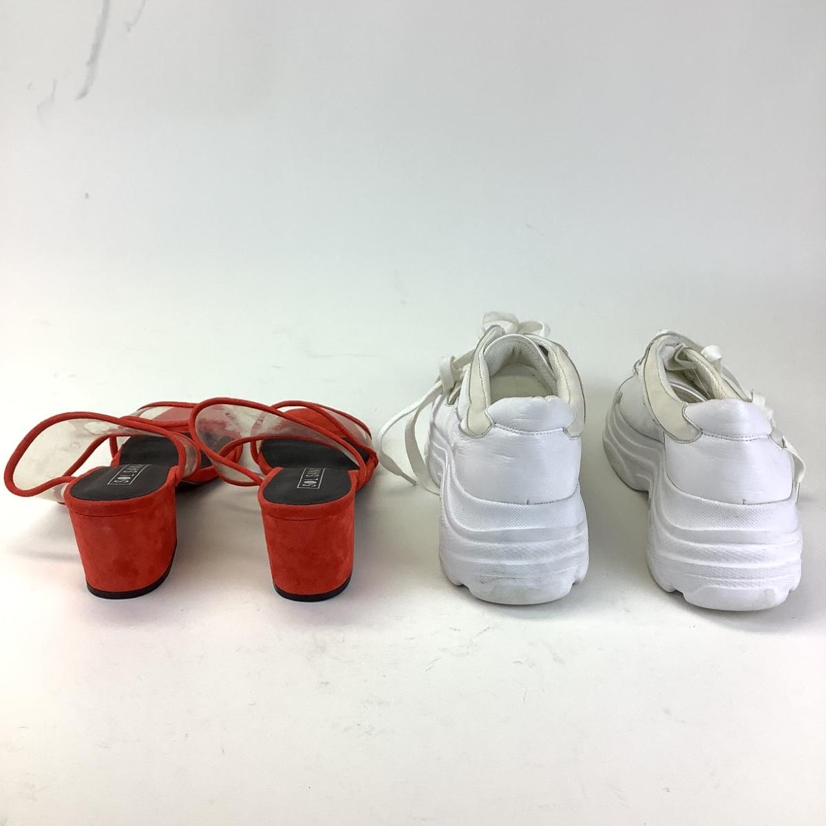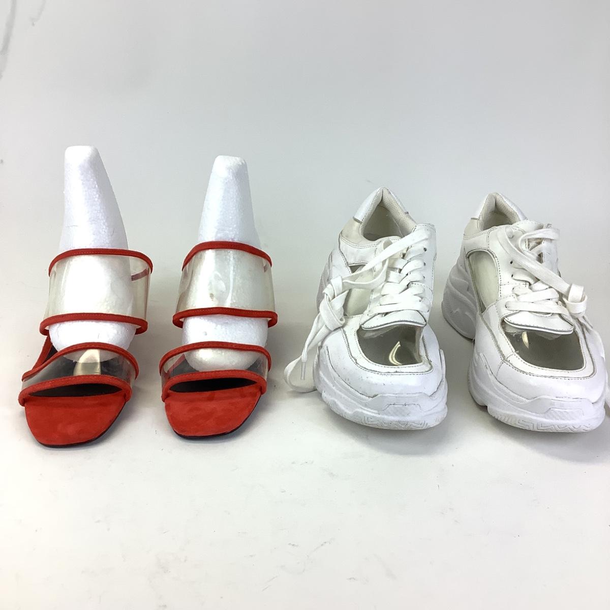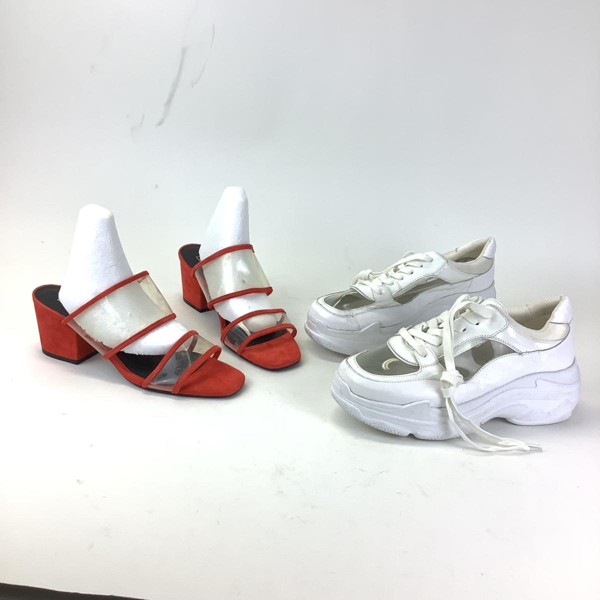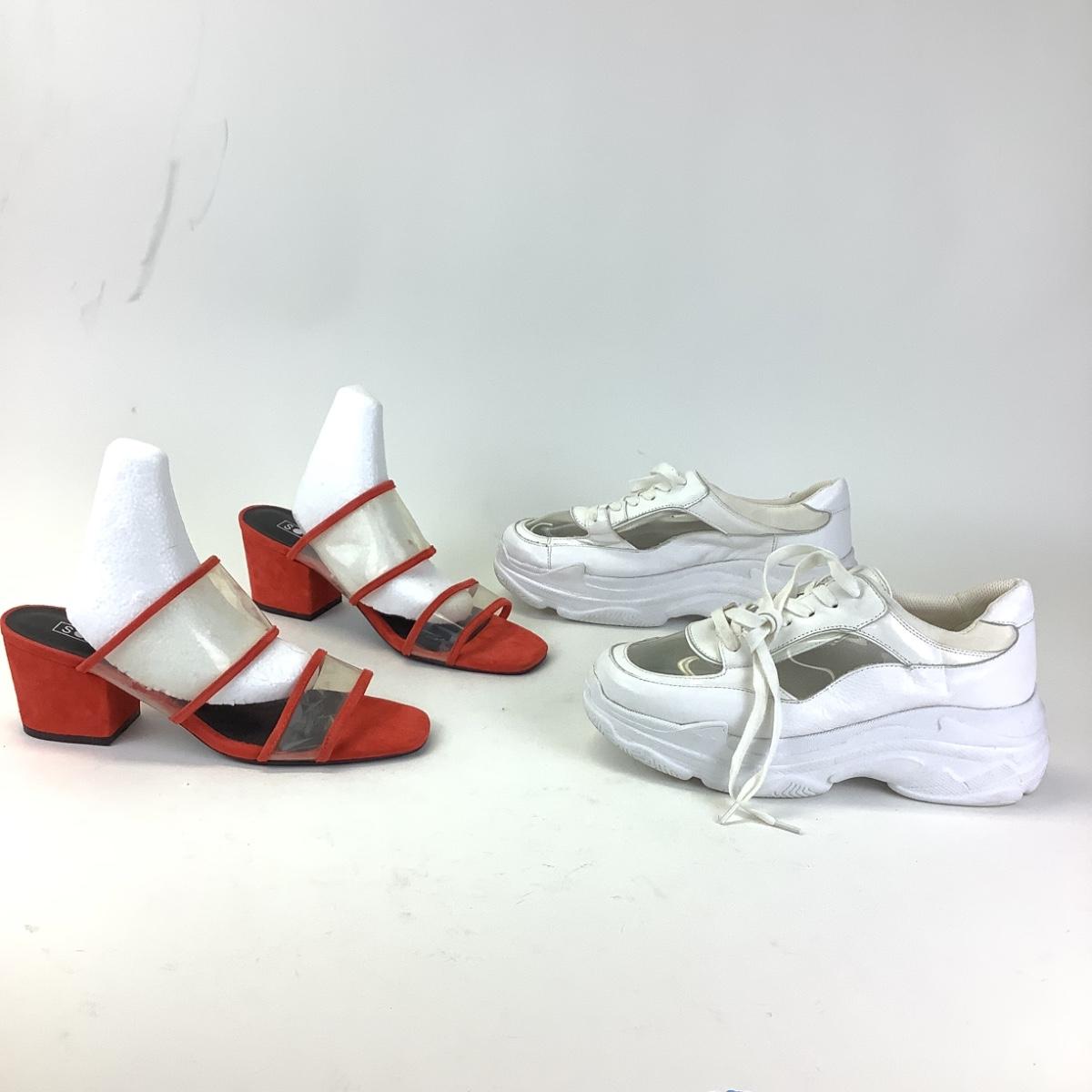 Red suede and plastic mule slips on shoes by Sol Sana size 41 and white synthetic leather/plastic tennis shoes by Villa Rouge size 41.
