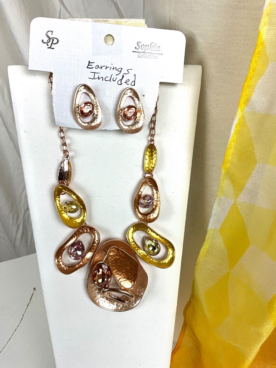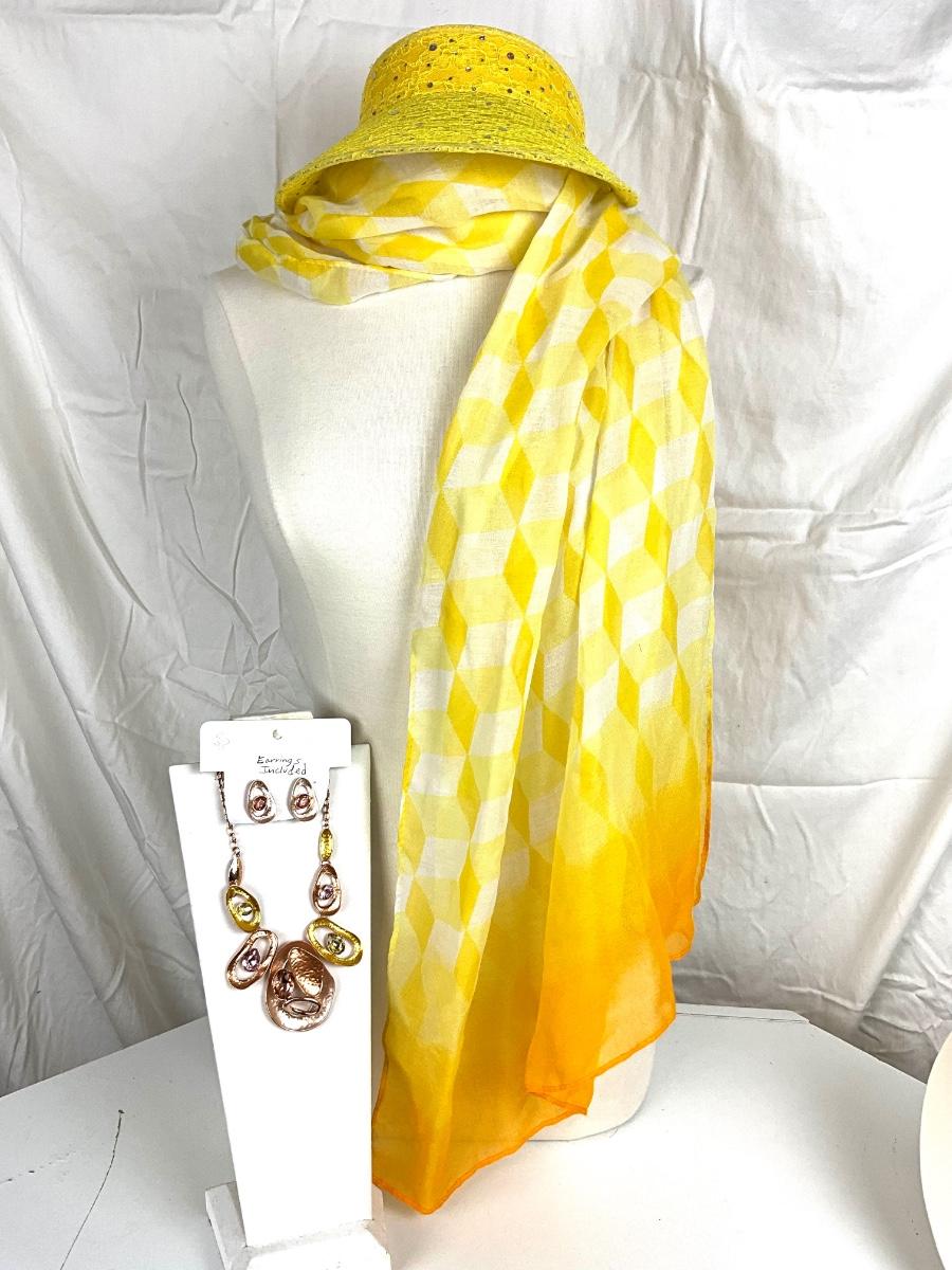 176 Yellow White Scarf with Rose and Yellow Gold tone Necklace & Earring Set