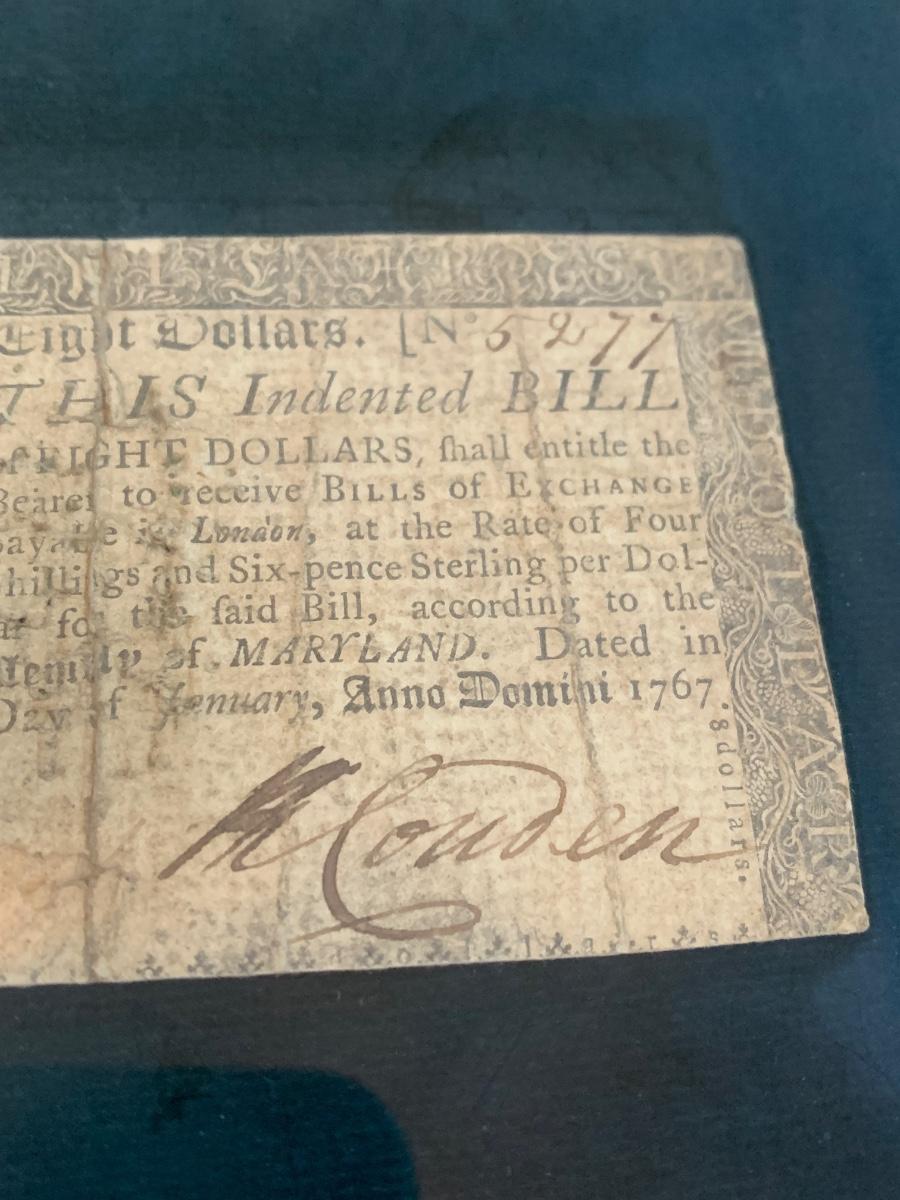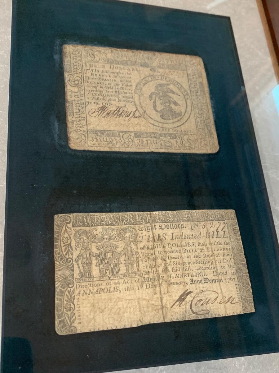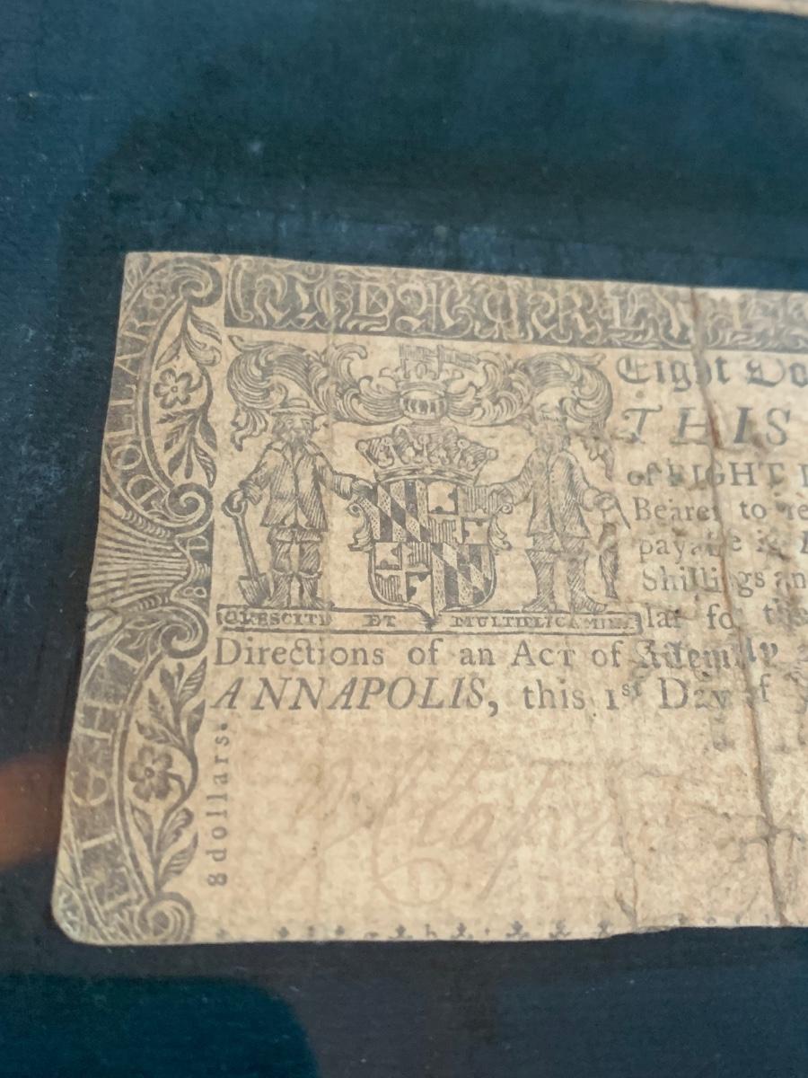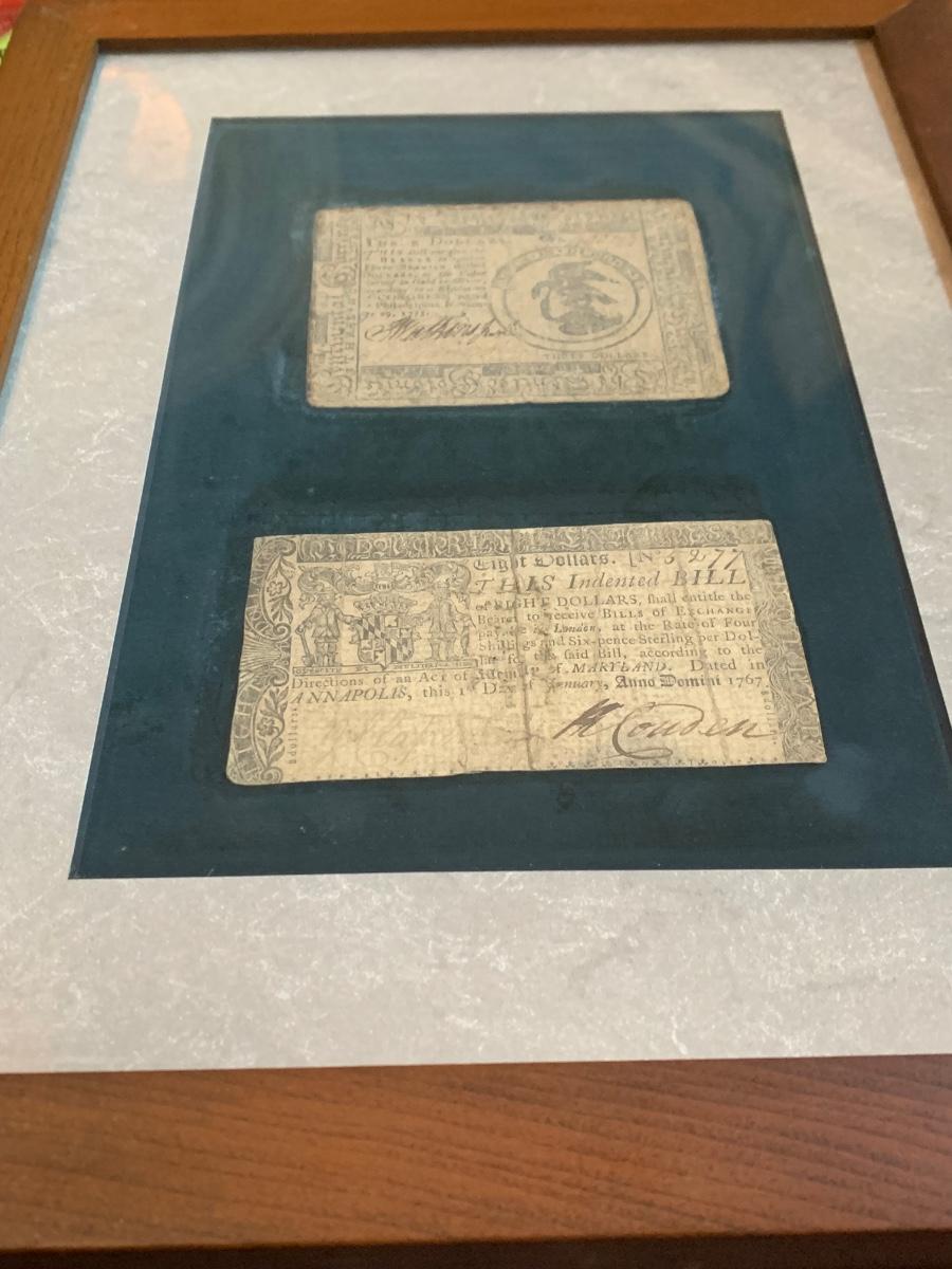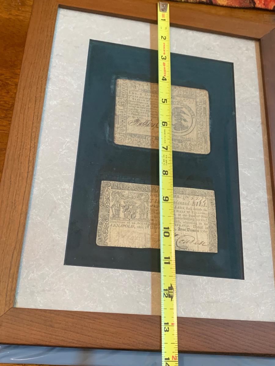 2 piece paper currency lot - Maryland Colonial era . Selling as mounted by previous owner in frame. We have other colonial era currency lots up for auction. See lot C1 and C3.