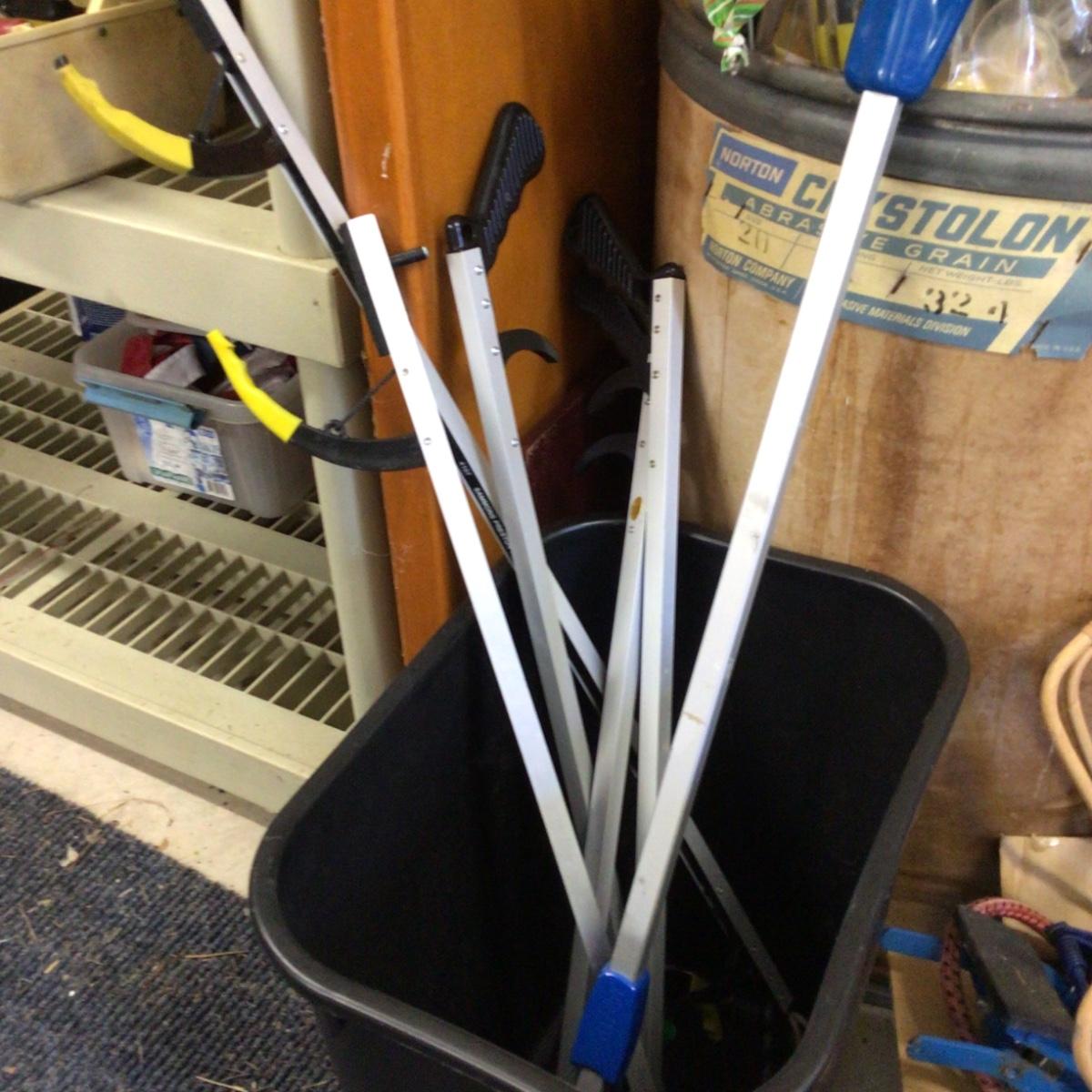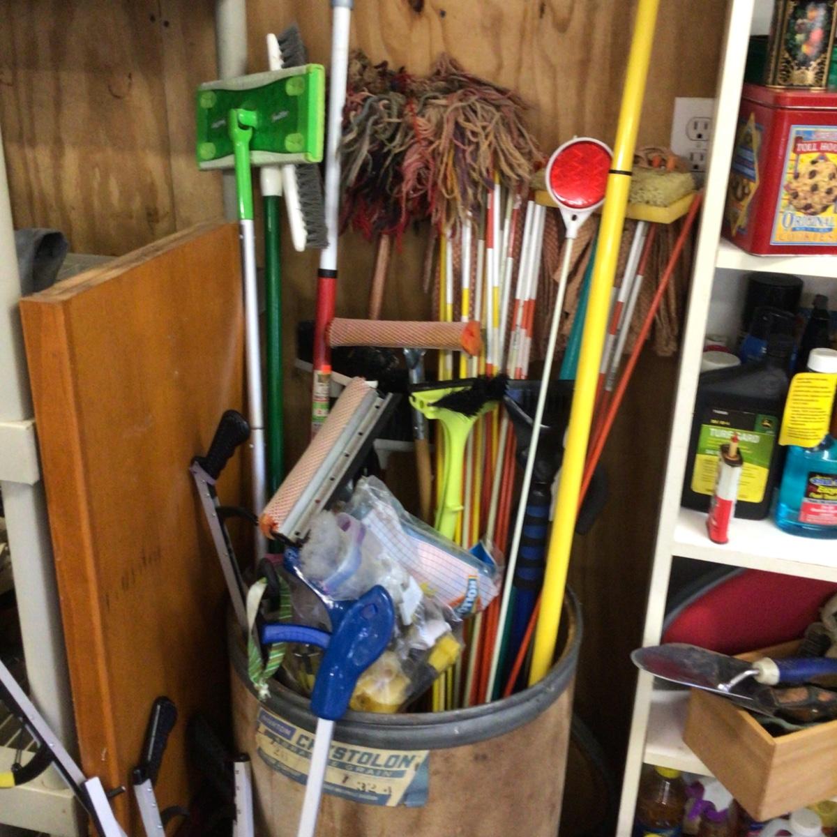 Large barrel with rods, mops, brooms, lightbulb changer etc, and small trash can with several “grabbers”.