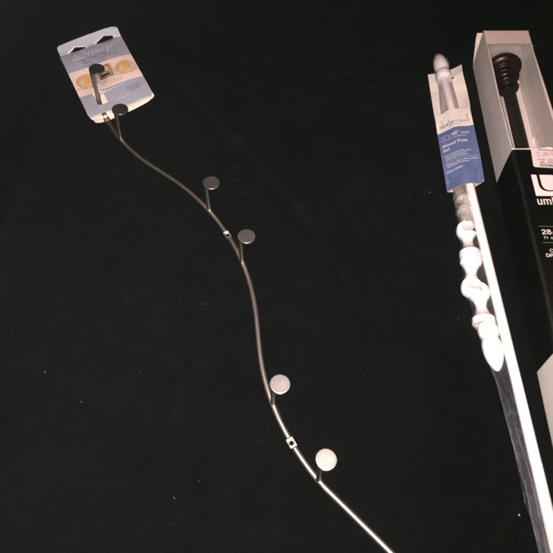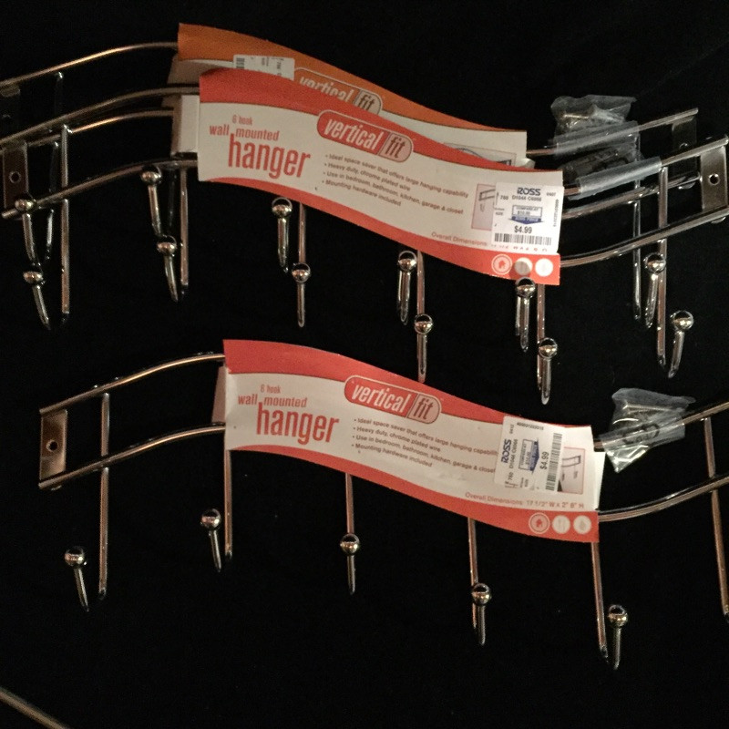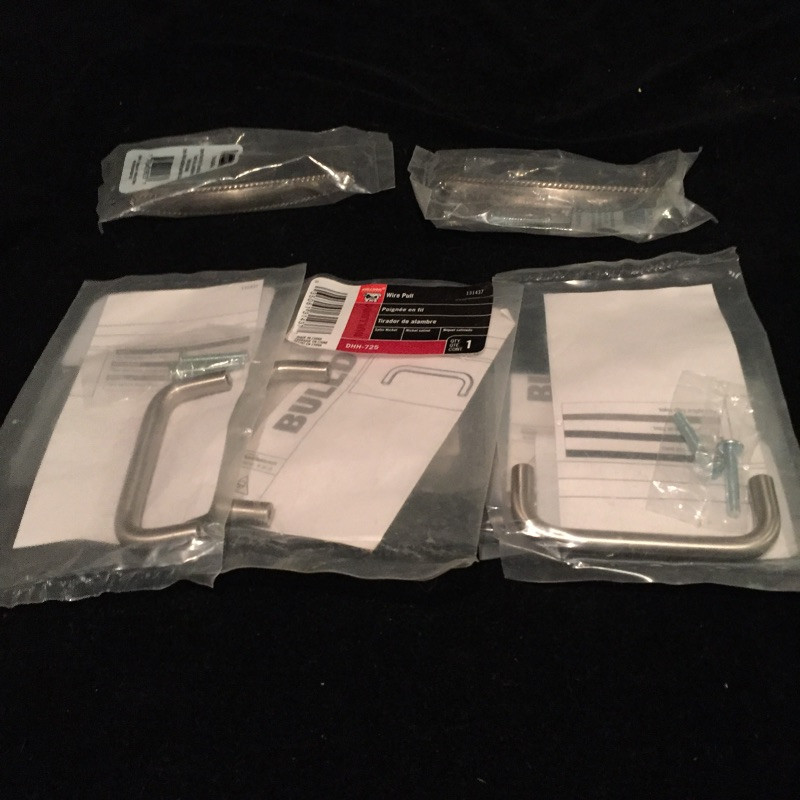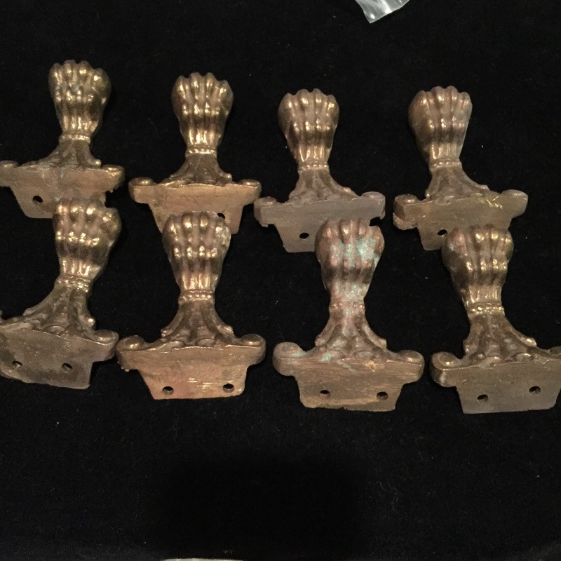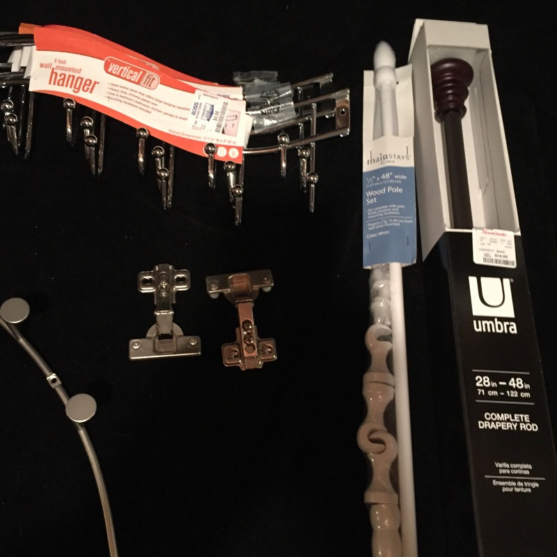 A great assortment of hanging pieces and hardware. The two drapery rods are still in their packaging, see images for dimensions. Three 6 hook wall mounted hangers. A great assortment of hardware that includes cabinet hinges and door pulls, brackets and more. Also included are 7 nice heavy furniture claw feet.