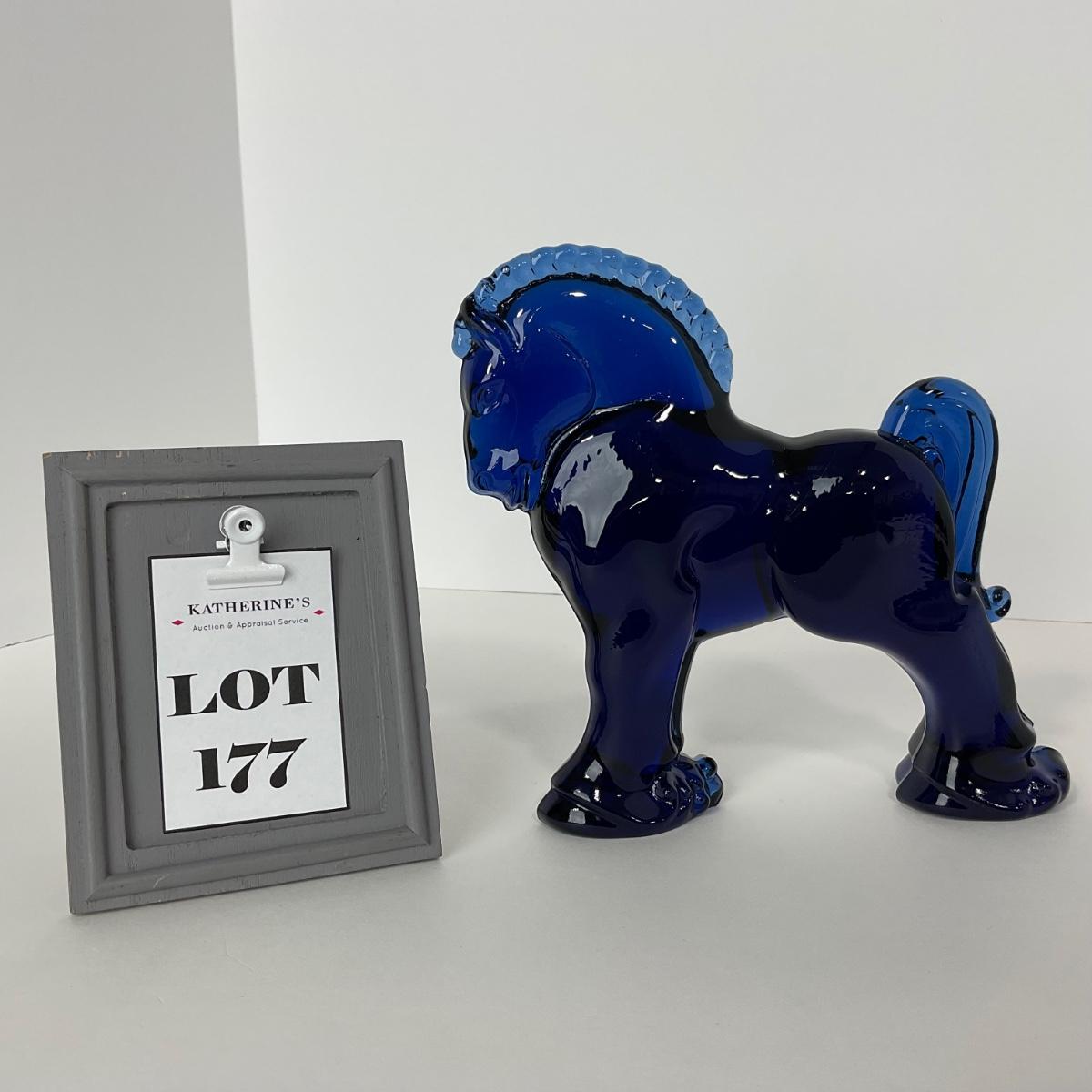 One Longaberger Heisey Mosser cobalt blue marked Clydesdale horse figure. 7 1/2 inches wide by 7 1/4 inches tall. This piece has no damage, and appears to be in great shape with no visable chips, cracks, or broken pieces. Please see photos for details and condition. Any condition statement is given as a courtesy to a client, is an opinion, and should not be treated as a statement of fact. Reference to condition written, oral or within a condition report shall not be regarded as a full account of condition and may not include all defects, alterations, or restorations. Absence of a condition report does not imply a lot is flawless or lacking imperfections or damage. Katherine’s Auction & Appraisal Service shall have no responsibility for any error or omission. Returns shall not be accepted on the basis of condition. ::: Shipping is available on this lot. If you require shipping you must let us know at the close of the auction. We will coordinate with you after the item has been won. Shipping fees will include insurance up to or exceeding the value of all items being mailed. If you have any questions regarding this lot please contact the auctioneer either via this website, by direct email or by phone. PICK UP TIMES and other important information can be found in the TERMS and DESCRIPTION of the auction. Please take a look for pertinent information. Thanks!