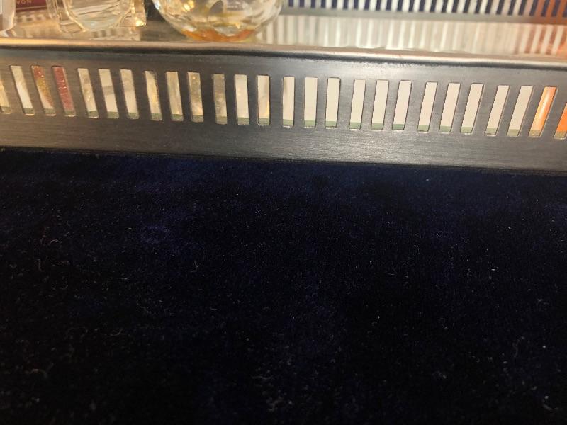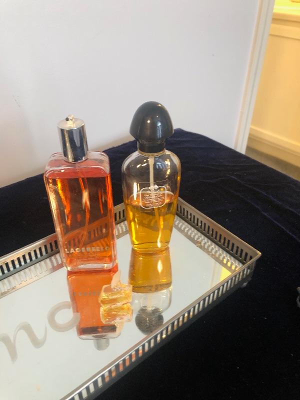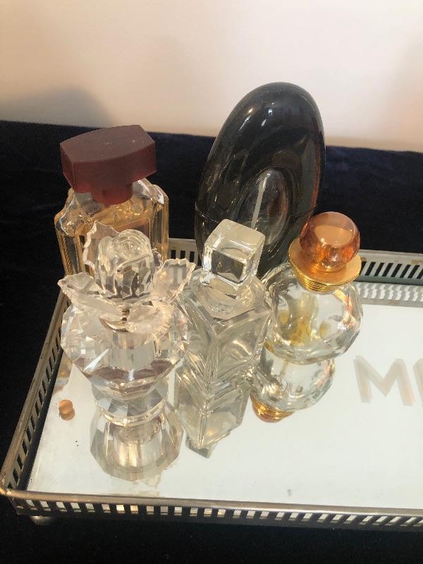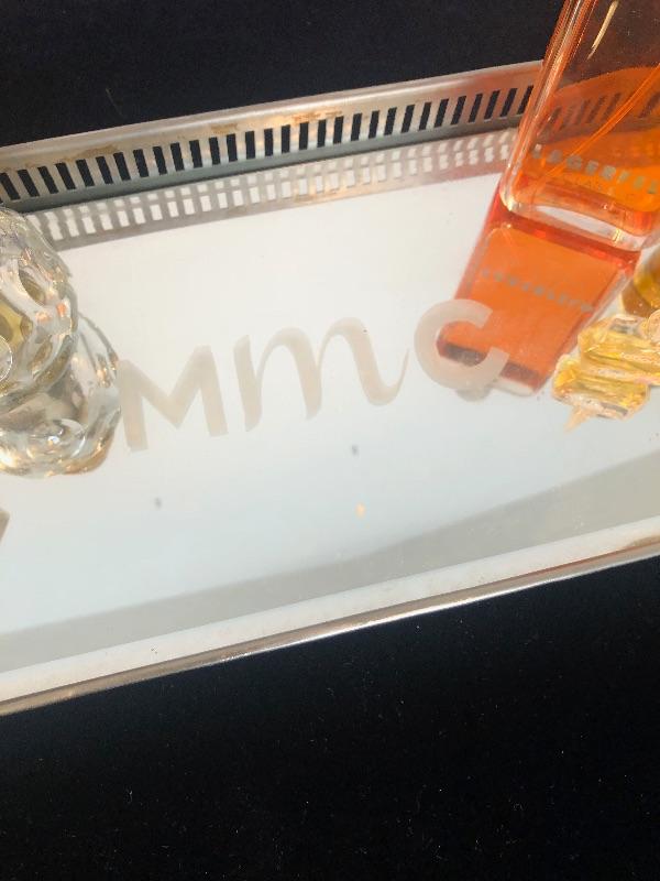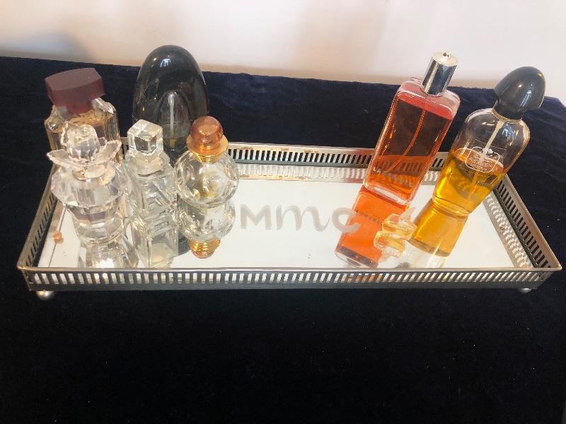 Tray is 18"x6.5"Initals on tray MMC various bottles of perfume some empty and re-fillable others vintage and used. This is an ONSITE Auction all items will need to be picked up on location. Please see auction description for pick up procedures. Shipping is available on smaller items.