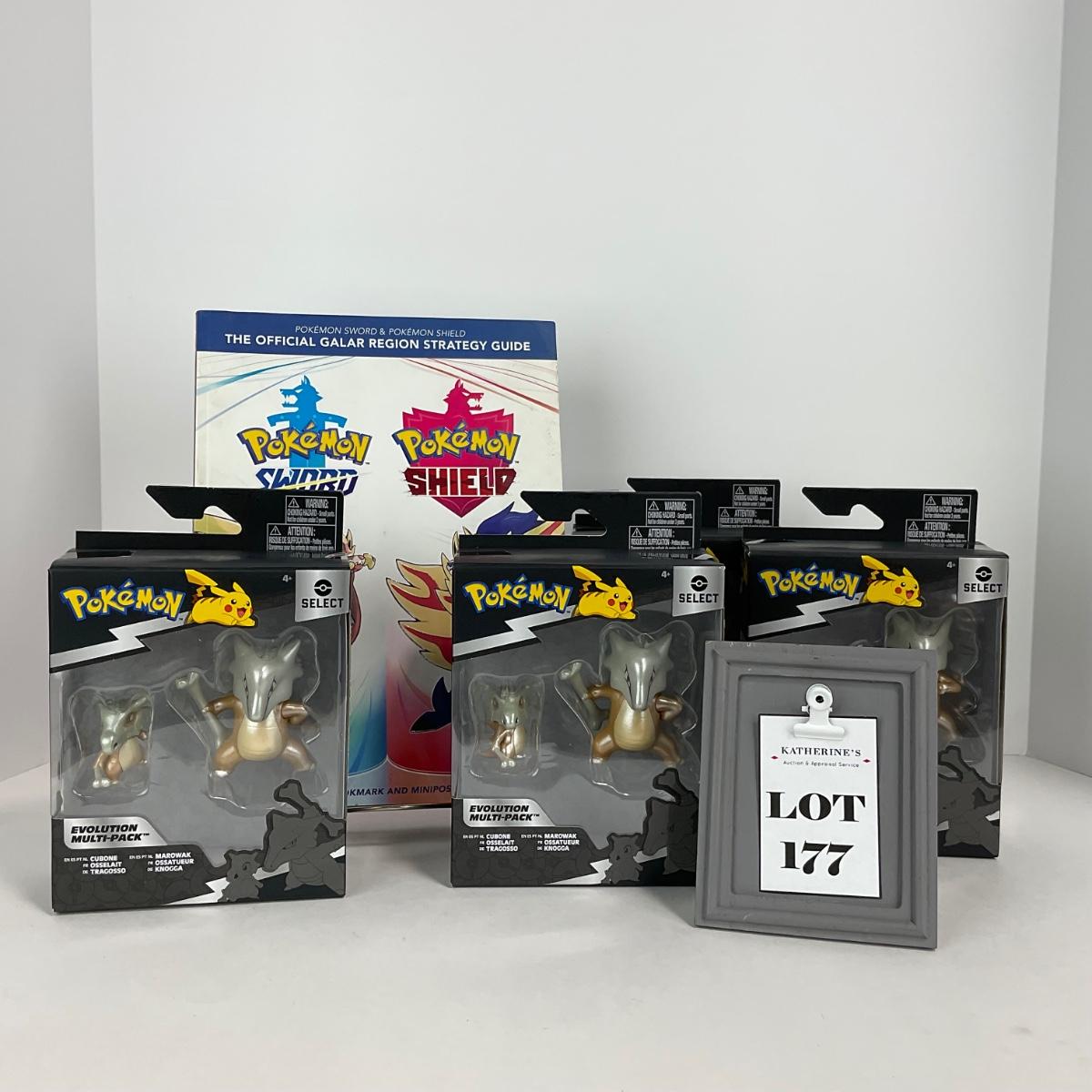 Four Pokémon cuebine figures new in box only one has some slight damage. And one Pokémon Sword and Shield book. The book does have what appears to be water damage and some page damage. Please see photos for details and condition. ::: Shipping is available on this lot. If you require shipping you must let us know at the close of the auction. We will coordinate with you after the item has been won. Shipping fees will include insurance up to or exceeding the value of all items being mailed. If you have any questions regarding this lot please contact the auctioneer either via this website, by direct email or by phone. PICK UP TIMES and other important information can be found in the TERMS and DESCRIPTION of the auction. Please take a look for pertinent information. Thanks!
