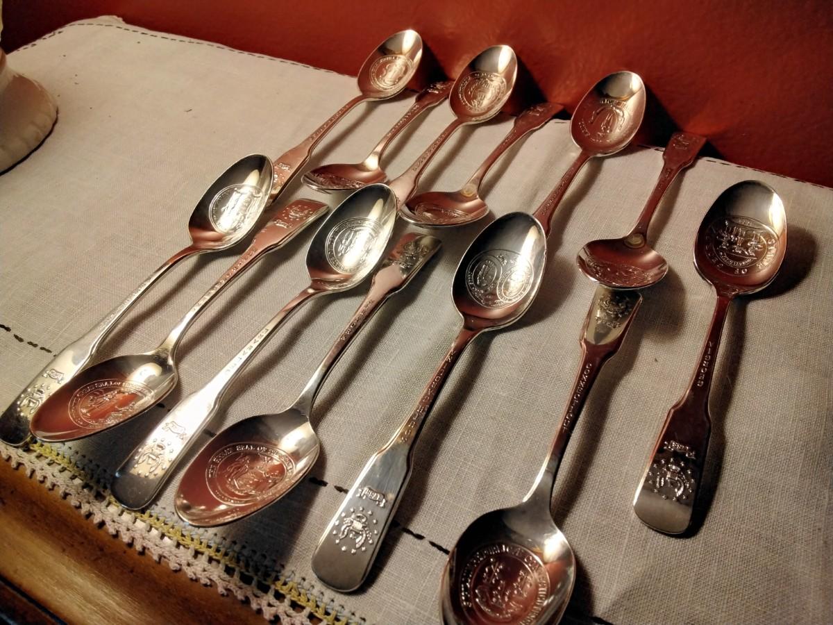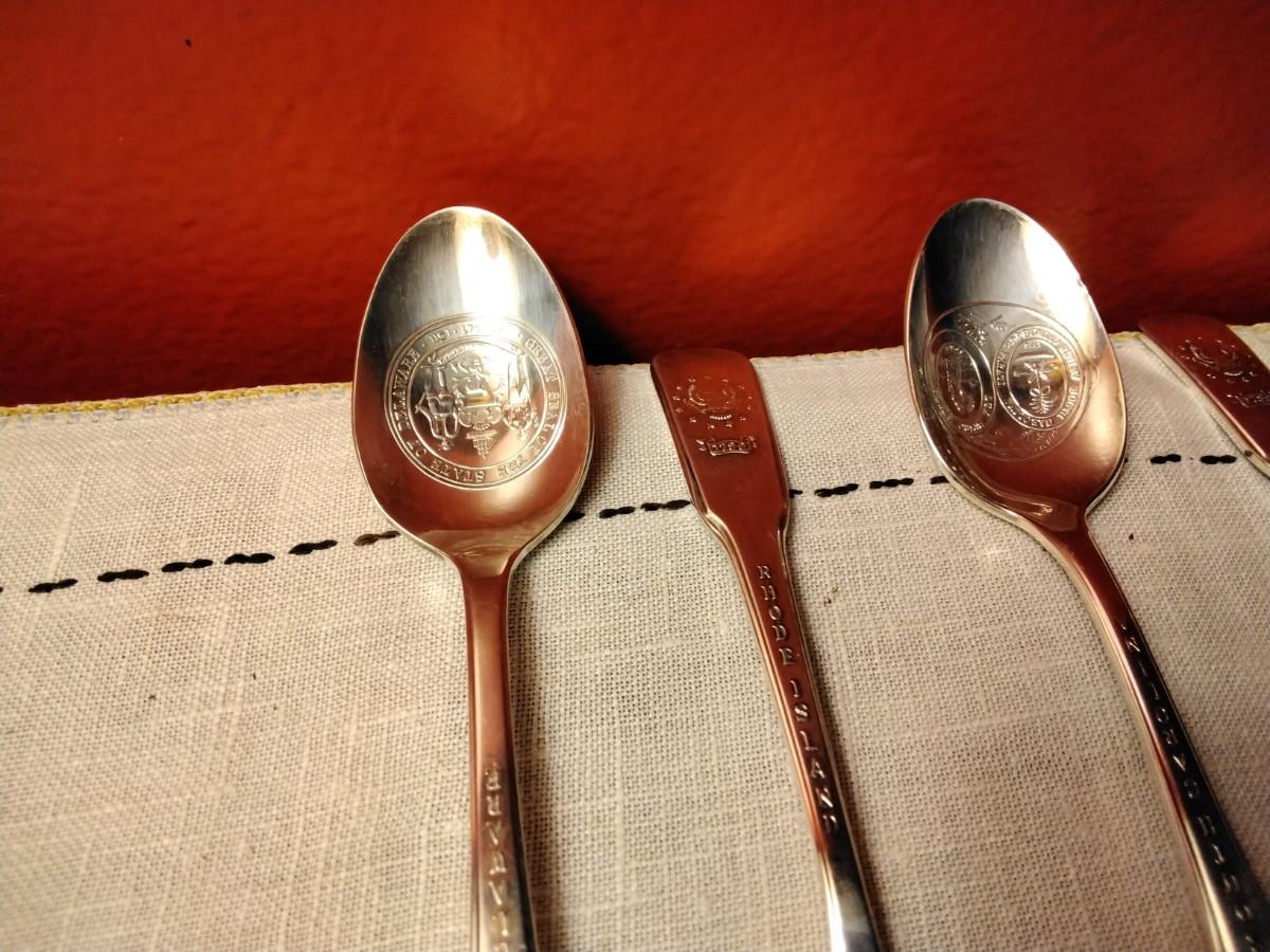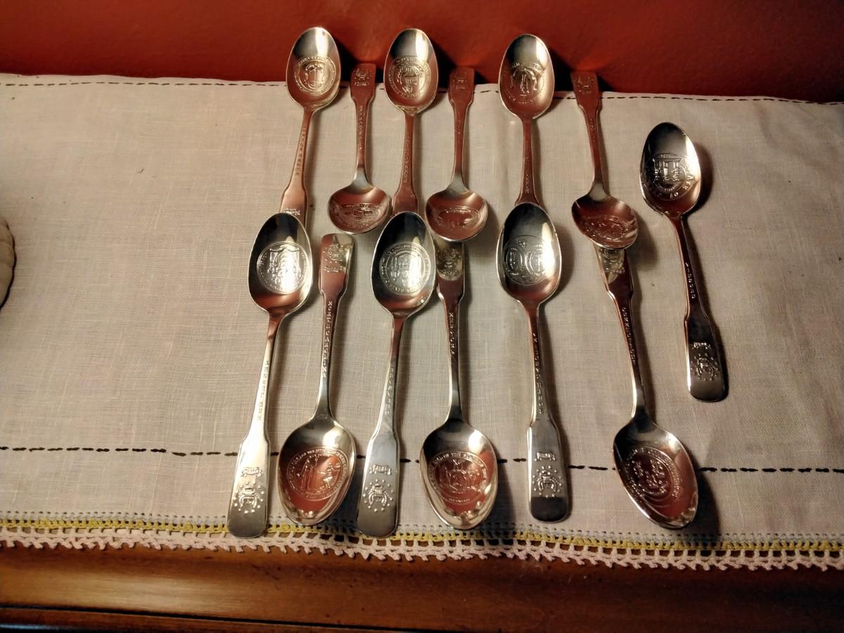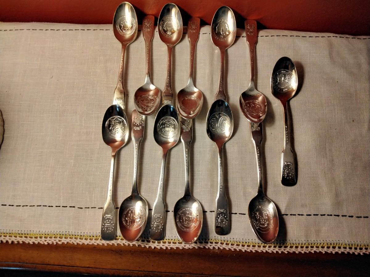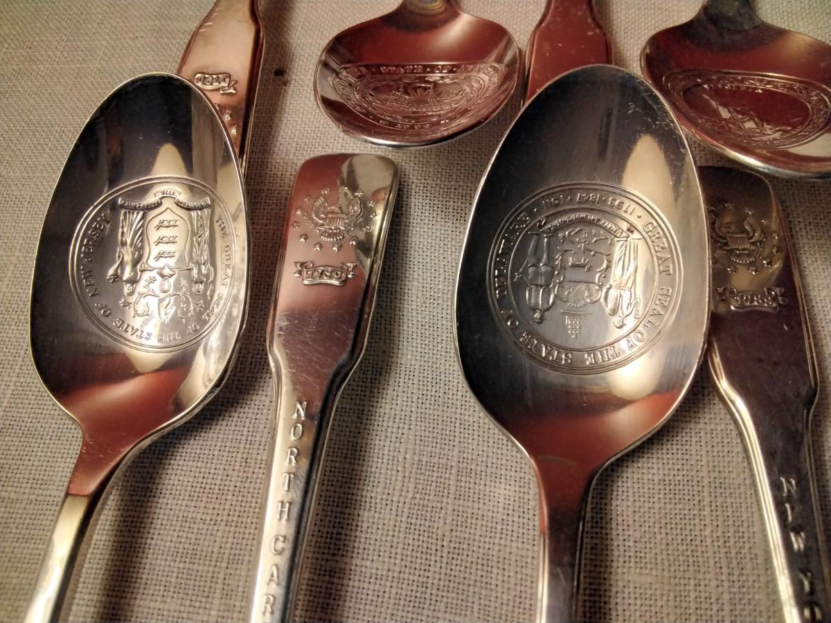 This is a Patriotic set of 13 United States colonie silver plate spoons. Each spoon features: state seal on spoon, state on the neck, when the state became a Colony on the head. The back of the head has a 13 star flag crossing the current flag. These were made in 1976 by international silver to commemorate the USA 200th anniversary. All the spoons are in great condition, recently polished.
