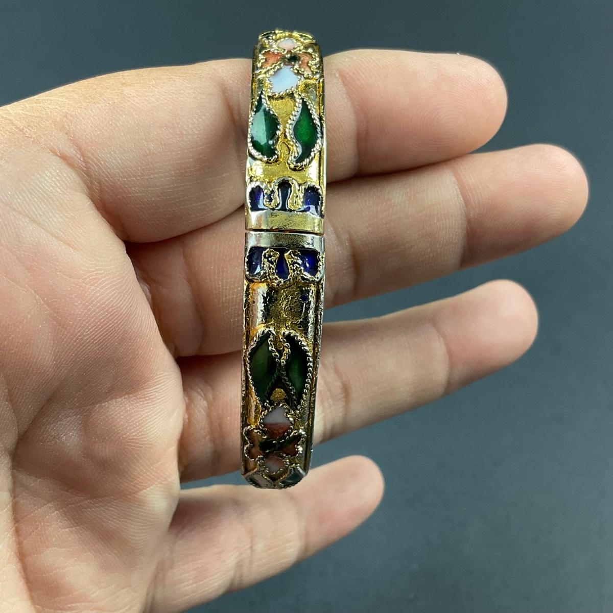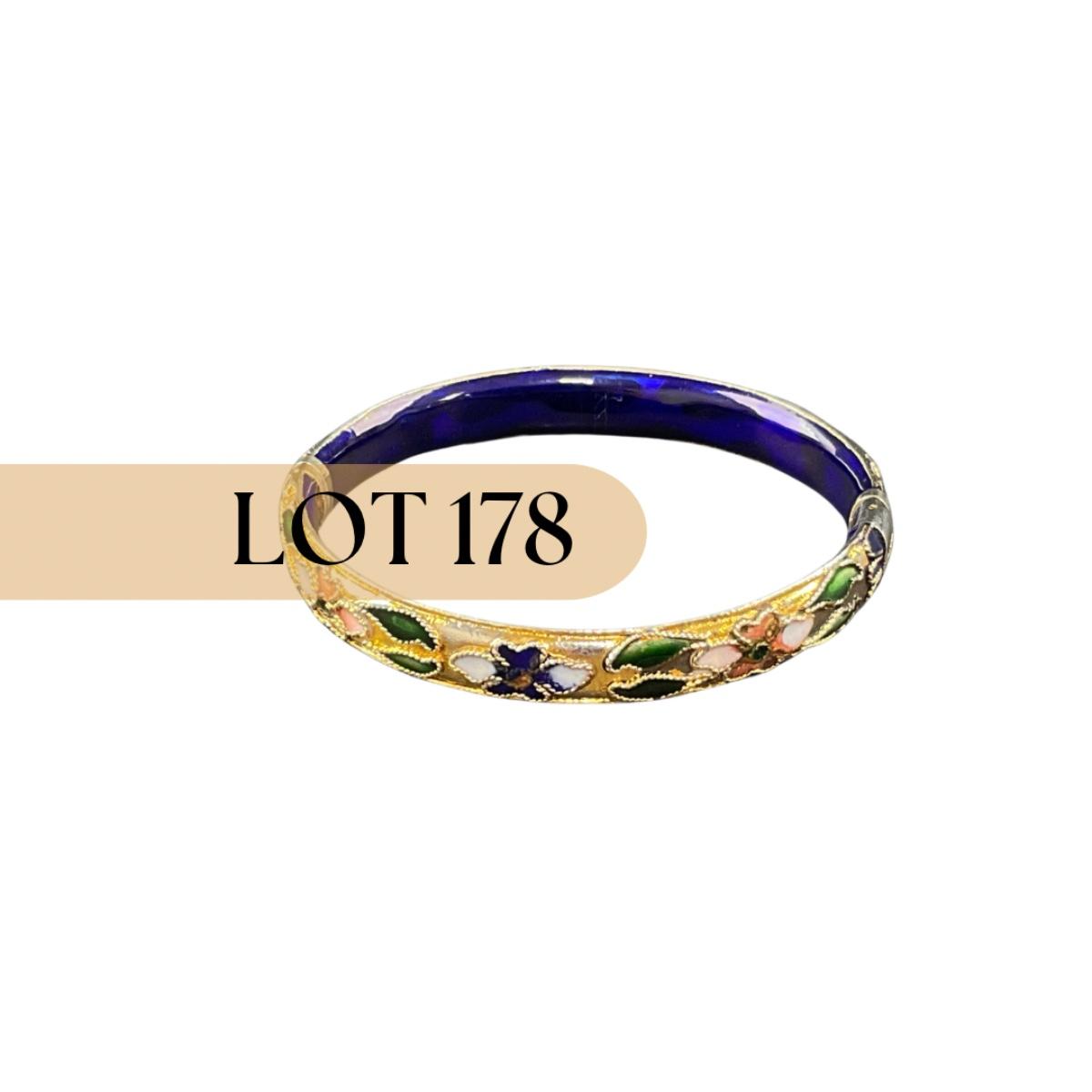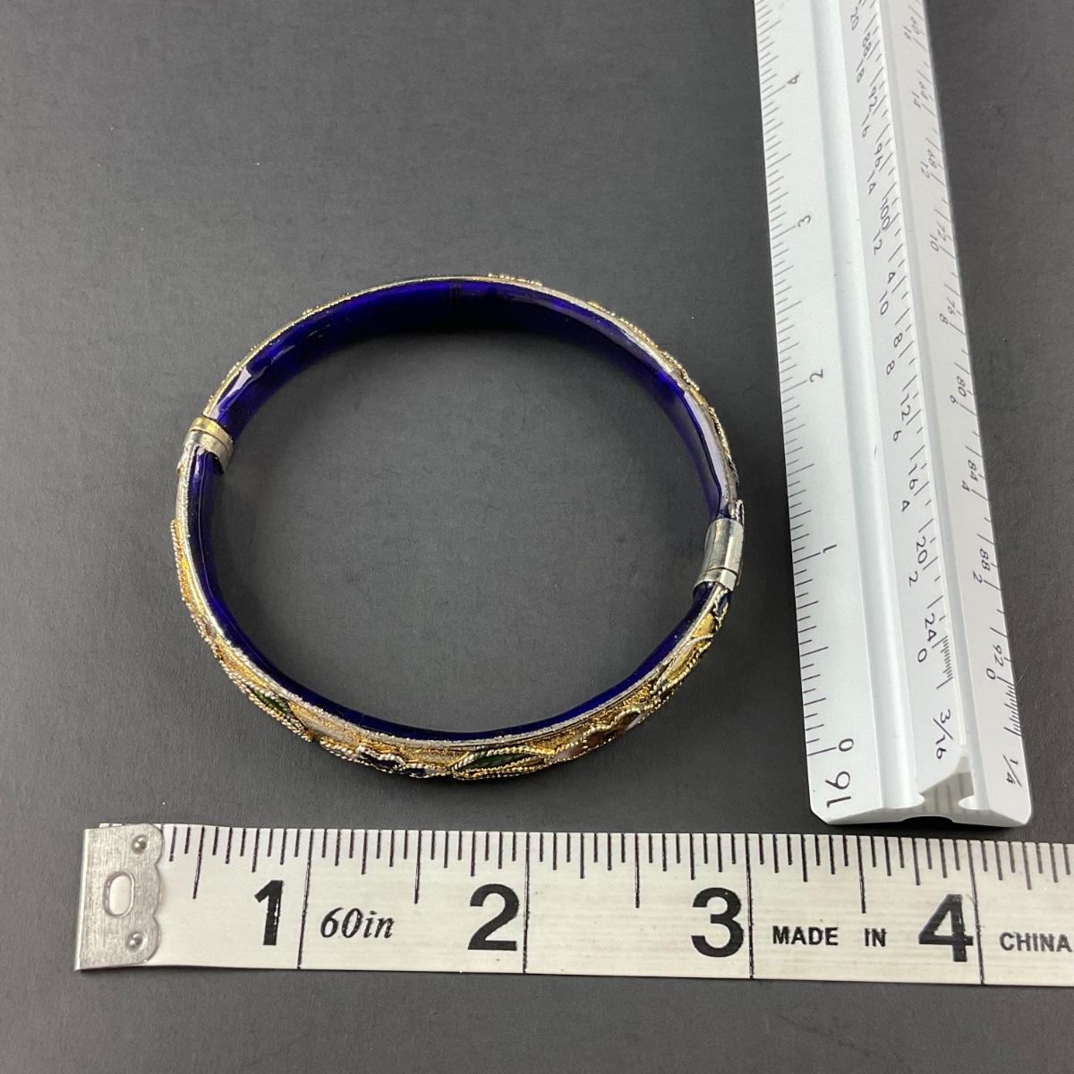 One vintage cloisonné blue and gold motif hinged bangle. This piece has no damage, and appears to be in great shape with no visable chips, cracks, or broken pieces. Please see photos for details and condition. Any condition statement is given as a courtesy to a client, is an opinion, and should not be treated as a statement of fact. Reference to condition written, oral or within a condition report shall not be regarded as a full account of condition and may not include all defects, alterations, or restorations. Absence of a condition report does not imply a lot is flawless or lacking imperfections or damage. Katherine’s Auction & Appraisal Service shall have no responsibility for any error or omission. Returns shall not be accepted on the basis of condition. ::: Shipping is available on this lot. If you require shipping you must let us know at the close of the auction. We will coordinate with you after the item has been won. Shipping fees will include insurance up to or exceeding the value of all items being mailed. If you have any questions regarding this lot please contact the auctioneer either via this website, by direct email or by phone. PICK UP TIMES and other important information can be found in the TERMS and DESCRIPTION of the auction. Please take a look for pertinent information. Thanks!