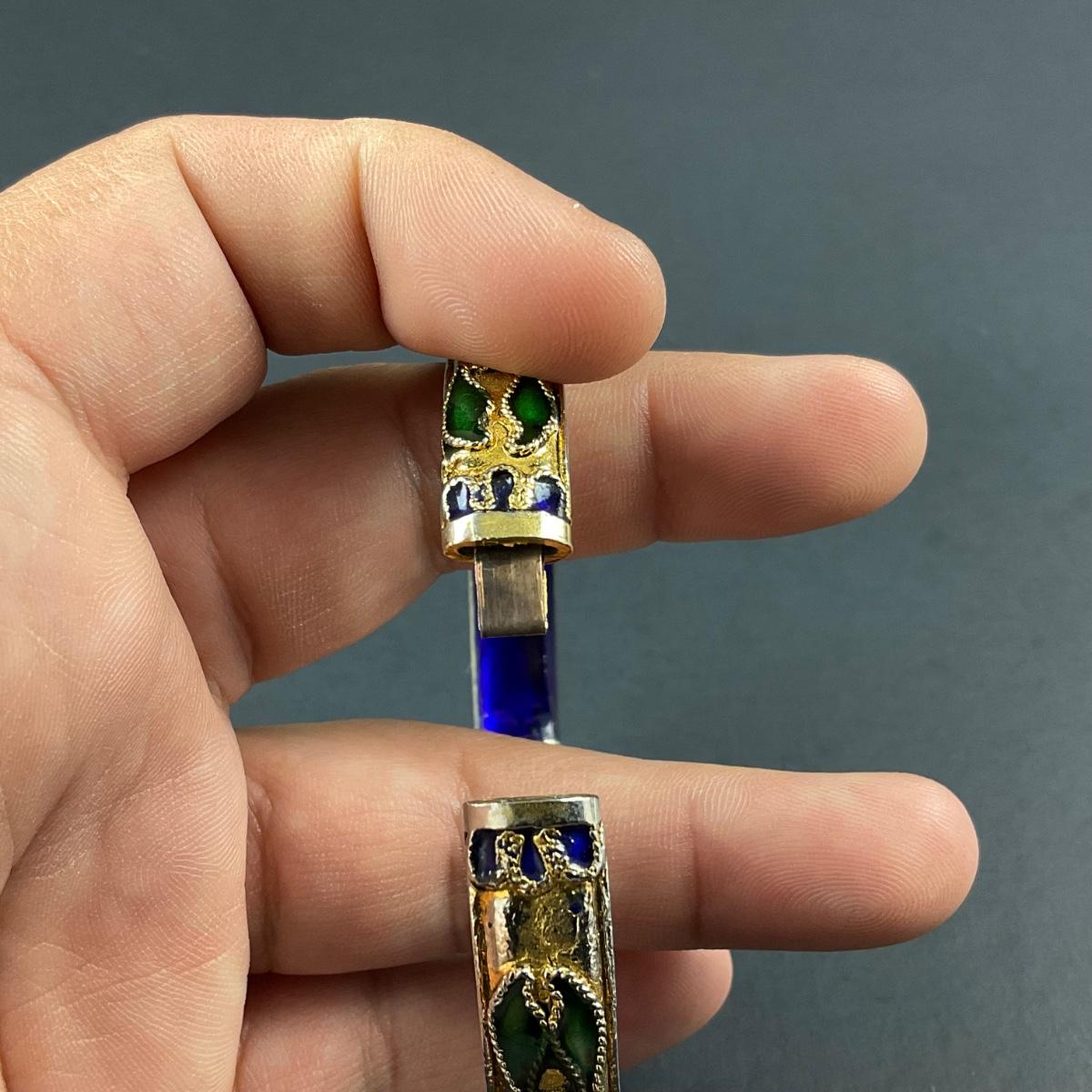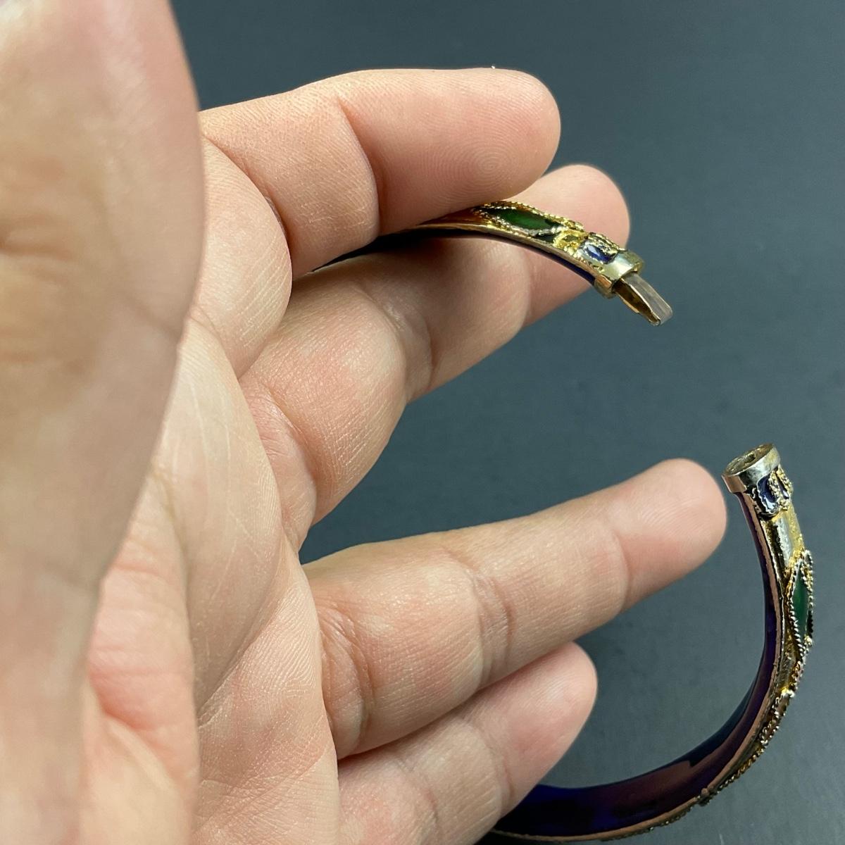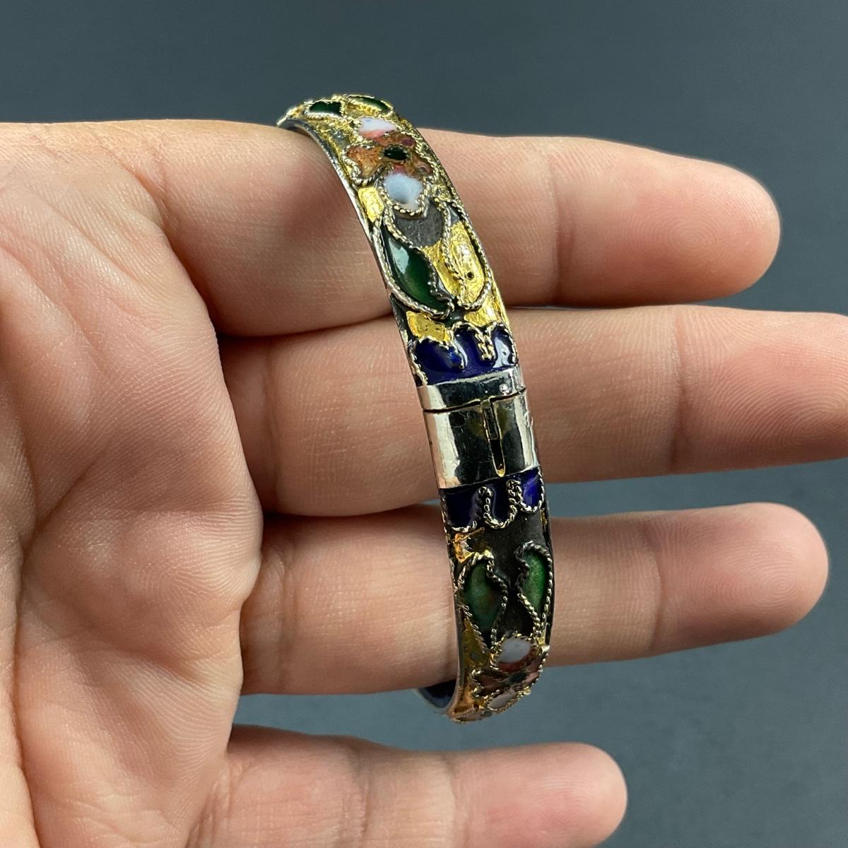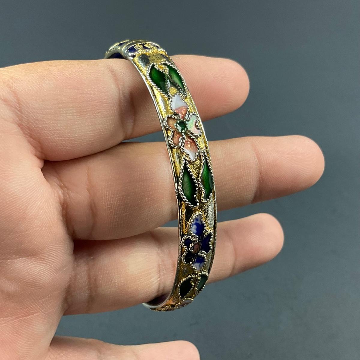 One vintage cloisonné blue and gold motif hinged bangle. This piece has no damage, and appears to be in great shape with no visable chips, cracks, or broken pieces. Please see photos for details and condition. Any condition statement is given as a courtesy to a client, is an opinion, and should not be treated as a statement of fact. Reference to condition written, oral or within a condition report shall not be regarded as a full account of condition and may not include all defects, alterations, or restorations. Absence of a condition report does not imply a lot is flawless or lacking imperfections or damage. Katherine’s Auction & Appraisal Service shall have no responsibility for any error or omission. Returns shall not be accepted on the basis of condition. ::: Shipping is available on this lot. If you require shipping you must let us know at the close of the auction. We will coordinate with you after the item has been won. Shipping fees will include insurance up to or exceeding the value of all items being mailed. If you have any questions regarding this lot please contact the auctioneer either via this website, by direct email or by phone. PICK UP TIMES and other important information can be found in the TERMS and DESCRIPTION of the auction. Please take a look for pertinent information. Thanks!