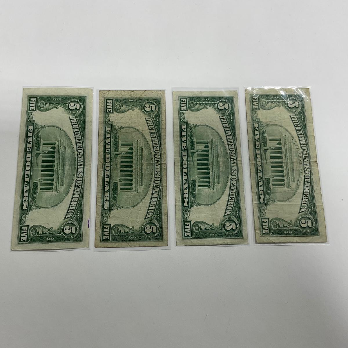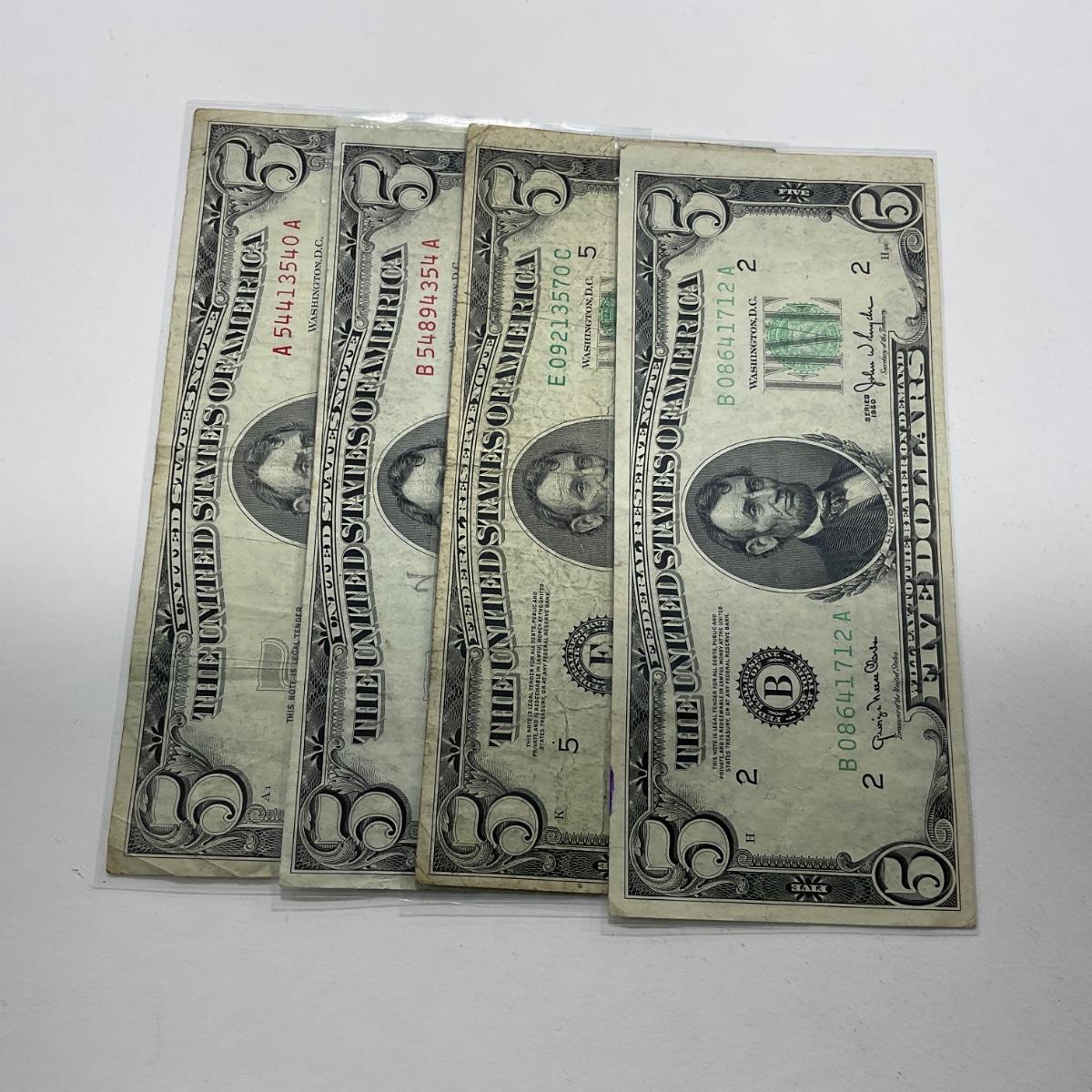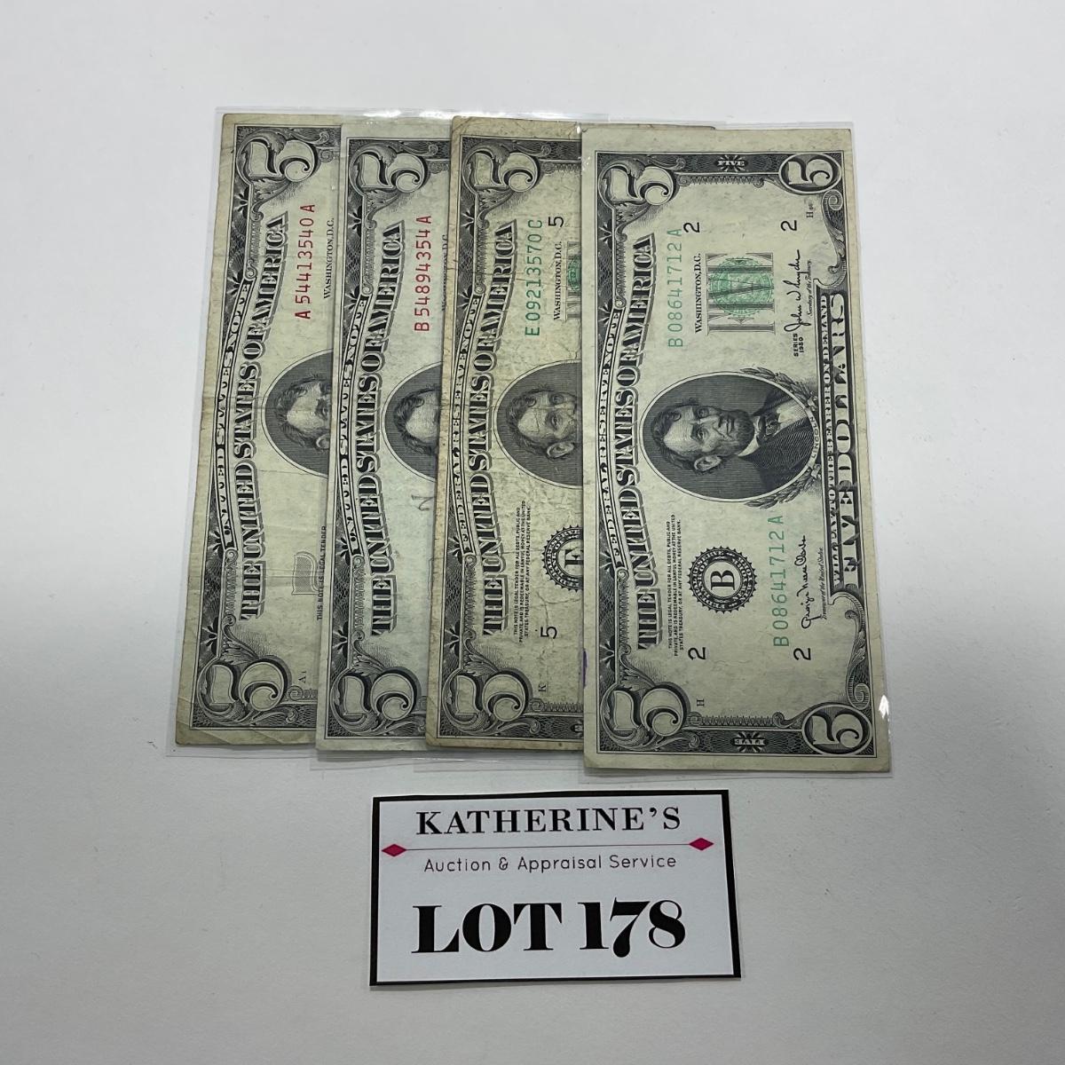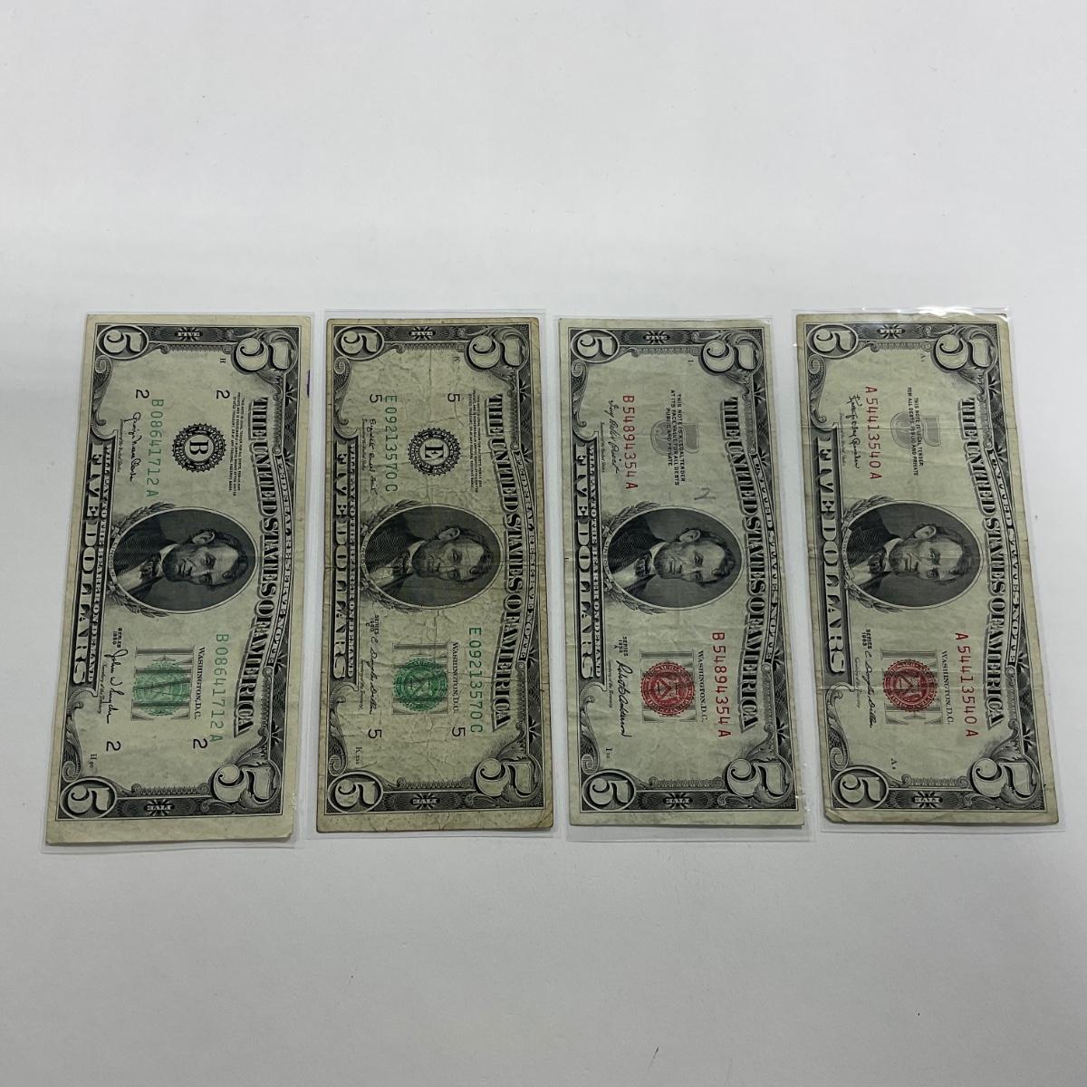 Four five dollar federal reserve notes 1950, 1950c Red Seal 1953A, 1963 circulated condition. Please see photos for details and condition. ::: Shipping is available on this lot. If you require shipping you must let us know at the close of the auction. We will coordinate with you after the item has been won. Shipping fees will include insurance up to or exceeding the value of all items being mailed. If you have any questions regarding this lot please contact the auctioneer either via this website, by direct email or by phone. PICK UP TIMES and other important information can be found in the TERMS and DESCRIPTION of the auction. Please take a look for pertinent information. Thanks!