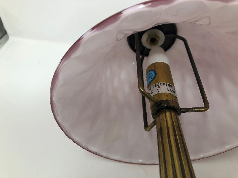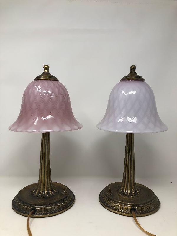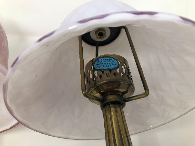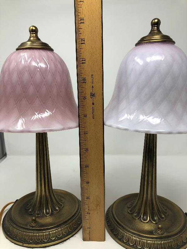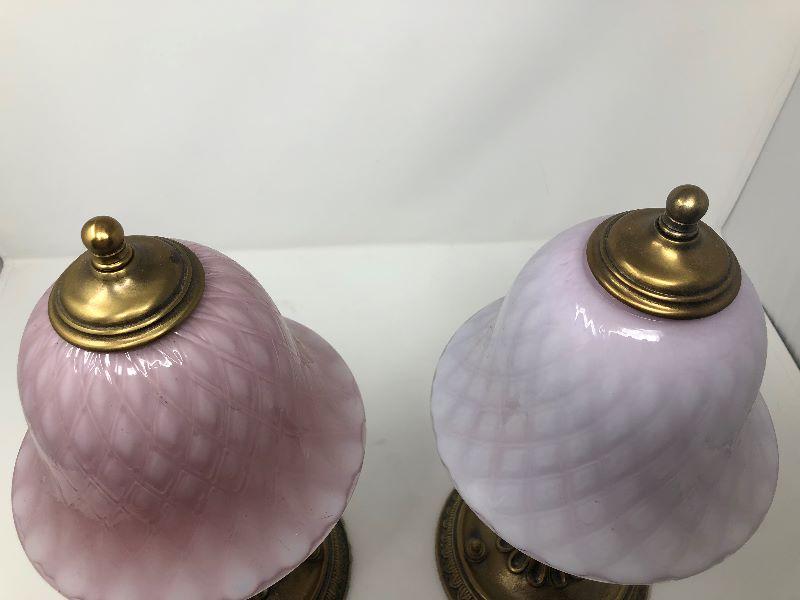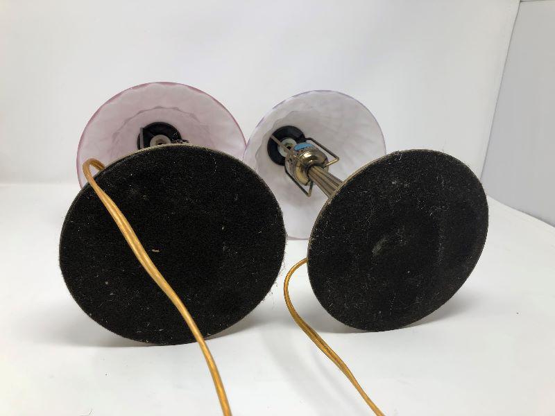 Set of 2 small metal lamps with glass shades. One shade is lighter pink and the other is a bit darker pink. Measurements show in pictures.