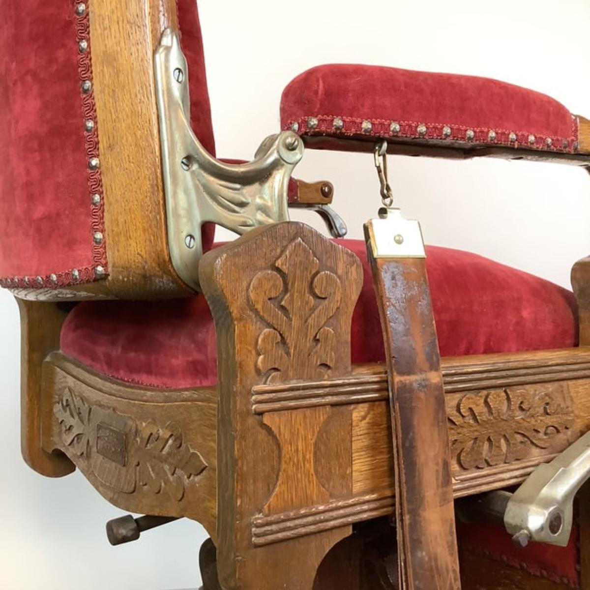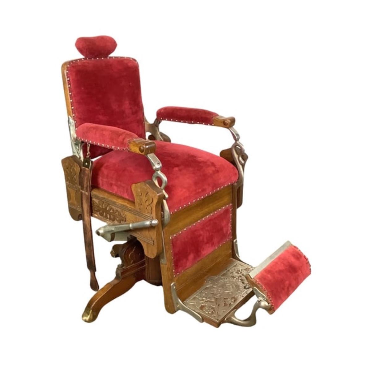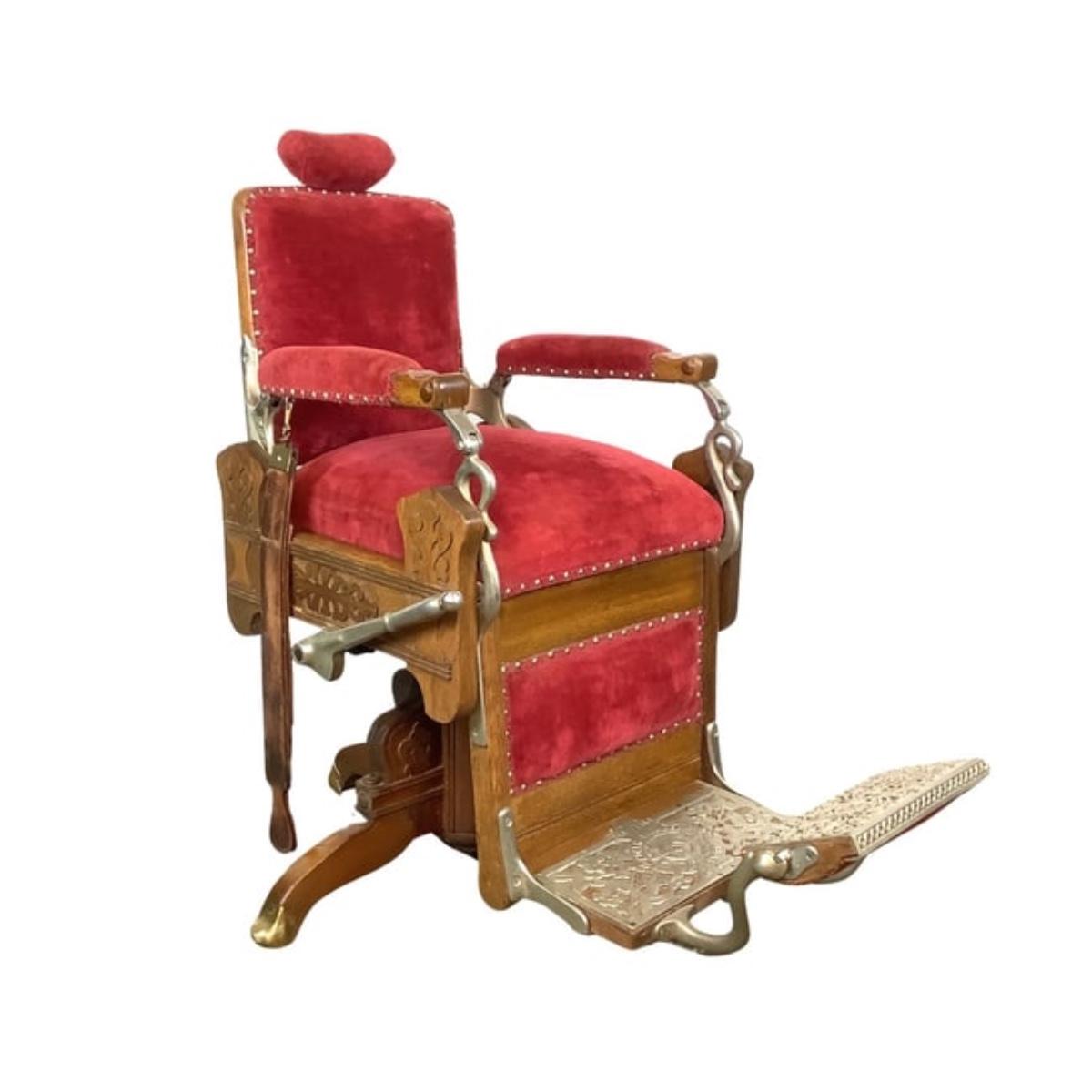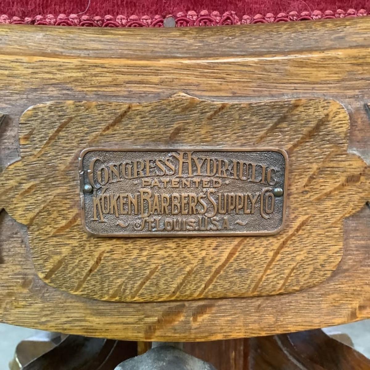 "Congress Hydraulic Patented Koken Barbors Supply Co. St. Louis, USA"Adjustable headrest. Has golden finish, nickel plated trim and leather blade sharpener with quarter sewn oak Measures: 46" high x 22.5" wide (adjustable height)