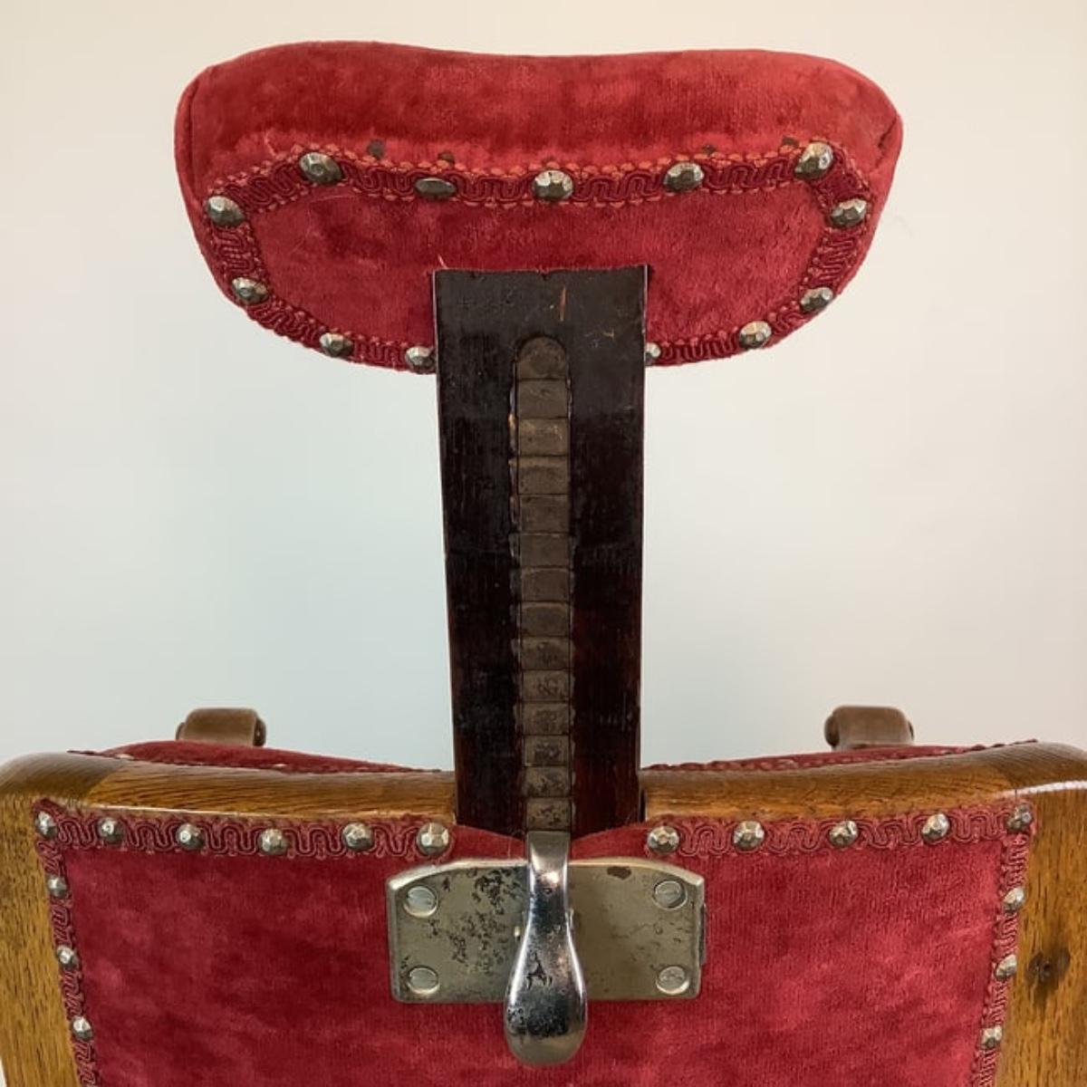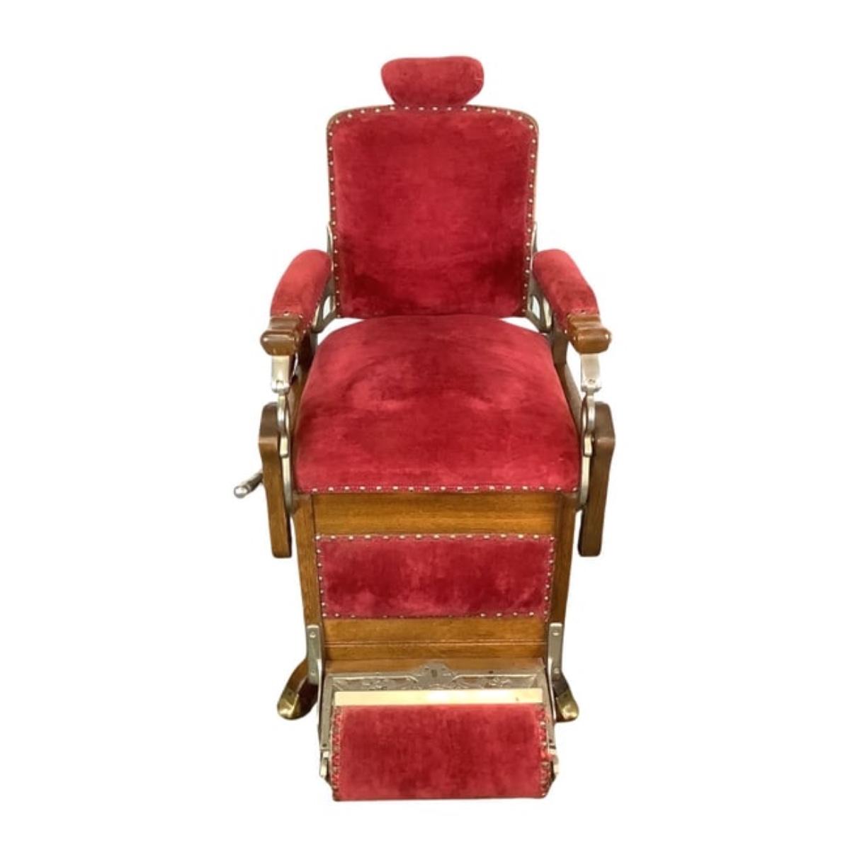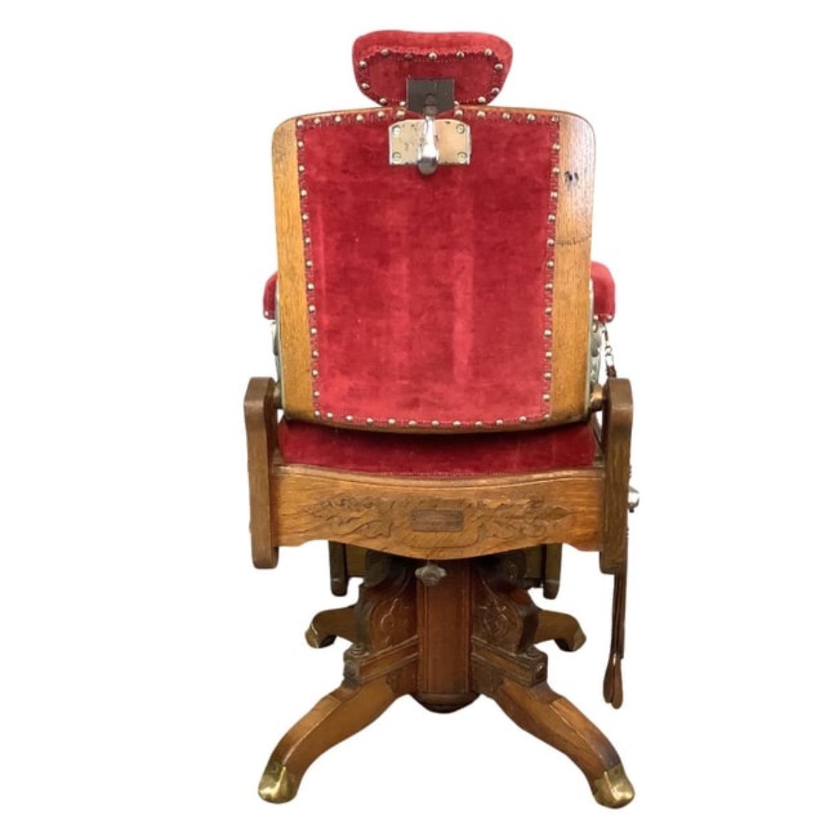 "Congress Hydraulic Patented Koken Barbors Supply Co. St. Louis, USA"Adjustable headrest. Has golden finish, nickel plated trim and leather blade sharpener with quarter sewn oak Measures: 46" high x 22.5" wide (adjustable height)