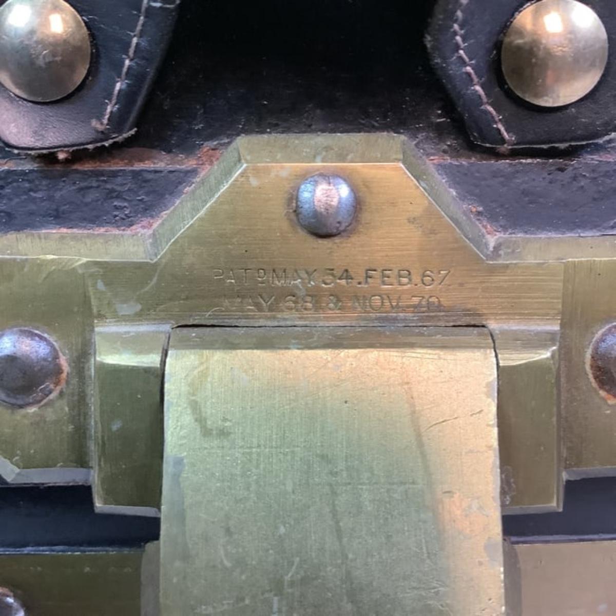 Has brass key lock, front leather strap is torn