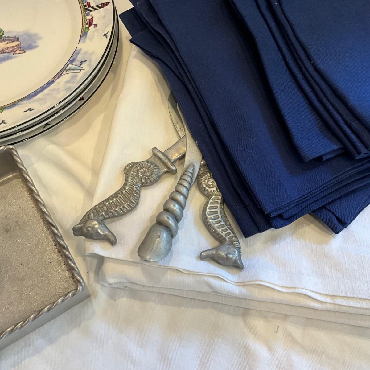 179 Lighthouse Dinner Plates, Mariposa Napkin Holder, 3 Glass Pitchers, Tablecloths & Napkins