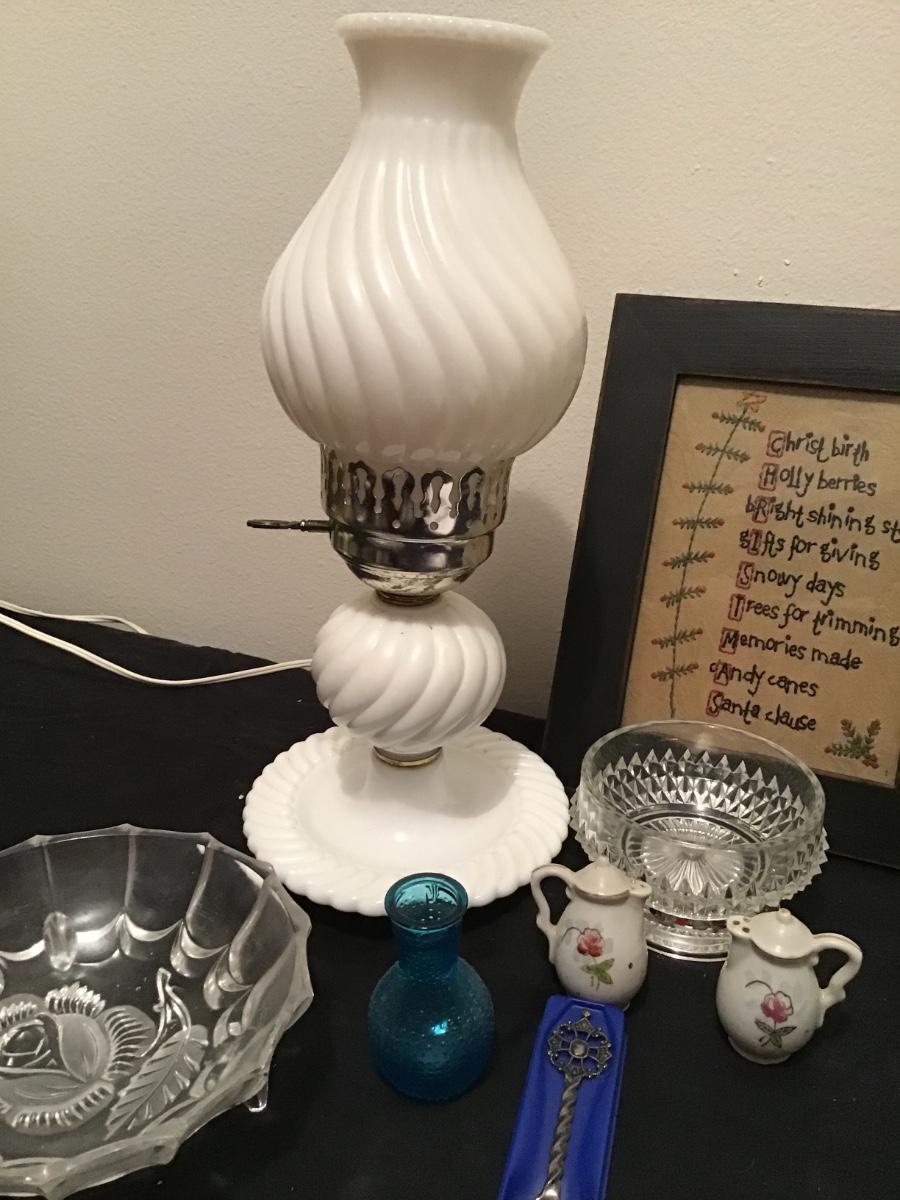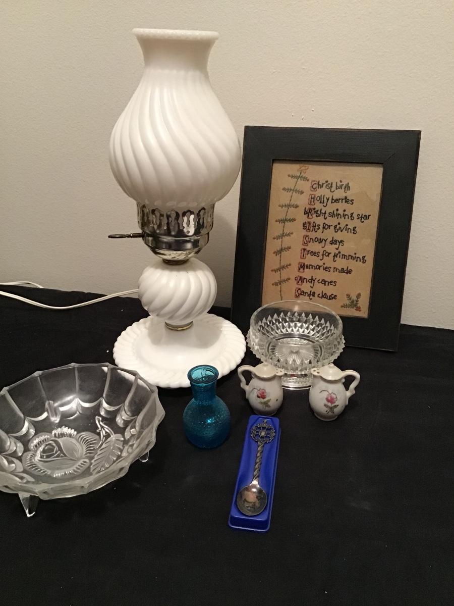 179 - Milk Glass Lamp, Vtg Picture & Porcelain items