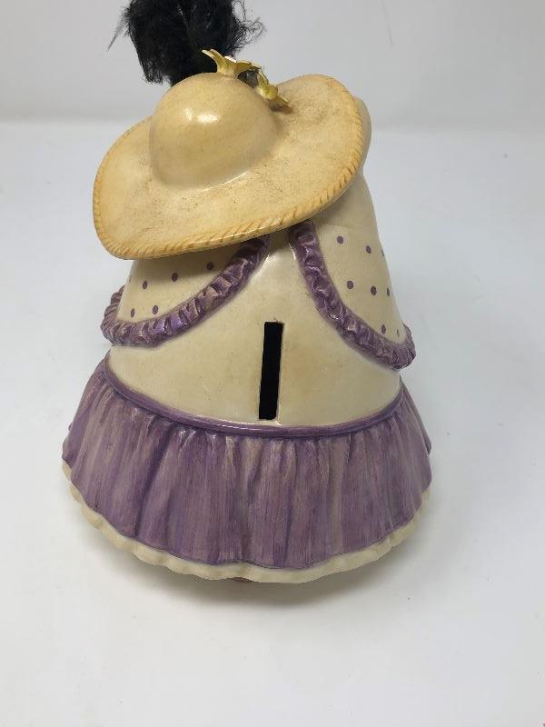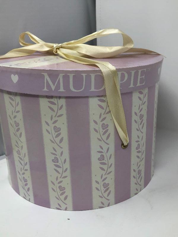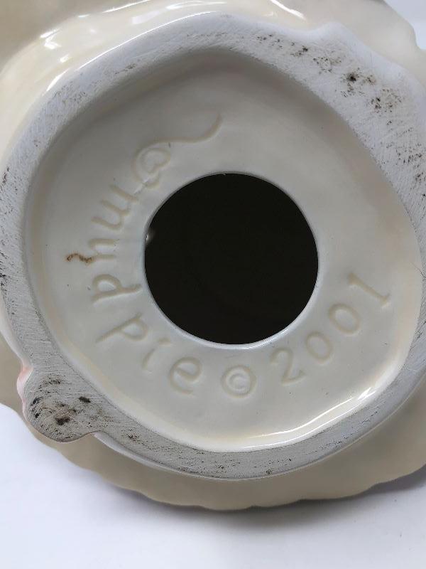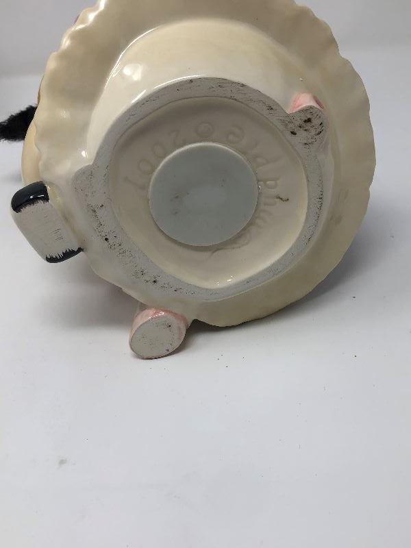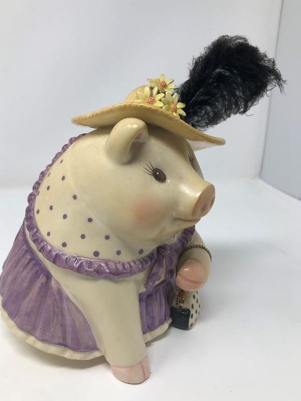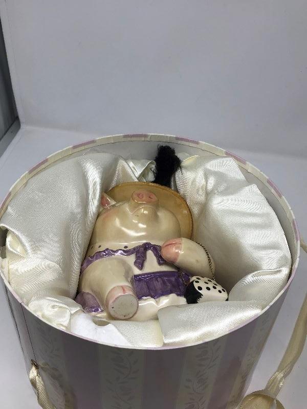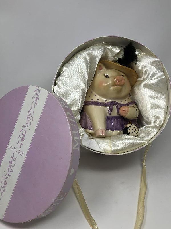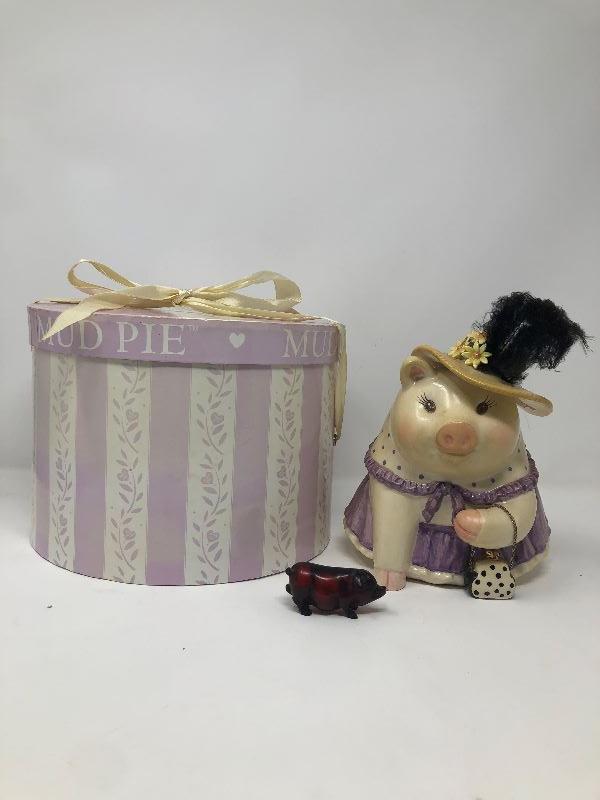 Old glass piggy bank (Mud Pie 2001) still in it's original decorative box, and a small glass piggy. Small hcip on piggy's flower shown in picture. Measurements shown in pictures.