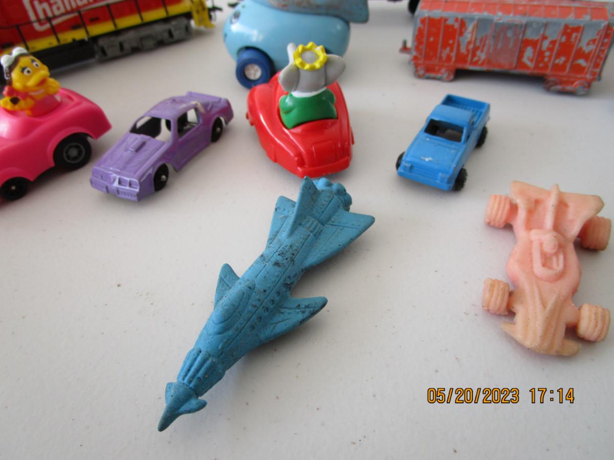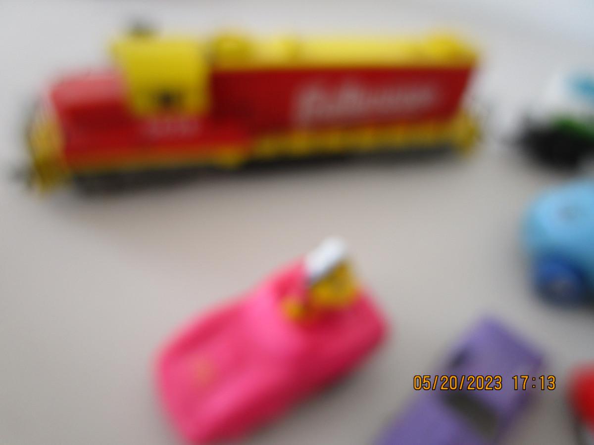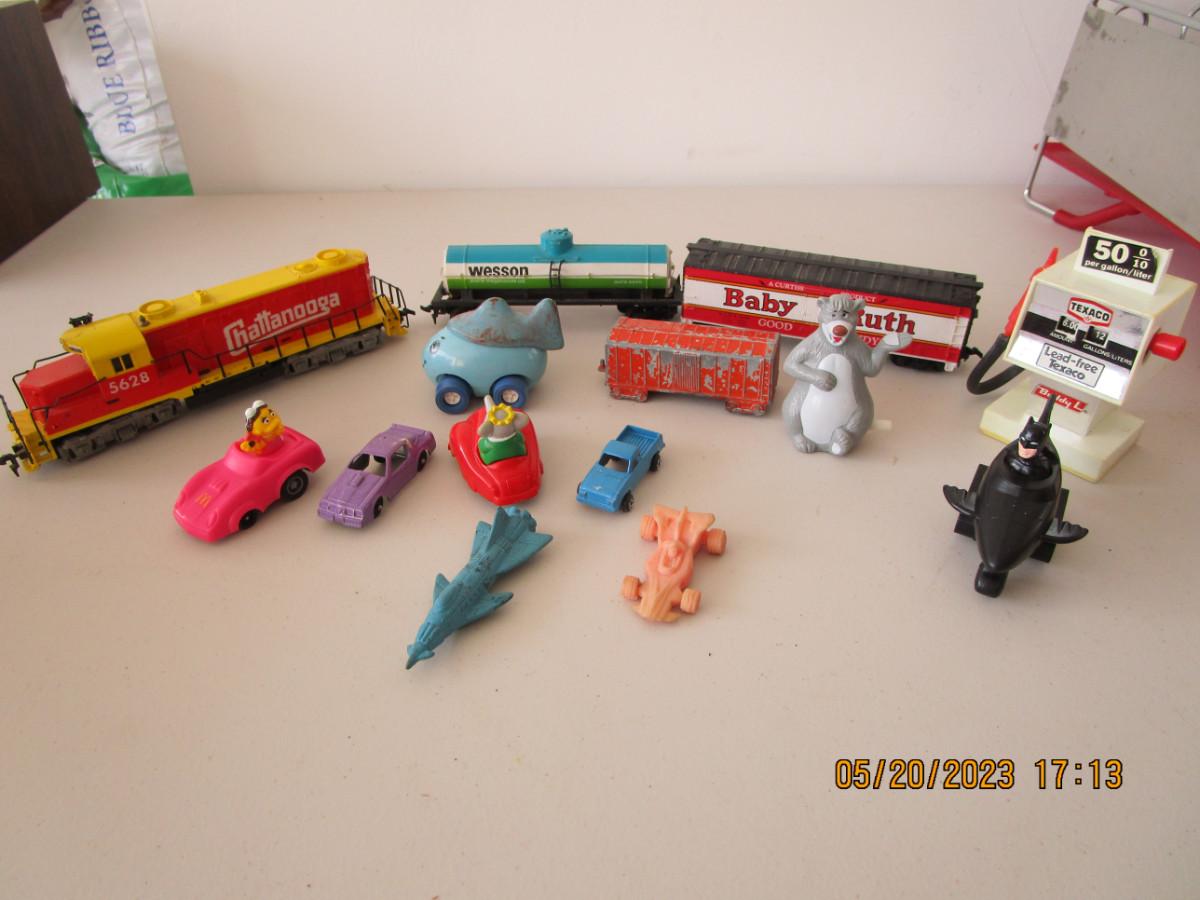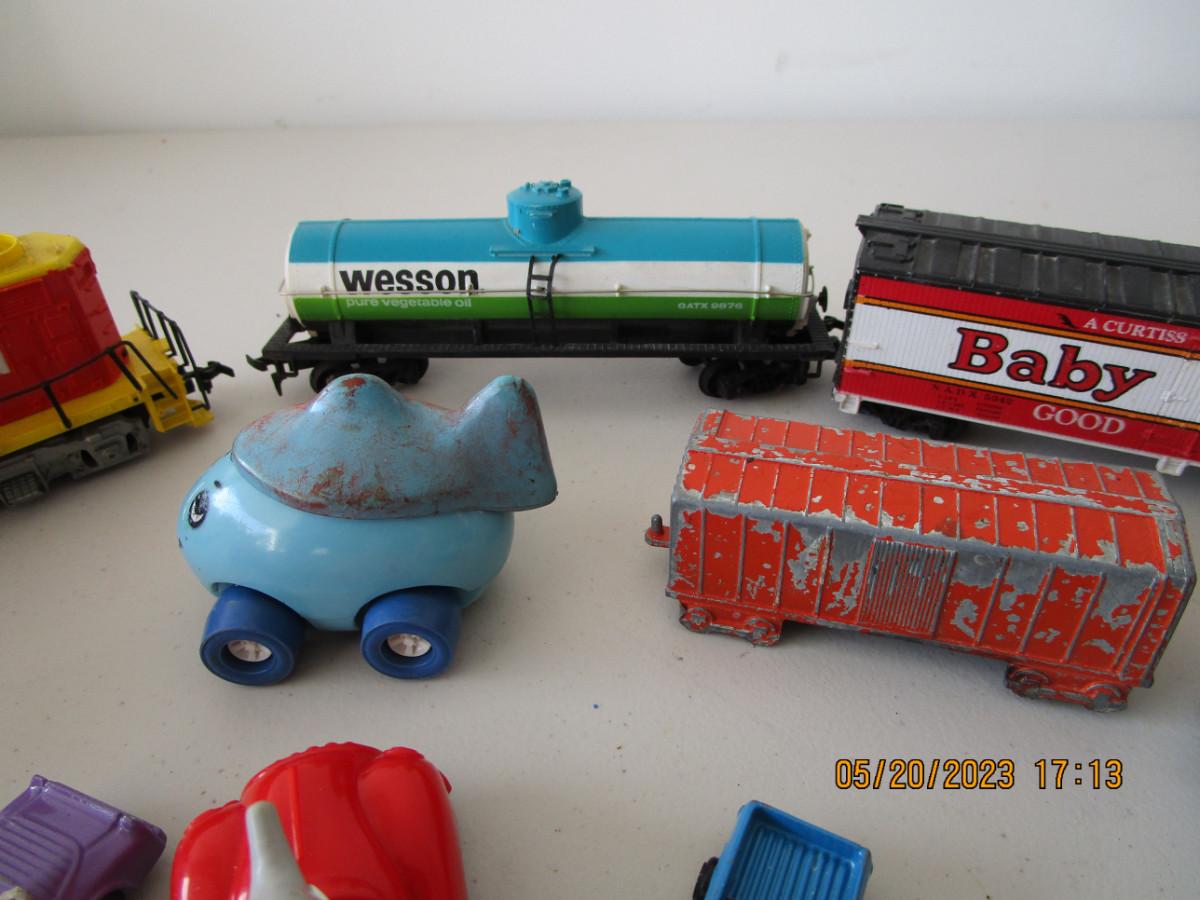 3 HO train cars and misc. cars