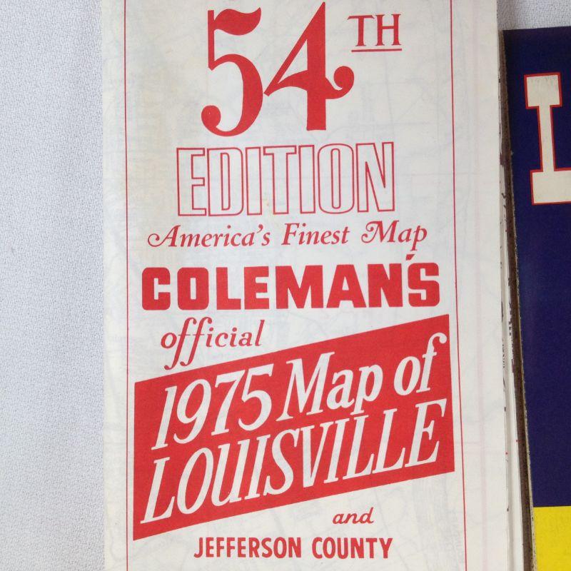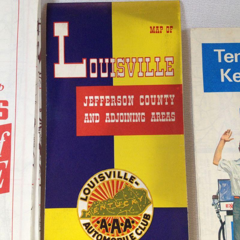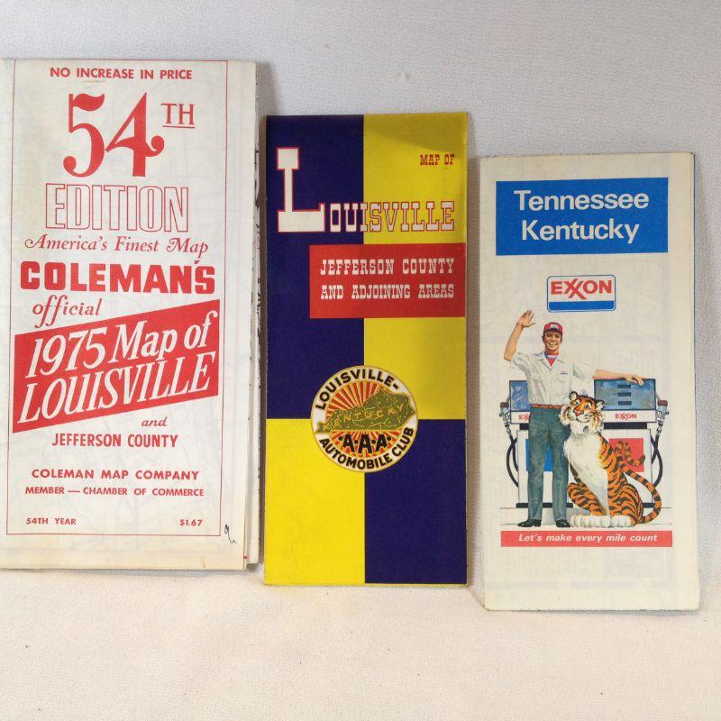 This lot is a collection of 3 Kentucky Maps. One is a 1975 Coleman's Official Map of Louisville - it appears to be in good, but used condition. The second is a 1962 edition of the Map of Louisville, Jefferson County and Adjoining Areas published by the Louisville AAA Automobile Club and the third is a 1977 Edition Exxon Tennessee Kentucky Map in nice condition.