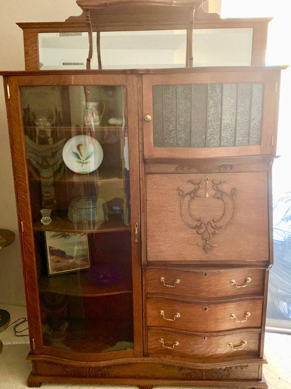 #18  ANTIQUE LARGE DROP FRONT OAK SECRETARY CURVED GLASS DOOR ELEVATED TOP SHELF
