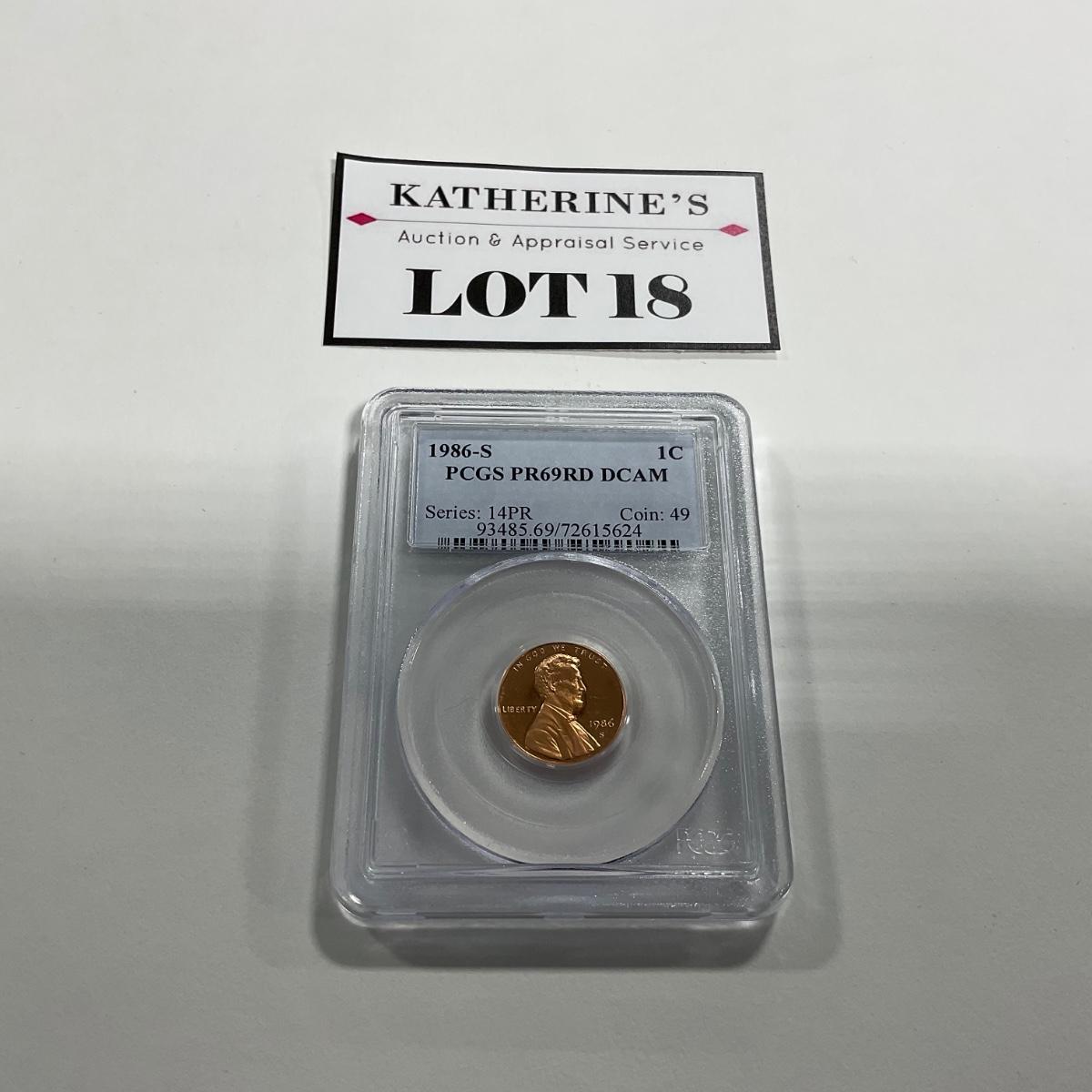 One 1986-S Lincoln cent PCGS PR69RD DCAM graded coin. Please see photos for details and condition. ::: Shipping is available on this lot. If you require shipping you must let us know at the close of the auction. We will coordinate with you after the item has been won. Shipping fees will include insurance up to or exceeding the value of all items being mailed. If you have any questions regarding this lot please contact the auctioneer either via this website, by direct email or by phone. PICK UP TIMES and other important information can be found in the TERMS and DESCRIPTION of the auction. Please take a look for pertinent information. Thanks!