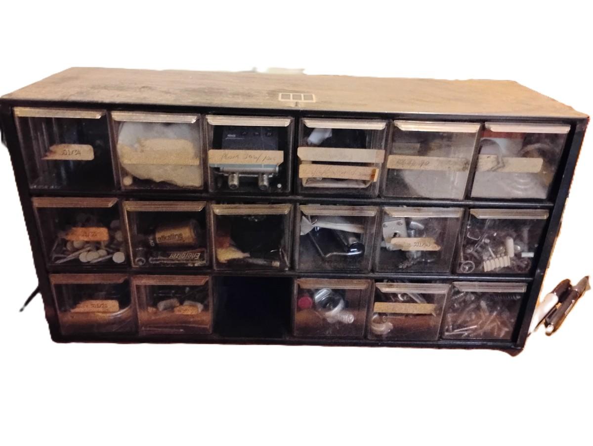 18 drawer small parts storage, only has 17 drawers, most are filled with odds and ends. 18"x9"