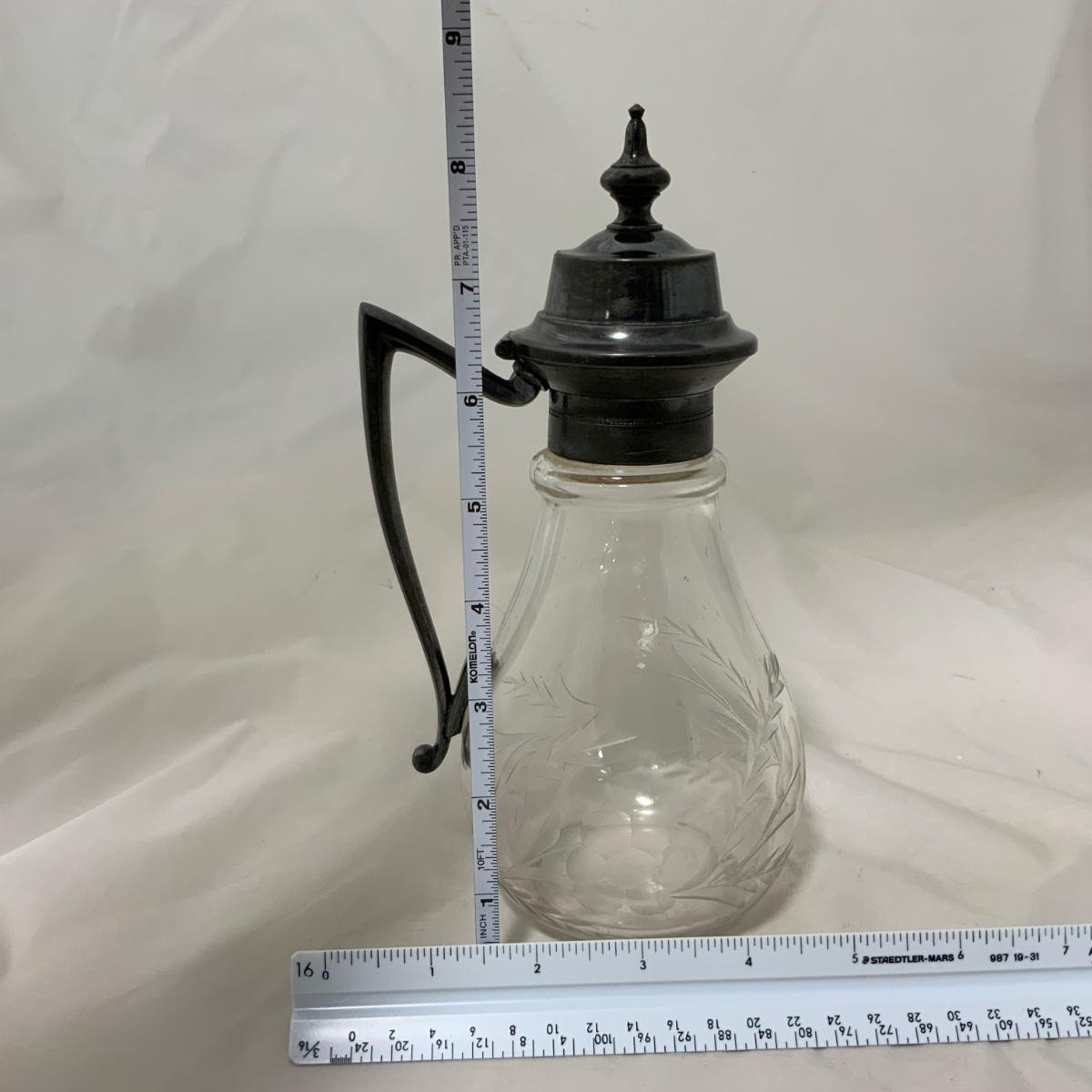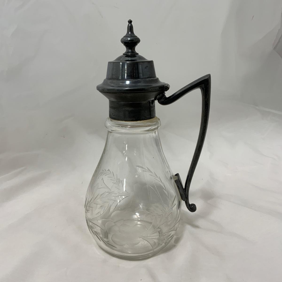 Elegant Etched Glass Silver Plated Syrup, all original, circa 1880. A nice piece to add to your collection or use for a fancy brunch. Please see photos for details and condition. ::: Shipping is available on this lot. If you require shipping you must let us know at the close of the auction. We will coordinate with you after the item has been won. Shipping fees will include insurance up to or exceeding the value of all items being mailed. If you have any questions regarding this lot please contact the auctioneer either via this website, by direct email or by phone. PICK UP TIMES and other important information can be found in the TERMS and DESCRIPTION of the auction. Please take a look for pertinent information. Thanks!